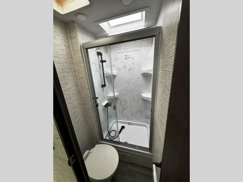 Relax inside while sitting on the sofa, at the booth dinette or on the swivel captains chairs while enjoying the fireplace and 50" TV, or unwind outside under the 18' electric awning while watching the exterior TV. After shopping in town or hiking the trails you can get cleaned up in the private toilet and shower room then brush your teeth in the bathroom sink a few steps outside the door. The private bedroom includes a space saving sliding door, a unique rear queen bed slide, plus storage. The cook will enjoy making meals using the residential-size microwave and Furrion all-in-one cooktop and oven, then storing leftovers in the 8 cu. ft. refrigerator. And the L-shaped counter with sink will come in handy.