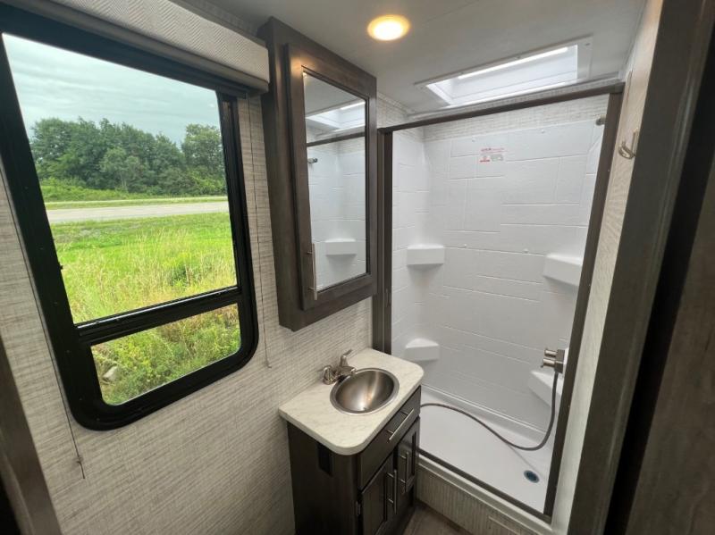 Make your trips complete in this coach that can sleep four to five each night. There is a cab-over bunk with a 750 lb. capacity for guests and an RV queen bed slide out in the rear corner bedroom. The booth dinette can be used to dine at, play games, and even sleep an additional guest or two little ones. A two burner cooktop comes standard in the kitchen, along with a convection microwave, a stainless steel sink, and a 10 cu. ft. refrigerator. You will also appreciate having a full bath on board, and the 13' electric awning outside will provide a place to relax with a cold drink!