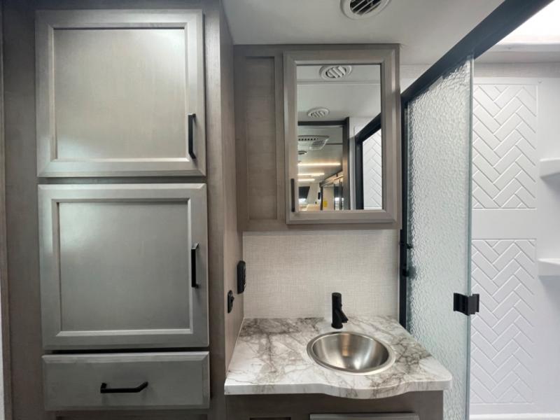 With any Altitude Class C gas motorhome by Fleetwood RV, you will enjoy unrivaled performance, unbeatable storage, and luxury at every turn! You will love the journey just as much as the destination with reclining back captain's chairs and side view cameras, plus there is a Ford 7.3L V8 engine for power you can feel. Each model features painted steel frame construction with a Powerlock System ll that interlocks the walls to the roof for added durability, along with Vacu-Bond aluminum framed sidewalls, roof, and floor. Outside, you'll find automatic hydraulic leveling jacks, patio lighting, slam latch luggage door handles, and a Winegard Air 360+ that will allow you to stay connected as you travel. Head inside to find Surf-X countertops, slide out fascia with coordinating interior wood color, hidden hinge cabinet doors, kitchen backsplash, and many more comforts!