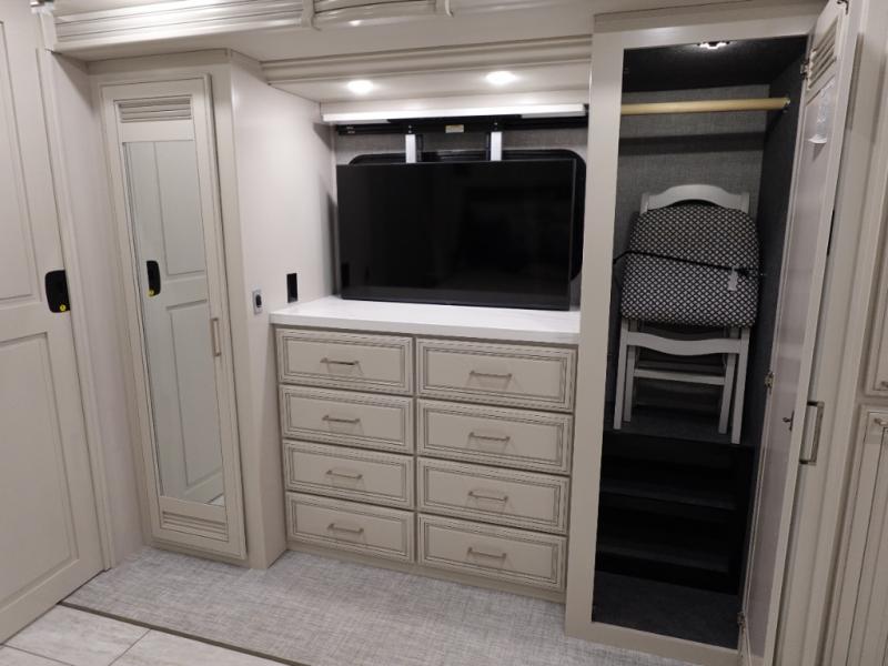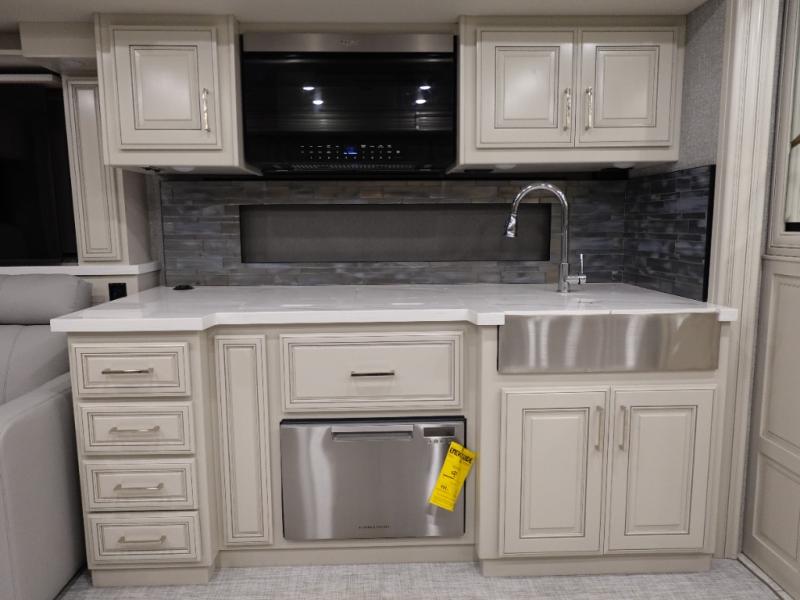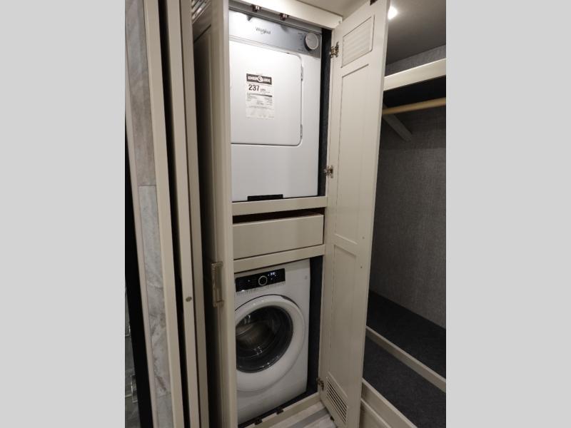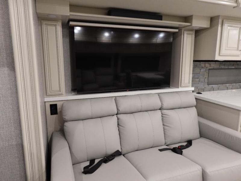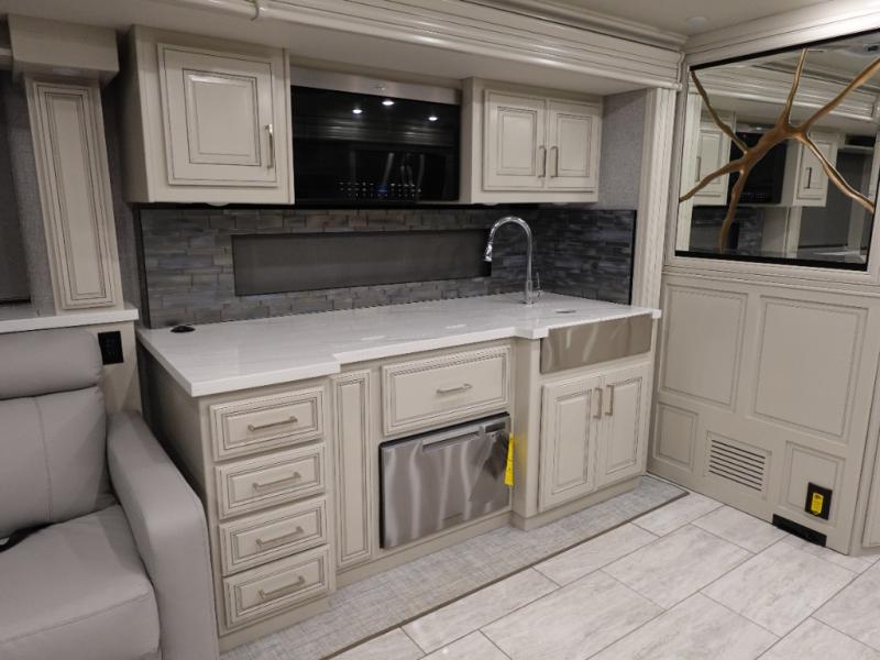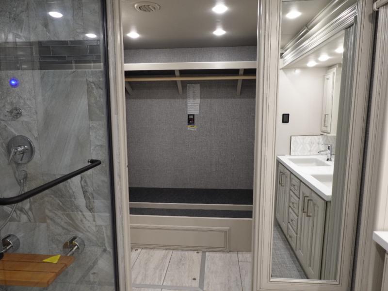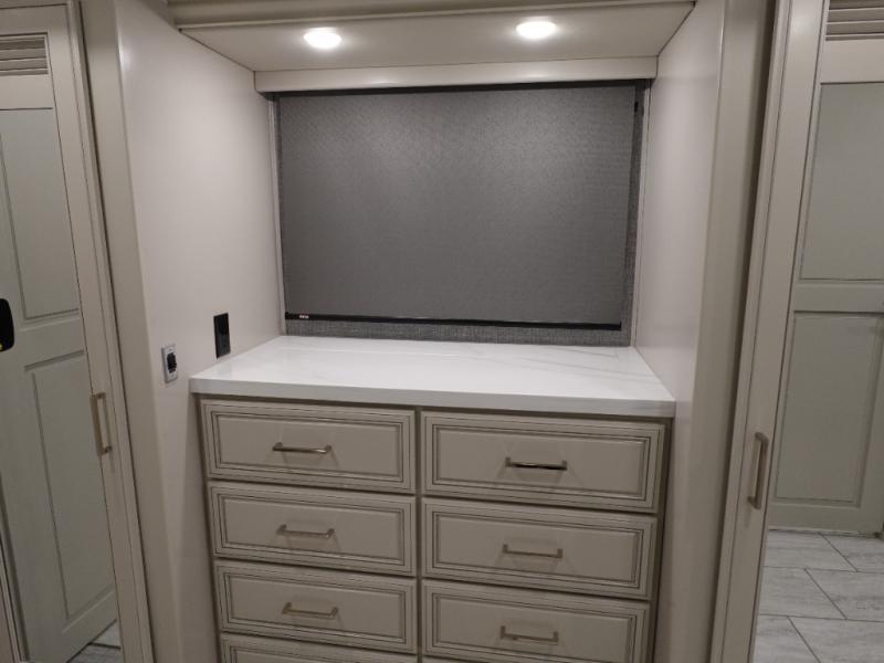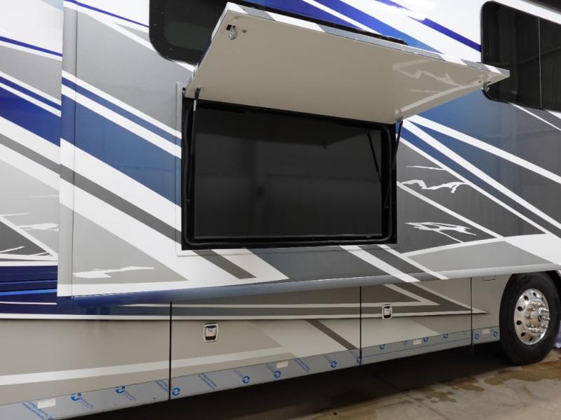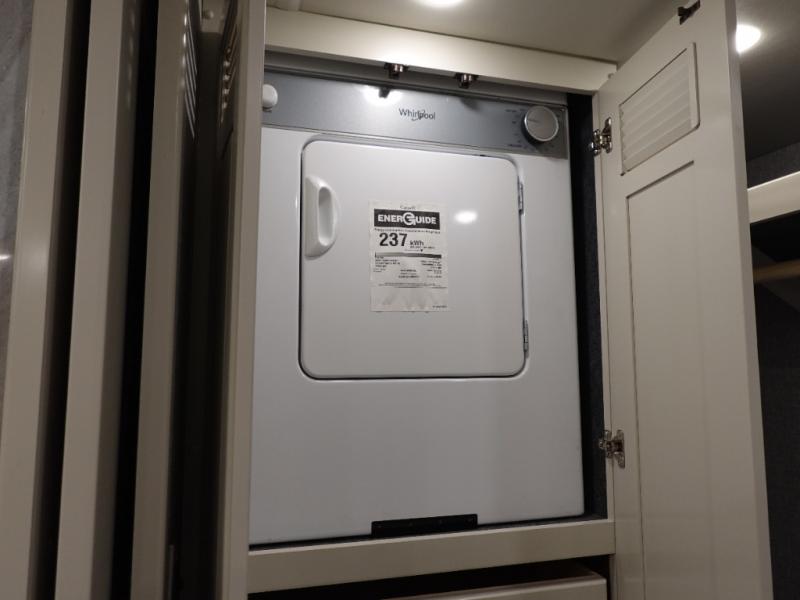 Head across the country or state in this spacious coach! The motion power lounge provides a comfy place to relax, and the sleeper sofa with a full-size mattress will be perfect for guests. The full kitchen includes a two burner induction cooktop and stainless steel over-the-range convection microwave to cook meals, plus a dishwasher for easy clean-up and a residential refrigerator for food storage. You will love having a king bed slide out to sleep on, along with dual bedroom wardrobes and a dresser to keep your clothes tidy. The mid-coach half bath is easily accessible for everyone to use, and the full rear master bath is sure to be a big bonus. Here, you'll find dual bath sinks, a spacious shower, and a walk-in closet with tons of storage and a stackable washer and dryer. This coach also includes LED TVs to keep you entertained, including an exterior entertainment center with a Bluetooth soundbar!