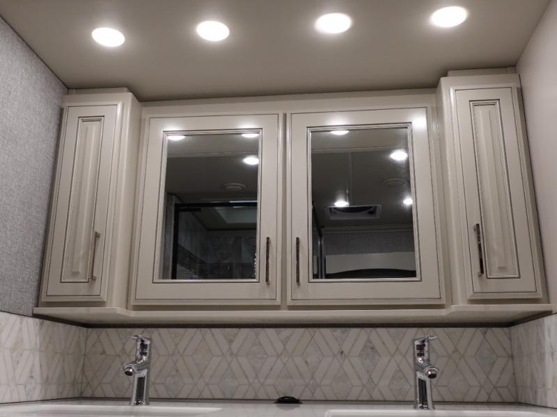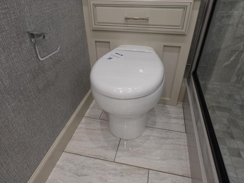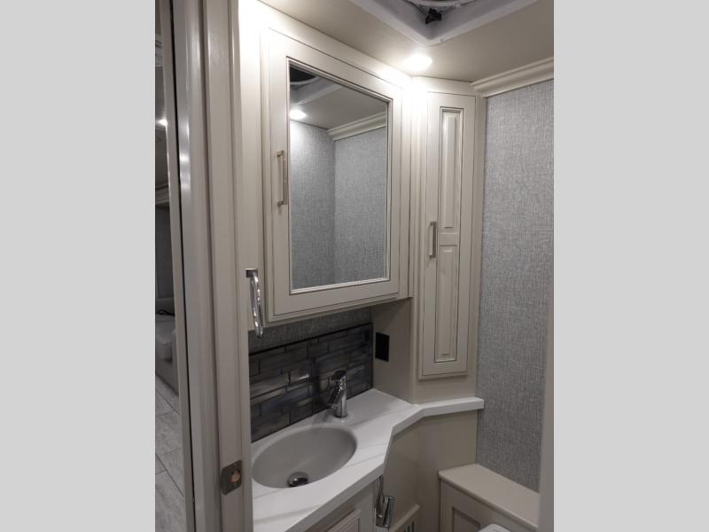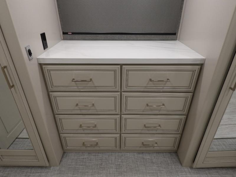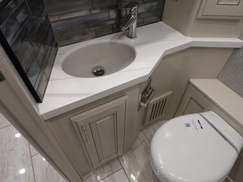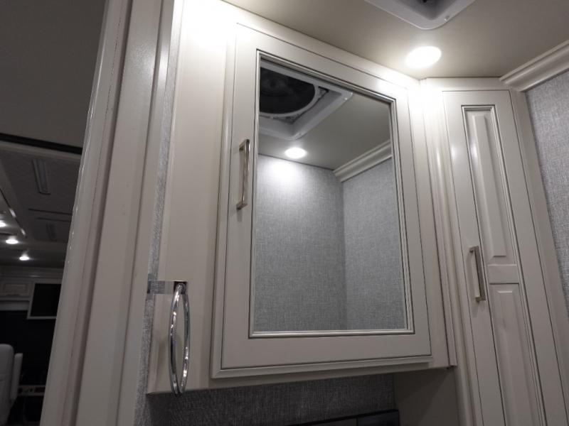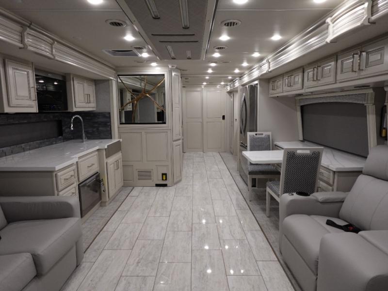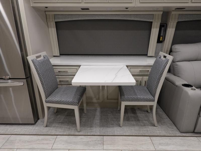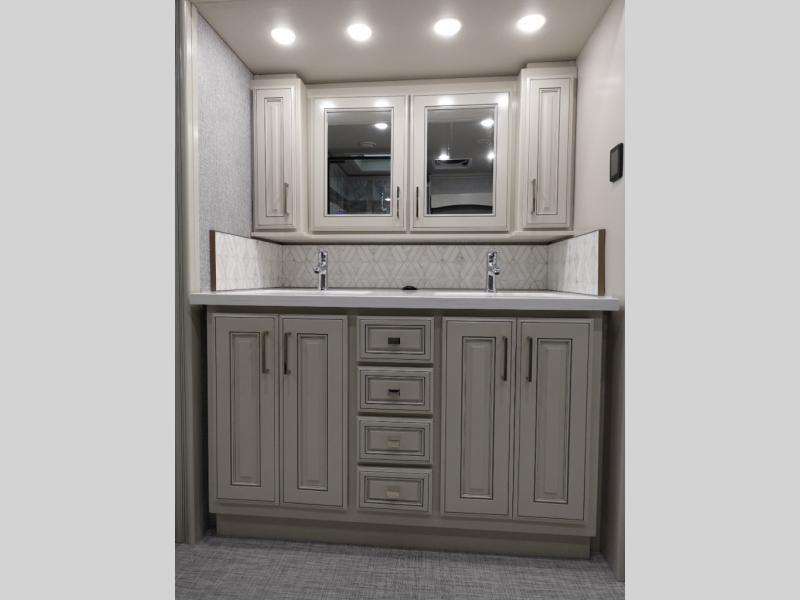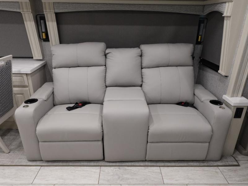 Head across the country or state in this spacious coach! The motion power lounge provides a comfy place to relax, and the sleeper sofa with a full-size mattress will be perfect for guests. The full kitchen includes a two burner induction cooktop and stainless steel over-the-range convection microwave to cook meals, plus a dishwasher for easy clean-up and a residential refrigerator for food storage. You will love having a king bed slide out to sleep on, along with dual bedroom wardrobes and a dresser to keep your clothes tidy. The mid-coach half bath is easily accessible for everyone to use, and the full rear master bath is sure to be a big bonus. Here, you'll find dual bath sinks, a spacious shower, and a walk-in closet with tons of storage and a stackable washer and dryer. This coach also includes LED TVs to keep you entertained, including an exterior entertainment center with a Bluetooth soundbar!
