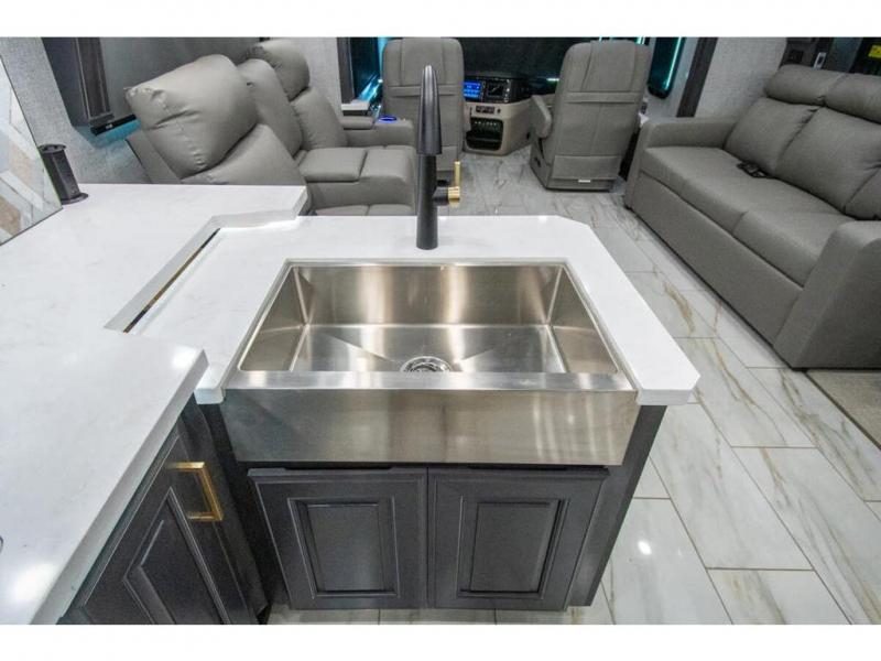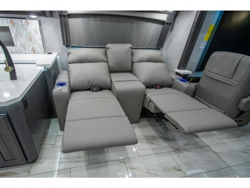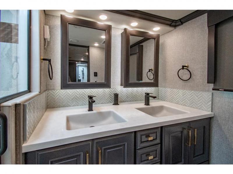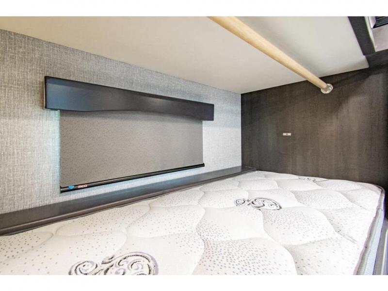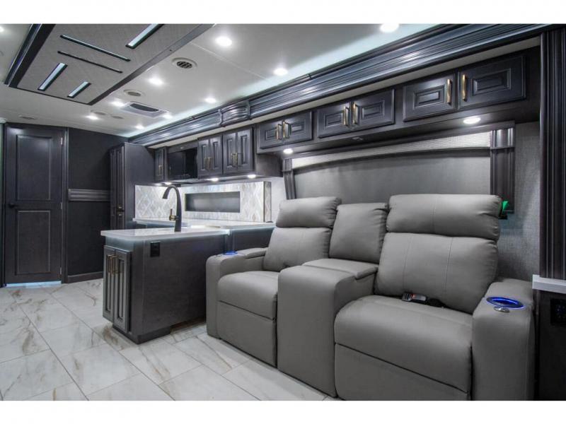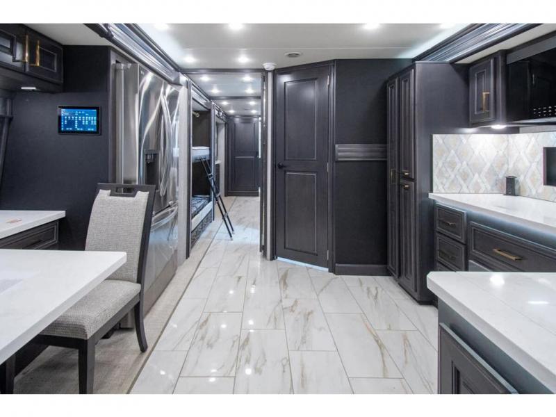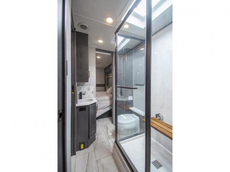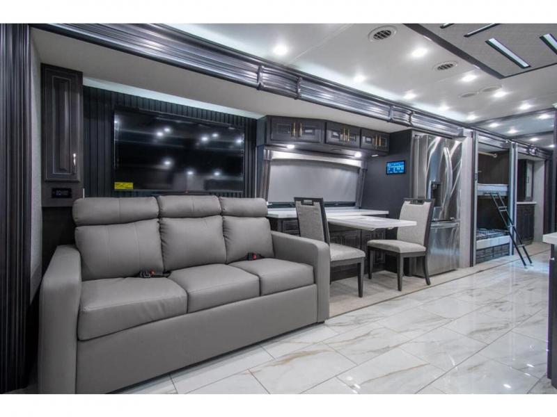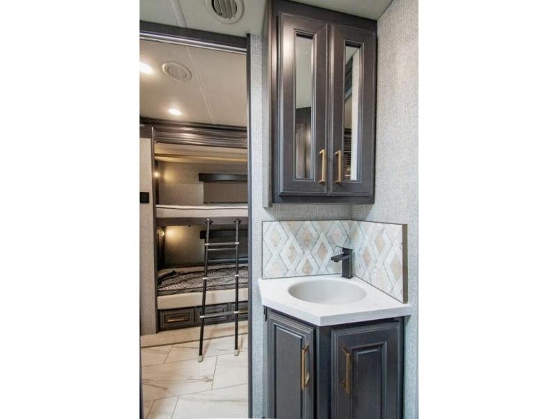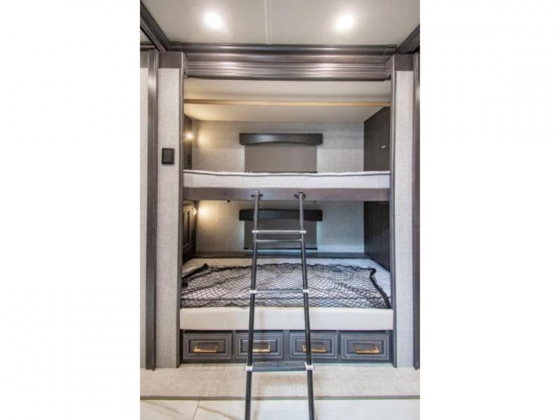 Head across the country or state in this spacious coach! The motion power lounge provides a comfy place to relax, and the sleeper sofa with a full-size mattress will be perfect for guests. You can also choose to add the optional Hide-A-Loft overhead bunk if you're needing more sleeping space. The full kitchen includes a two burner induction cooktop and stainless steel over-the-range convection microwave to cook meals, plus a dishwasher for easy clean-up and a residential refrigerator for food storage. You will love having a king bed slide out to sleep on, along with dual bedroom wardrobes and a side-by-side washer and dryer to make laundry day easier than ever. The convertible bunk beds are right across from the mid-coach full bath, and there are accordion doors here if you want to make the bunks and bath one big master bunkhouse! The second full bath is found in the back, creating a master bedroom you are sure to love. There are dual bath sinks here, a toilet, and a tile shower with a seat for all-around luxury!