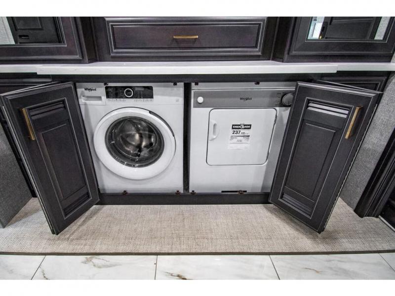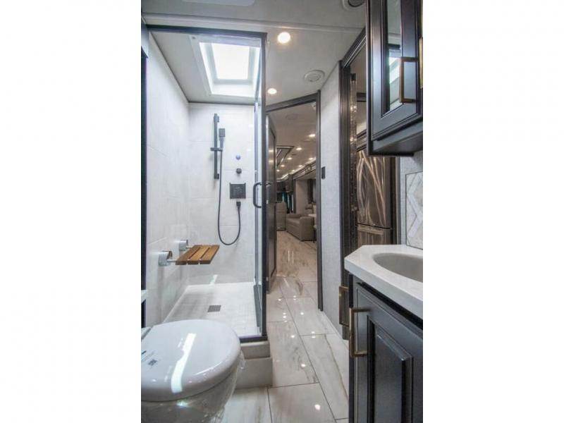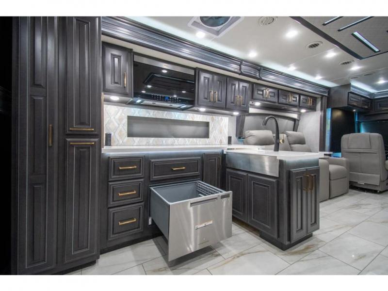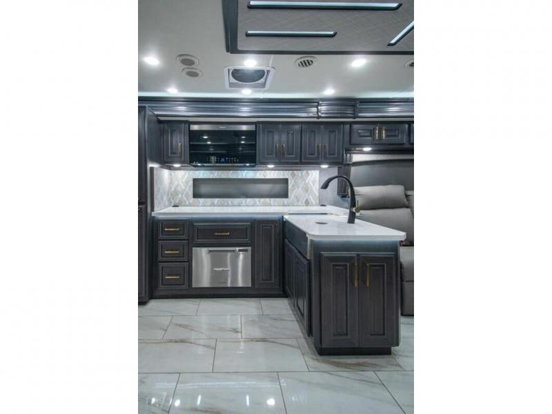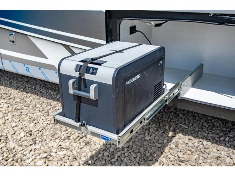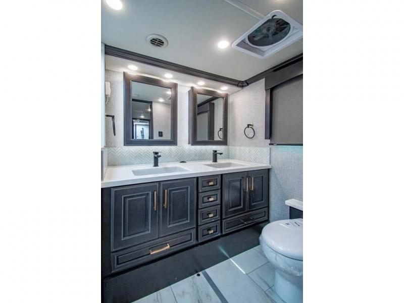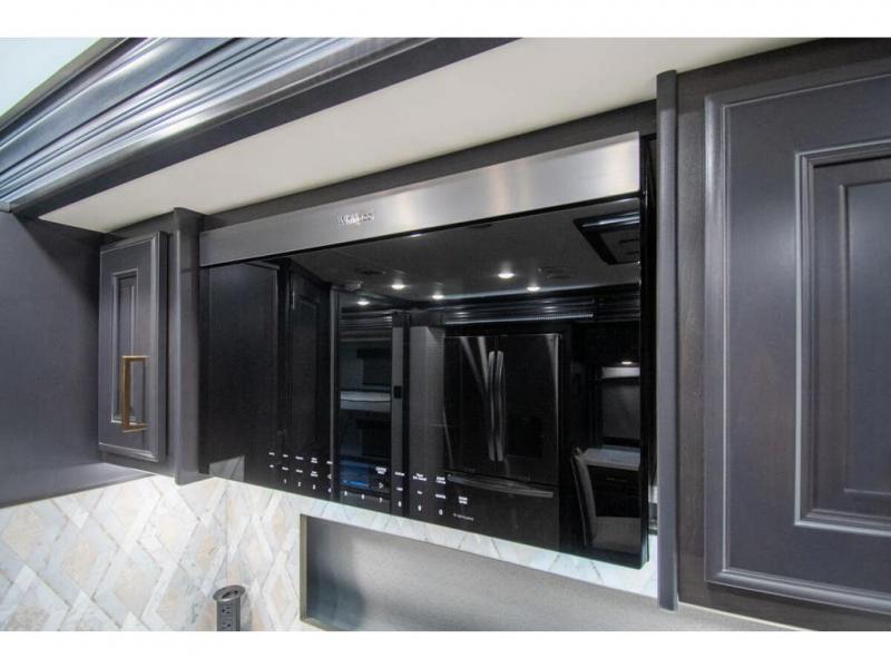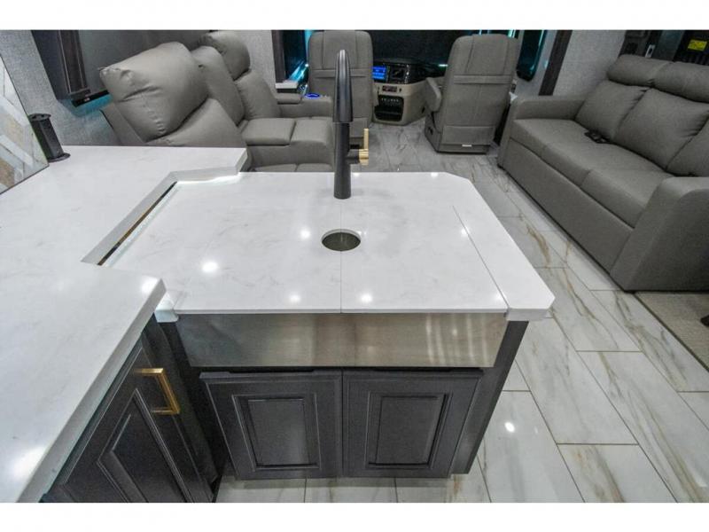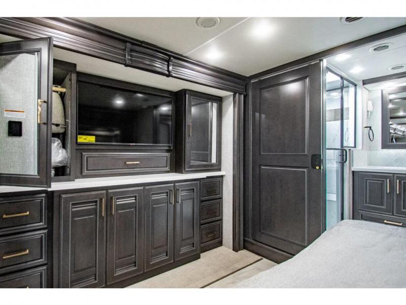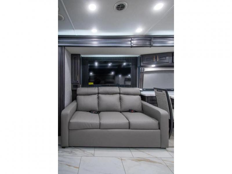 Head across the country or state in this spacious coach! The motion power lounge provides a comfy place to relax, and the sleeper sofa with a full-size mattress will be perfect for guests. You can also choose to add the optional Hide-A-Loft overhead bunk if you're needing more sleeping space. The full kitchen includes a two burner induction cooktop and stainless steel over-the-range convection microwave to cook meals, plus a dishwasher for easy clean-up and a residential refrigerator for food storage. You will love having a king bed slide out to sleep on, along with dual bedroom wardrobes and a side-by-side washer and dryer to make laundry day easier than ever. The convertible bunk beds are right across from the mid-coach full bath, and there are accordion doors here if you want to make the bunks and bath one big master bunkhouse! The second full bath is found in the back, creating a master bedroom you are sure to love. There are dual bath sinks here, a toilet, and a tile shower with a seat for all-around luxury!