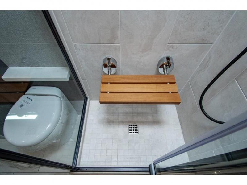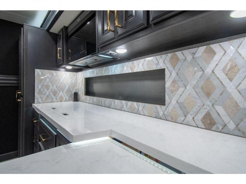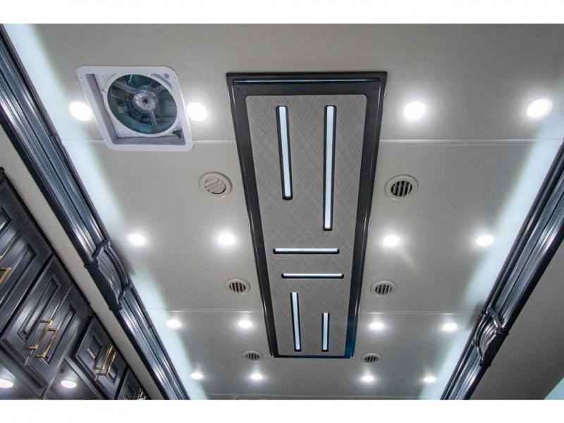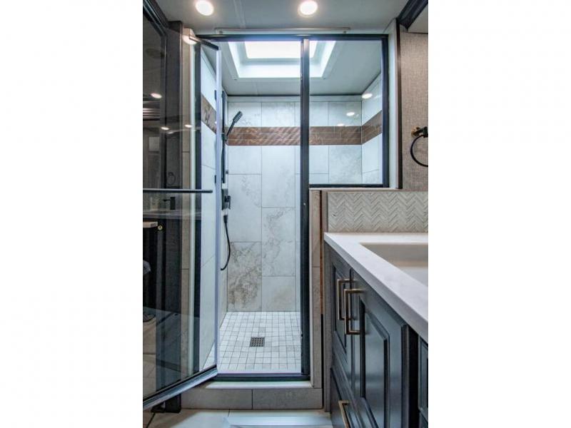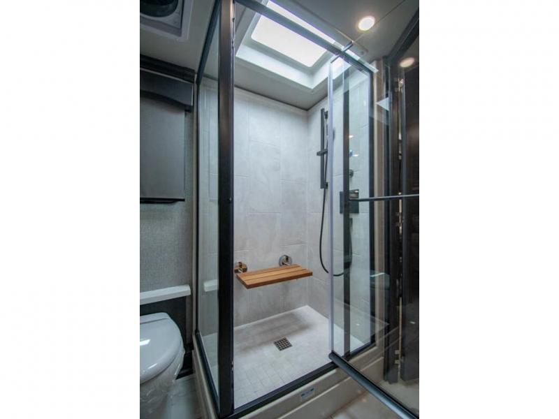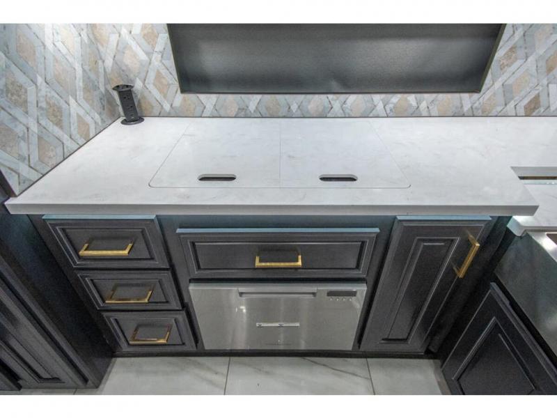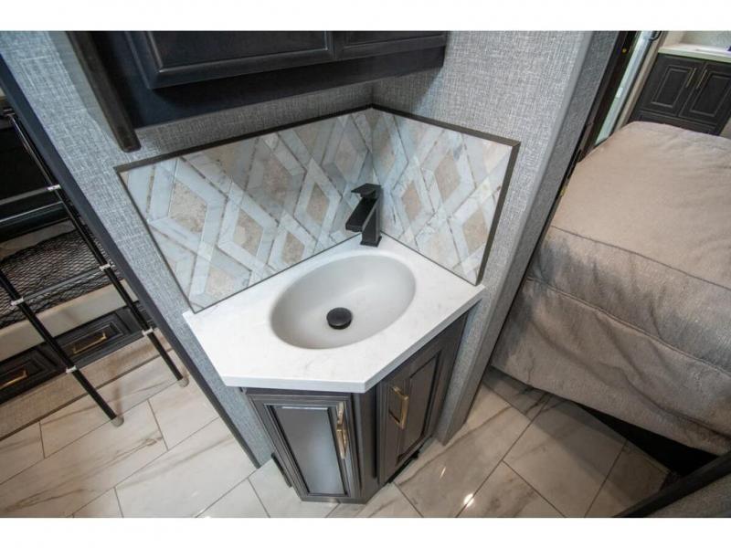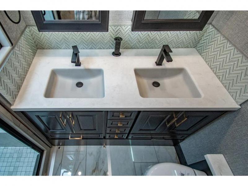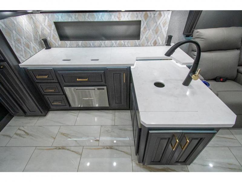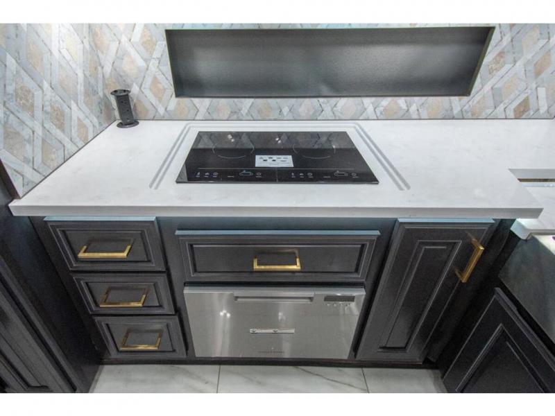 Head across the country or state in this spacious coach! The motion power lounge provides a comfy place to relax, and the sleeper sofa with a full-size mattress will be perfect for guests. You can also choose to add the optional Hide-A-Loft overhead bunk if you're needing more sleeping space. The full kitchen includes a two burner induction cooktop and stainless steel over-the-range convection microwave to cook meals, plus a dishwasher for easy clean-up and a residential refrigerator for food storage. You will love having a king bed slide out to sleep on, along with dual bedroom wardrobes and a side-by-side washer and dryer to make laundry day easier than ever. The convertible bunk beds are right across from the mid-coach full bath, and there are accordion doors here if you want to make the bunks and bath one big master bunkhouse! The second full bath is found in the back, creating a master bedroom you are sure to love. There are dual bath sinks here, a toilet, and a tile shower with a seat for all-around luxury!