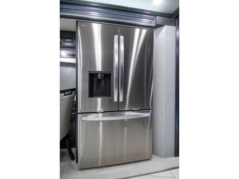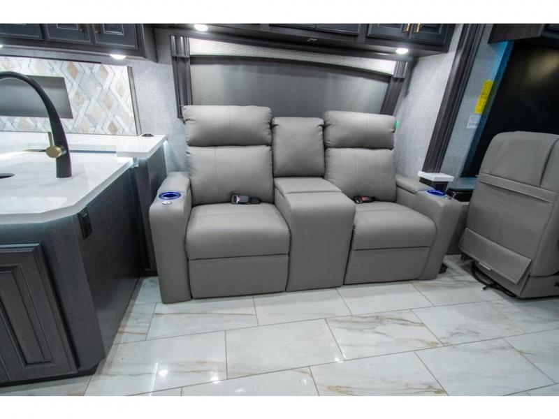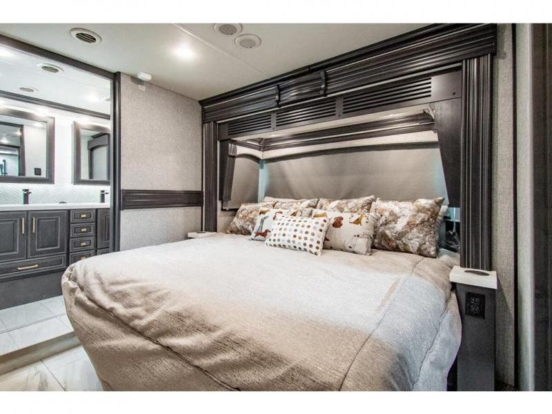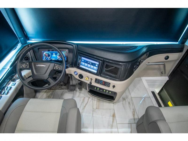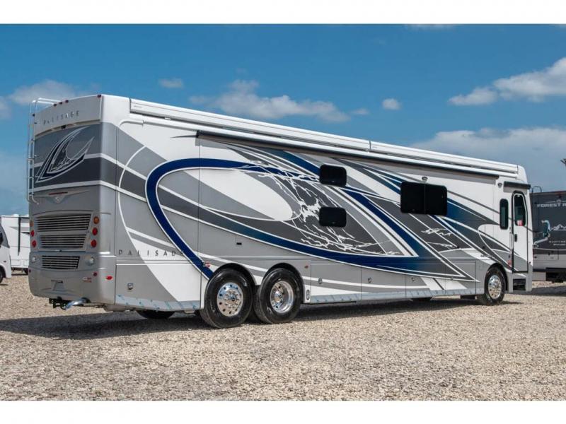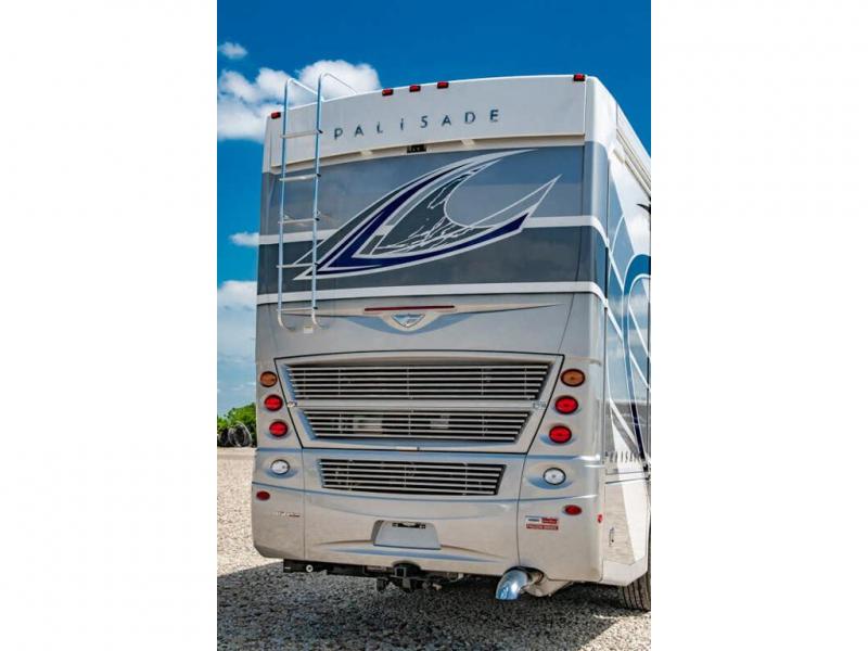 With any Palisade Class A diesel motorhome by Fleetwood RV, you will be met with luxury at every turn! There is a Freedom Bridge foundation and a Freightliner Custom Chassis plus an Allison 3000 6-speed transmission for a smooth drive. The Vacu-Bond aluminum framed constructed sidewalls, roof, and floors means you can enjoy your coach for years to come, and the Powerlock System interlocks the floor, walls and roof for even more strength. Outside, the basement pass-through storage and side swing aluminum bus-style baggage doors will let you easily pack camp gear, and the 4-color premier full body paint is sure to turn heads as you travel down the highway. Additional exterior features include automatic hydraulic leveling jacks, a King universal stationary satellite, automatic entrance steps, and the list goes on! Once inside, you can enjoy the porcelain tile flooring, hardwood cabinetry, elegant tile backsplash, dual bath sinks, and glass shower door to name a few comforts!