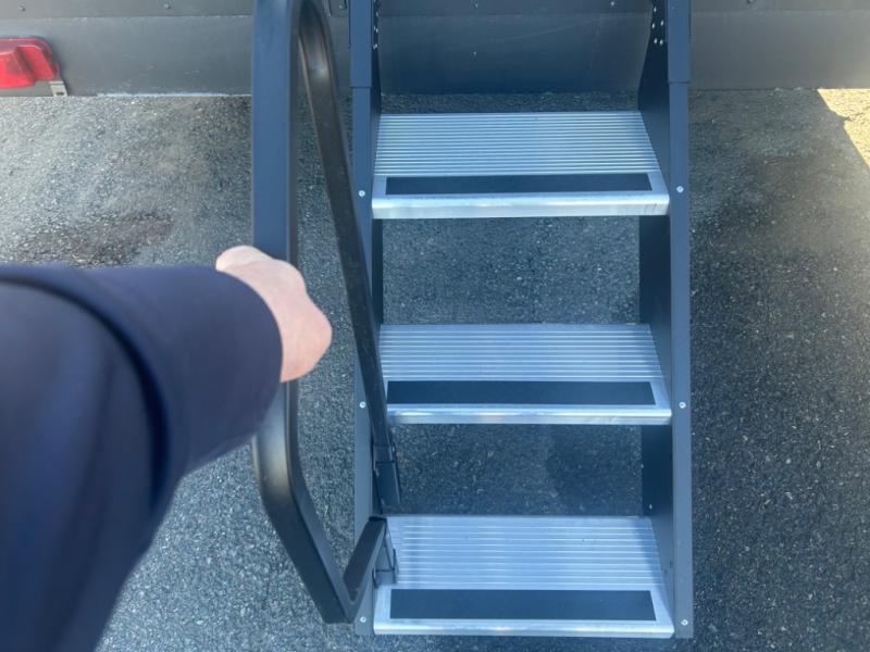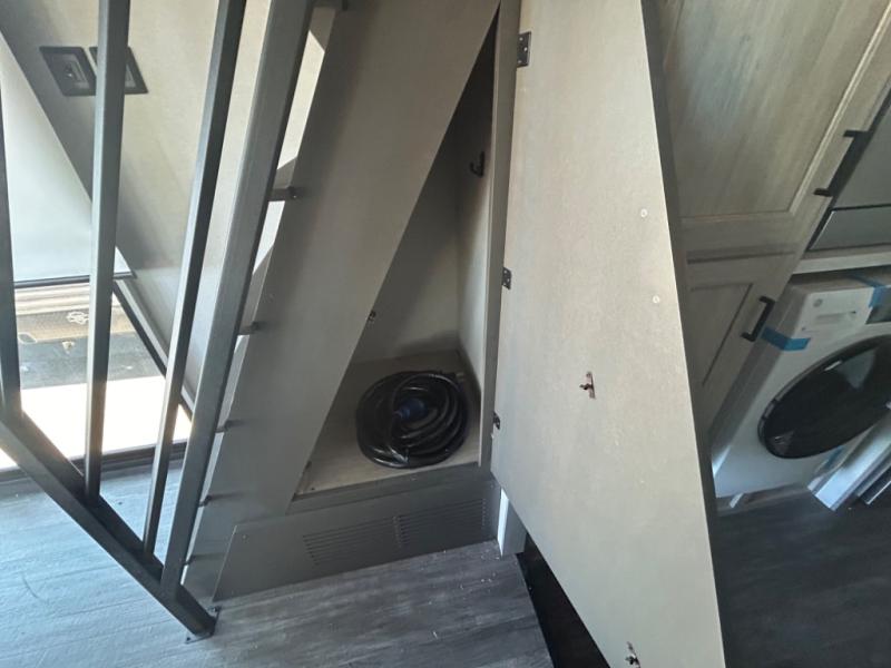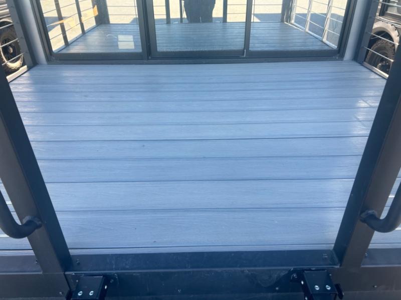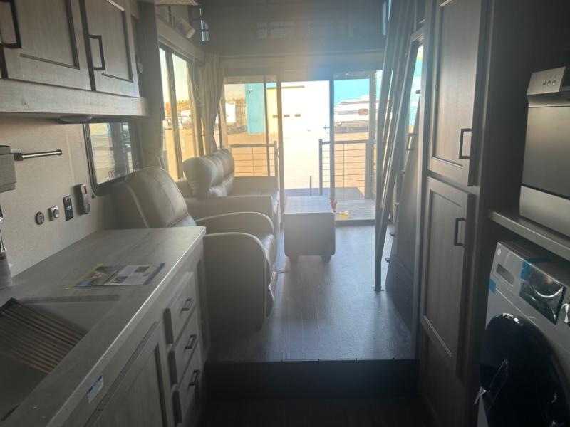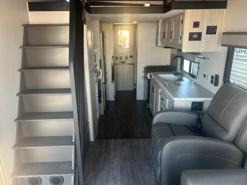 This destination trailer will make extended stays easier than ever. The rear deck will be a favorite place to relax each day, and there is a patio door that will lead into the main living area. Here, you'll enjoy a tri-fold sofa plus a lift top table and an ottoman. There is a lounge recliner where you can catch up on some reading, and the storage closet can hold games, extra blankets, and more. The main floor of this unit includes the kitchen with plenty of counter space, a pantry, and a residential refrigerator to keep cold items stocked. Your crew can get cleaned up each day in the front bath that features a spacious shower with a seat, a wardrobe closet, plus a linen closet for clean towels. The main loft steps that lead up to it, along with a king-size bed, storage closets, plus a fireplace! There is even a second loft above the rear deck with a queen-size bunk mattress, a removable ladder and a railing!