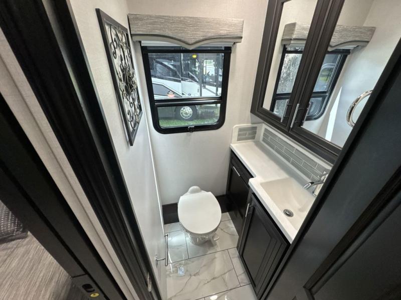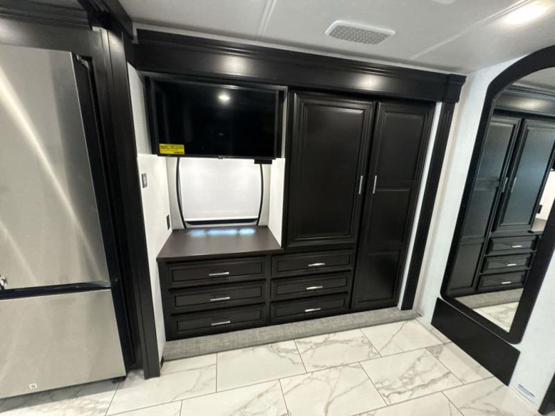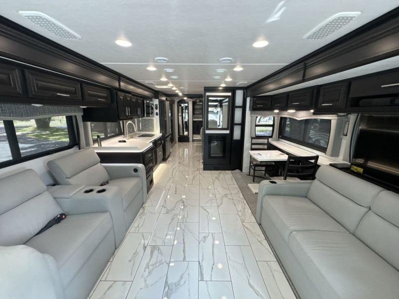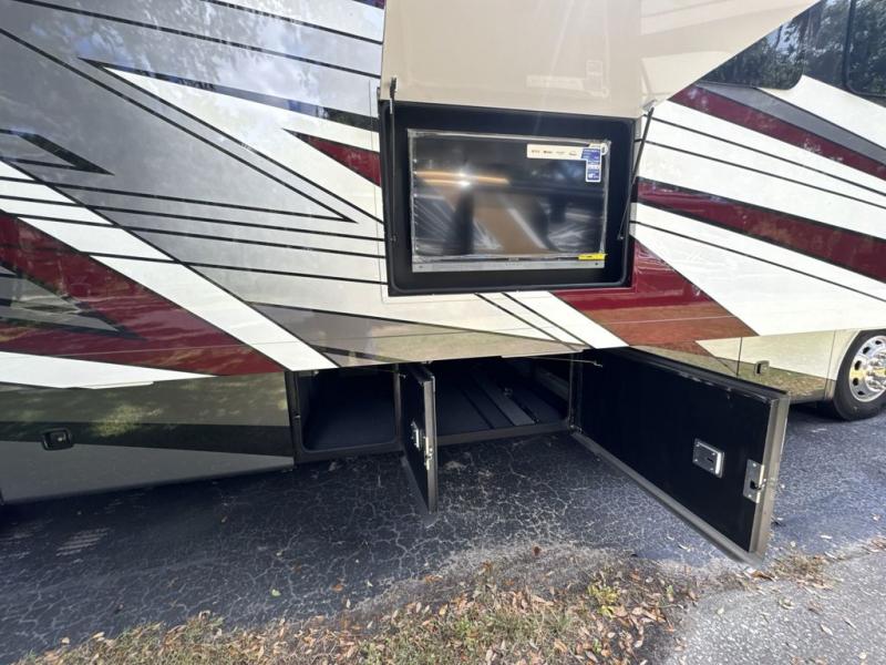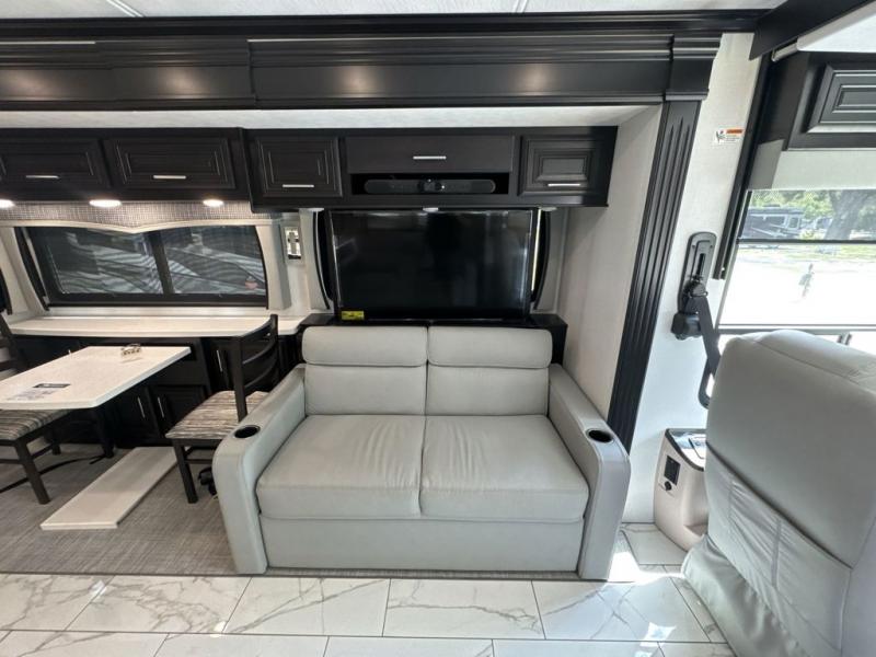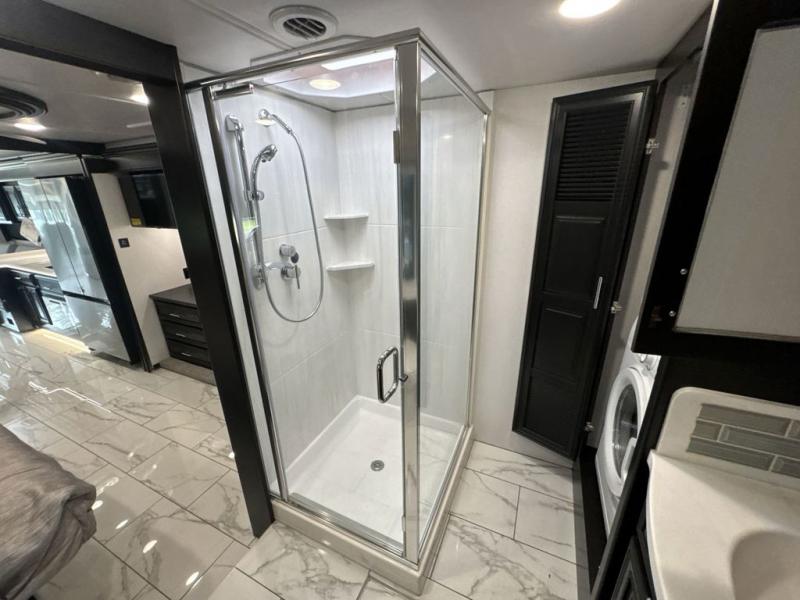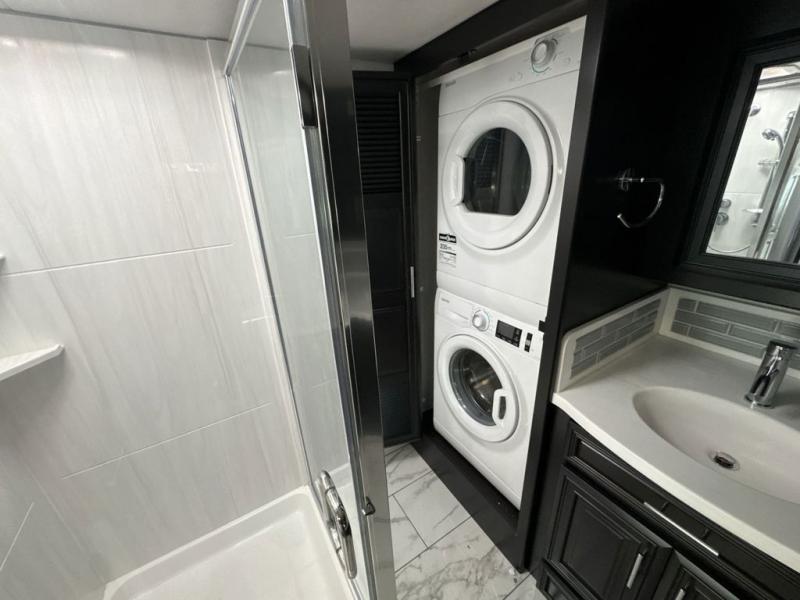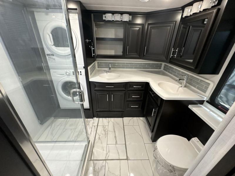 You will find comfort all throughout this motorhome, from the bunk lift over the cab with a 32" LED TV to the full rear bathroom with a stackable washer and dryer and dual bath sinks. There is plenty of entertainment throughout the inside with LED TVs and the outside with an exterior entertainment center with a 43" LED TV, Bluetooth radio, and speakers to crank up the tunes. The chef will have an easy time preparing their meals with the two burner induction cooktop and can keep their ingredients fresh with the 23 cu. ft. French door residential refrigerator, plus there is a 30" over the range convection microwave for those nights when you don't feel like cooking. The booth dinette is a great place to enjoy your meals, play card games, and even transform into an extra sleeping space. The hide-a-bed sofa and second sofa also offer comfortable sleeping spaces if needed!
