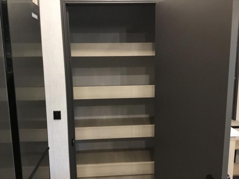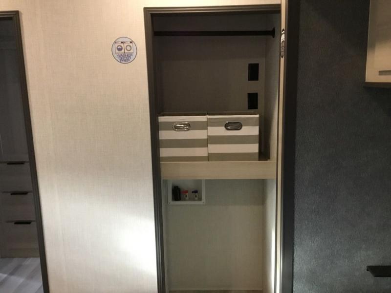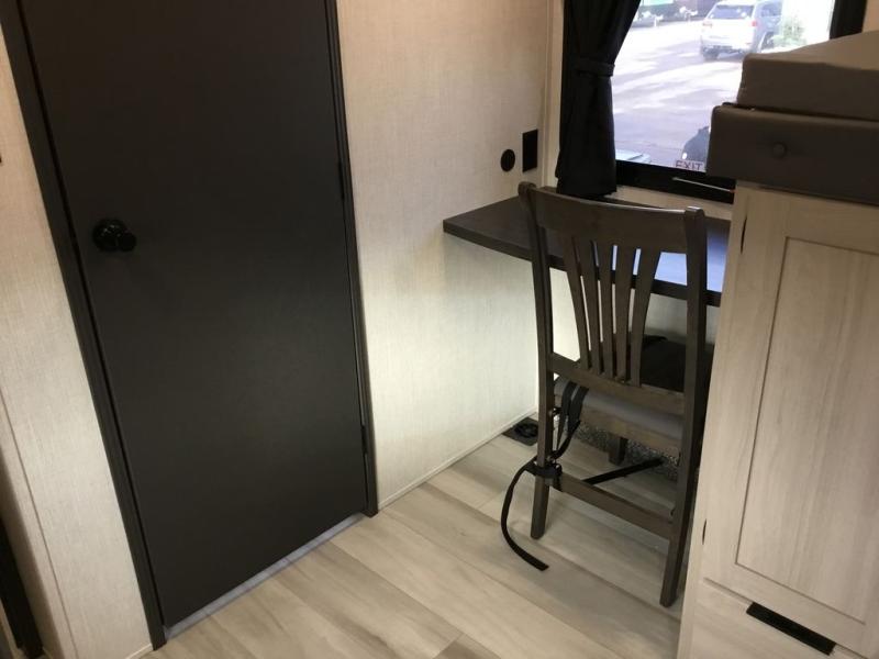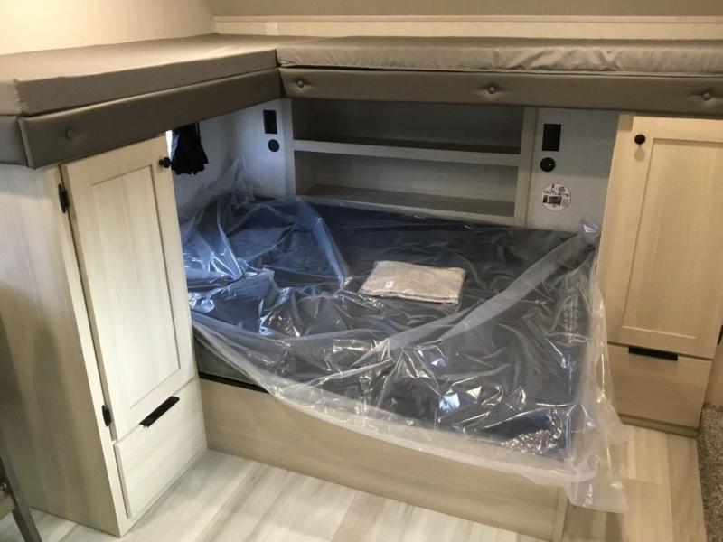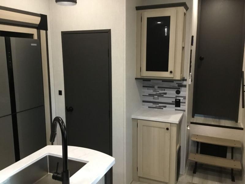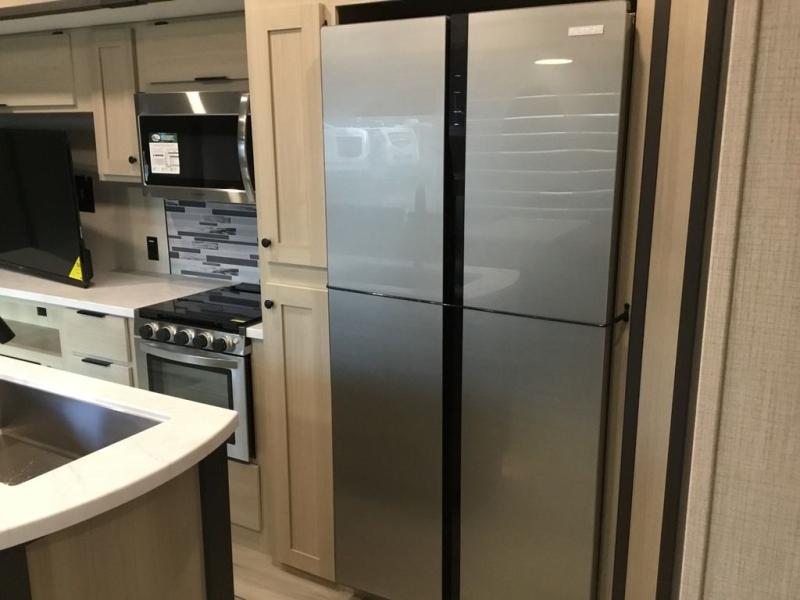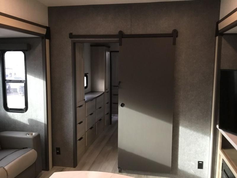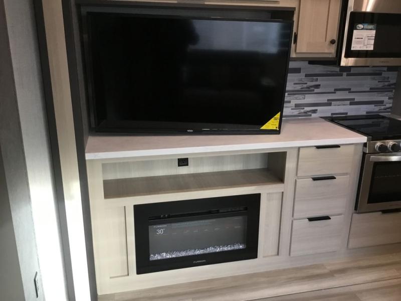 If you're ready for fun, look for further than this dual entry Cardinal fifth wheel! It will be so easy to travel with friends and family since there is a master bedroom with a king bed and a full rear bath, plus a front bunkhouse suite with bunk beds, a queen bed, and a second full bath! The chef of your crew can whip up breakfast in the morning on the 21" 2-in-1 oven range or in the over-the-range microwave. There is also a 16 cu. ft. 12V refrigerator and walk-in pantry for food storage! The theater seating and table with chairs sit across from the entertainment center and fireplace for easy viewing in the evening, or you may just find yourselves outdoors visiting with campground neighbors!