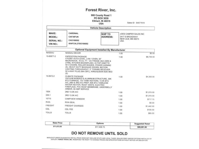 Forest River Cardinal fifth wheel 35FUN highlights: