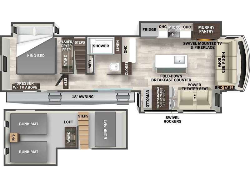 The 40CDL Cottage is an innovative bunkhouse with an upper loft that provides sleeping for three plus storage!. The rear king bedroom has its own entry/exit door for added privacy, and includes a closet with washer/dryer prep, wardrobe, and dresser with TV. The bathroom gives you a residential shower with built-in seat, skylight, and linen cabinet. The large island kitchen provides plenty of counter space and includes residential appliances and a bonus pantry.