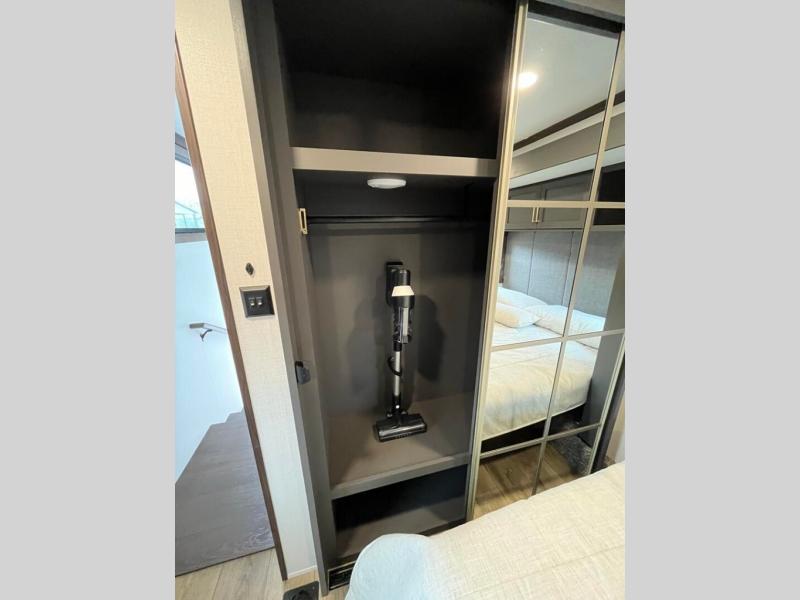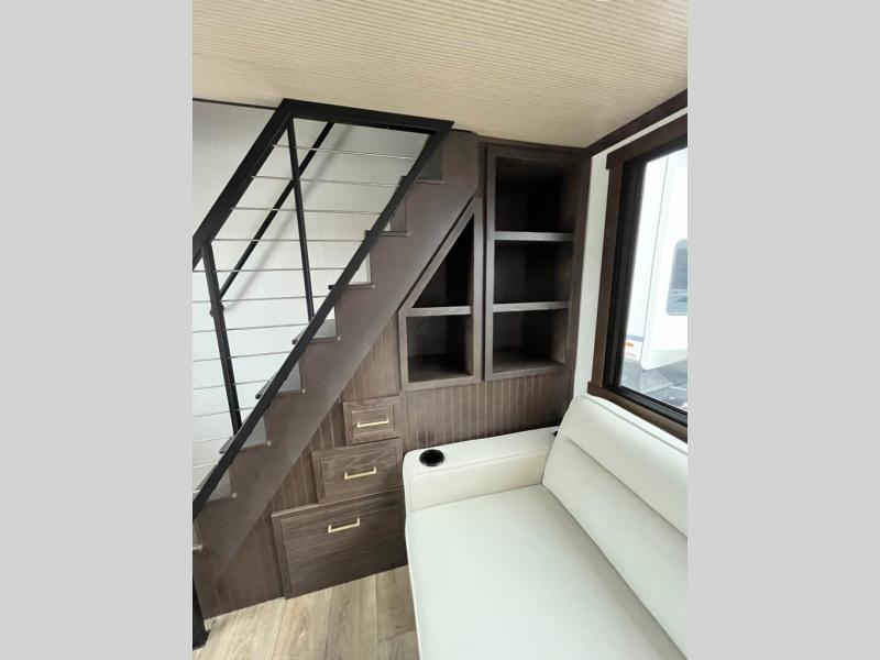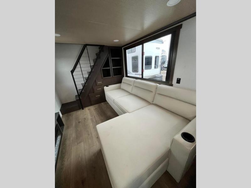 It will be so easy to enjoy extended stays in this destination fifth wheel! There is a large slide out in the main living area, a counter peninsula for more counter space, and a flip-down bar top to dine at. You'll find a comfy place to relax on the sectional sofa with a trundle bed underneath for added sleeping space. There is a loft area above the living room that includes two bunk mats and loft windows so this space seems larger, and the second loft is found above the spacious full bath. Speaking of the bath, you'll find a spacious shower and sink plus washer and dryer prep if you want the option to make laundry day easier. The front private bedroom features a king bed slide out, a front bench seat, a large wardrobe, and a dresser with a TV above to watch movies in bed.