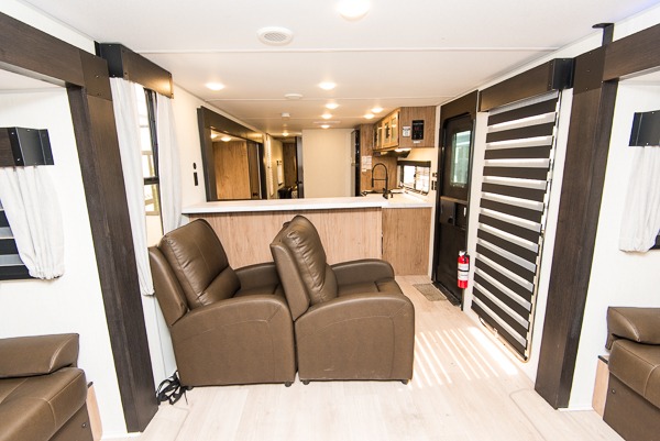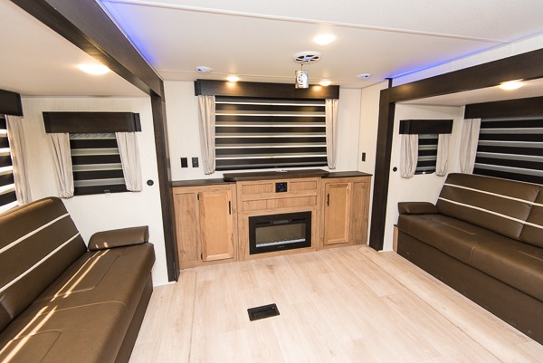Affordable luxury and livability is what you will find in this travel trailer! The rear living area has opposing sofa slides, two recliners, a rear entertainment center with a fireplace, and panoramic windows for added natural lighting. There is even a bar top with two bar stools overlooking the living area so you can enjoy a meal and a movie. The booth dinette slide has a full door pantry next to it so you can quickly grab a snack during game night. Freshen up each morning in the full bathroom with the shower with a seat. The front private bedroom has a walk around queen bed for a good night's rest and a linen closet with an area prepped to add the optional washer and dryer. You even have an outside kitchen, a rear storage rack, outside storage areas, and an outside TV mount!