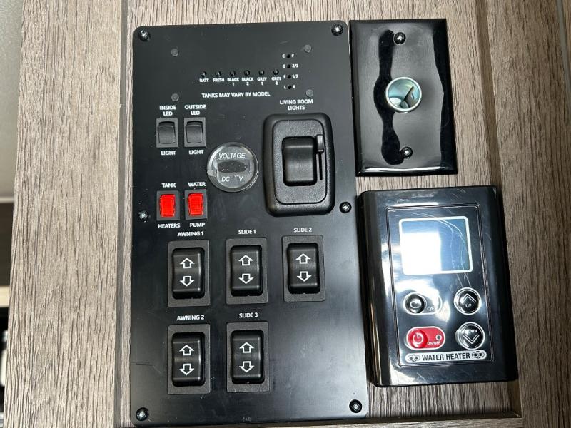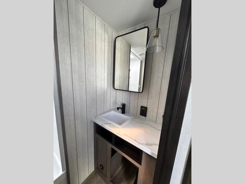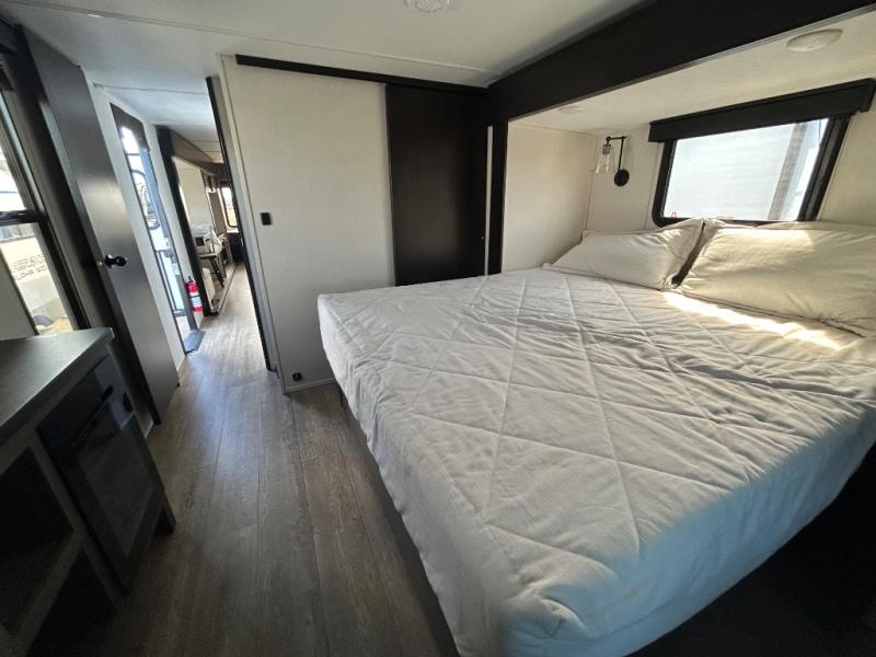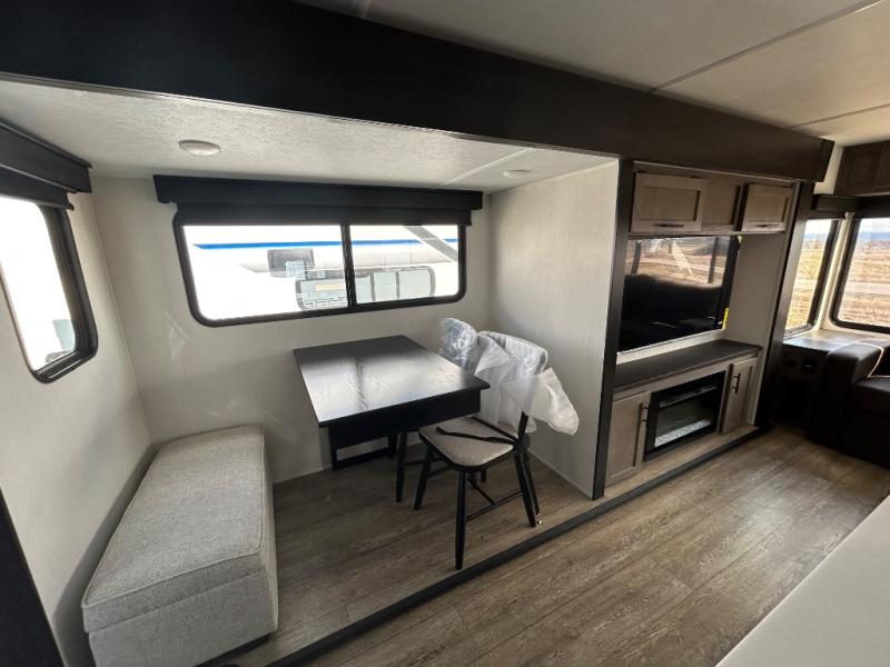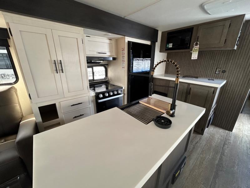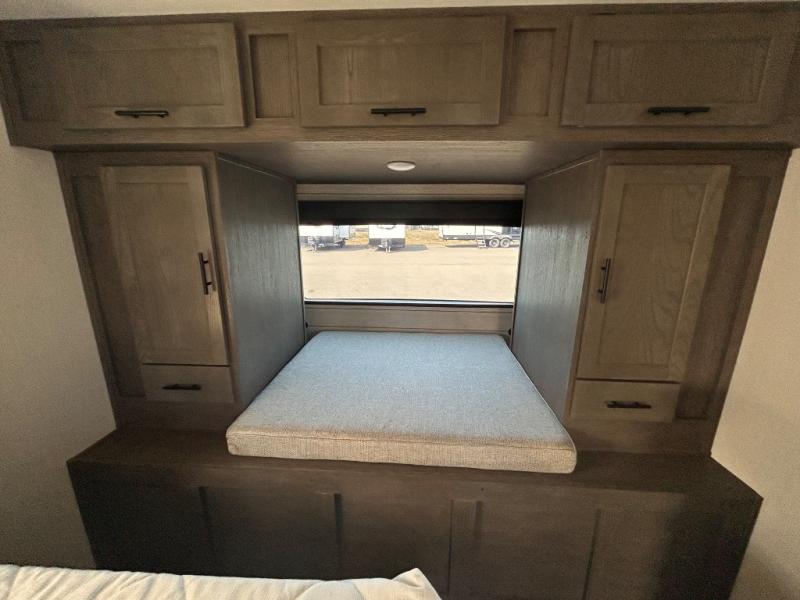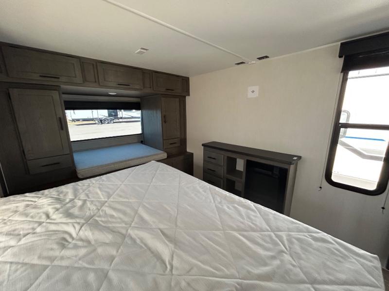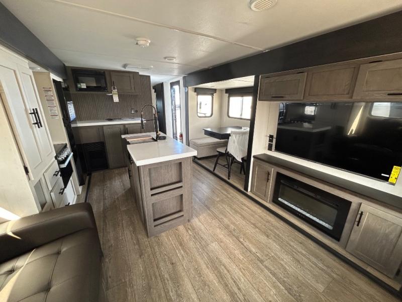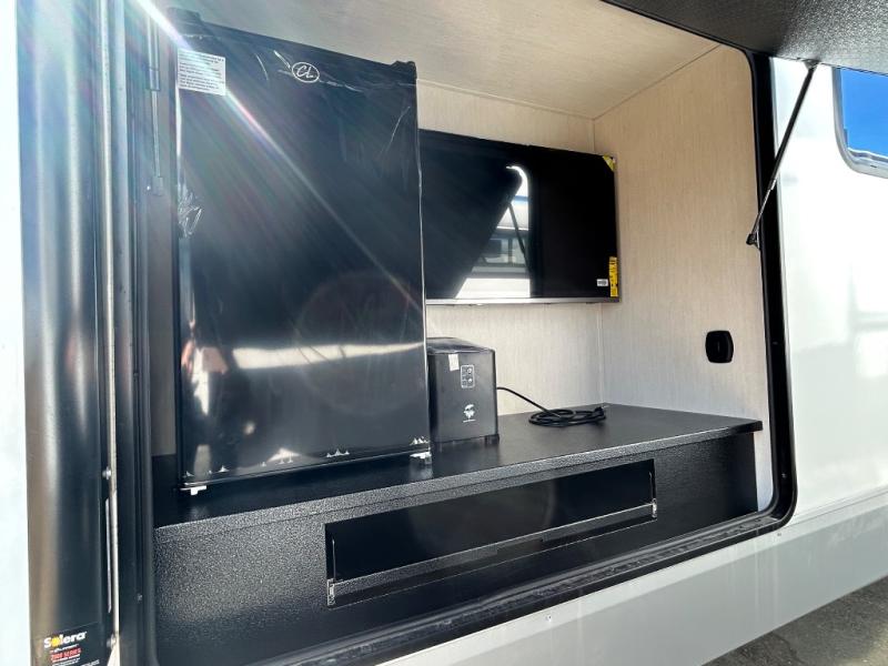 It will be so easy to find comfort in this travel trailer! The dual opposing slides in the combined kitchen and living room will create an open floorplan you are sure to love. There is a rear tri-fold sofa, theater seating across from an entertainment center, plus a table with chairs and a storage ottoman seat to keep games organized. The chef of your group will love having extra counter space provided by the kitchen island, and there is a hutch to keep nice dishes stored away. Up front, the private bedroom includes a king bed slide out, dual wardrobes and a dresser, plus a front sun bench where you can sit to pull your hiking boots on. There is even a wardrobe with washer and dryer prep if you choose to add those appliances!