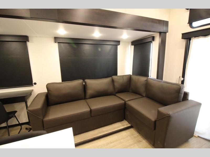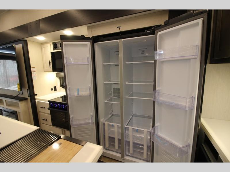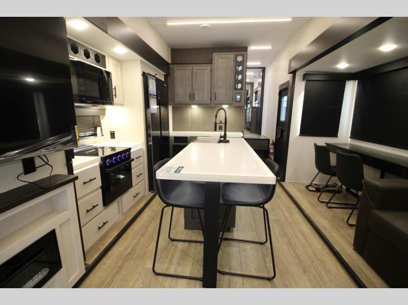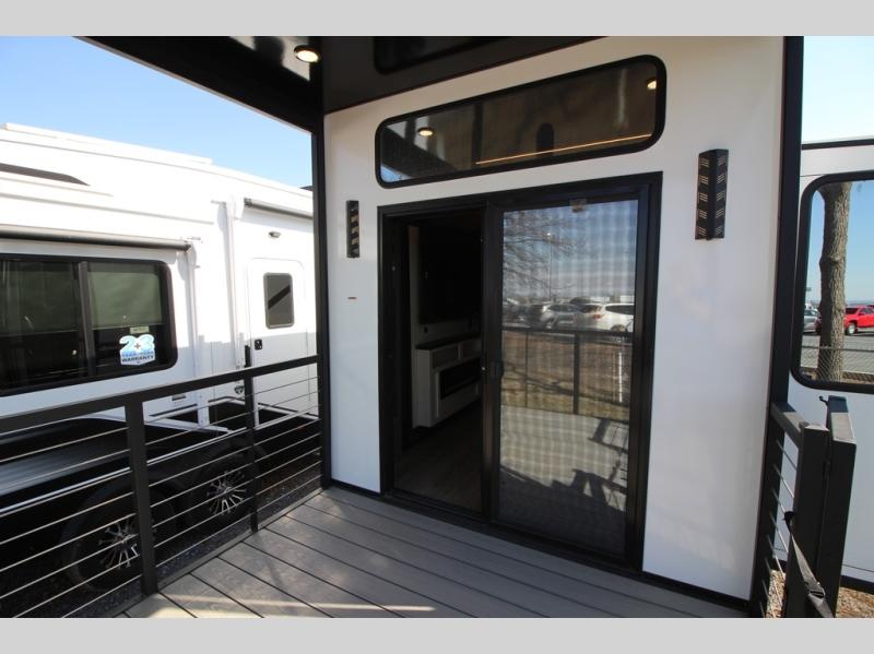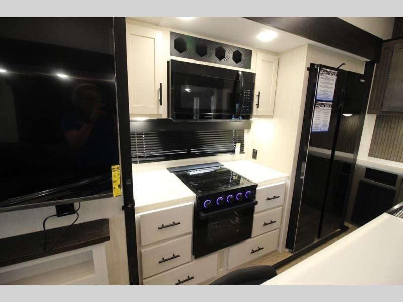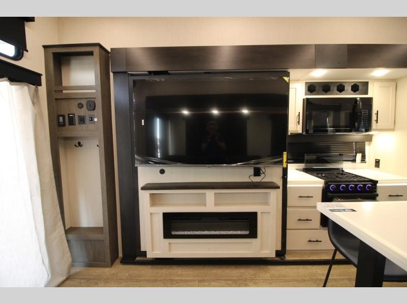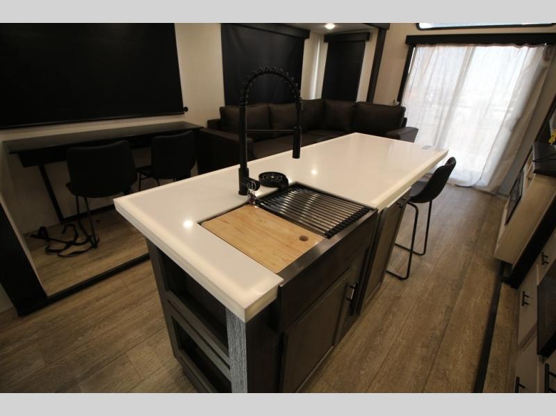 You're going to love camping in this triple slide out fifth wheel that is packed with amenities! The rear deck with a covered patio will provide a place to visit with campground neighbors, and inside, there is an L-shaped tri-fold sofa where guests can sleep. You'll find a king bed slide in the front master bedroom for you, along with a front bench seat, a bedroom fireplace, plus washer and dryer prep if you choose to add these appliances. The kitchen is any chef's dream with its large island with two chairs, pull-out countertop extension, spacious 16 cu. ft. refrigerator, plus a hidden pantry behind the TV for all the dry goods.