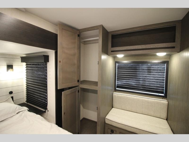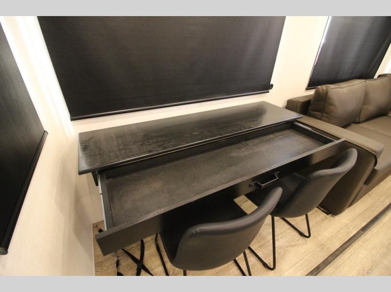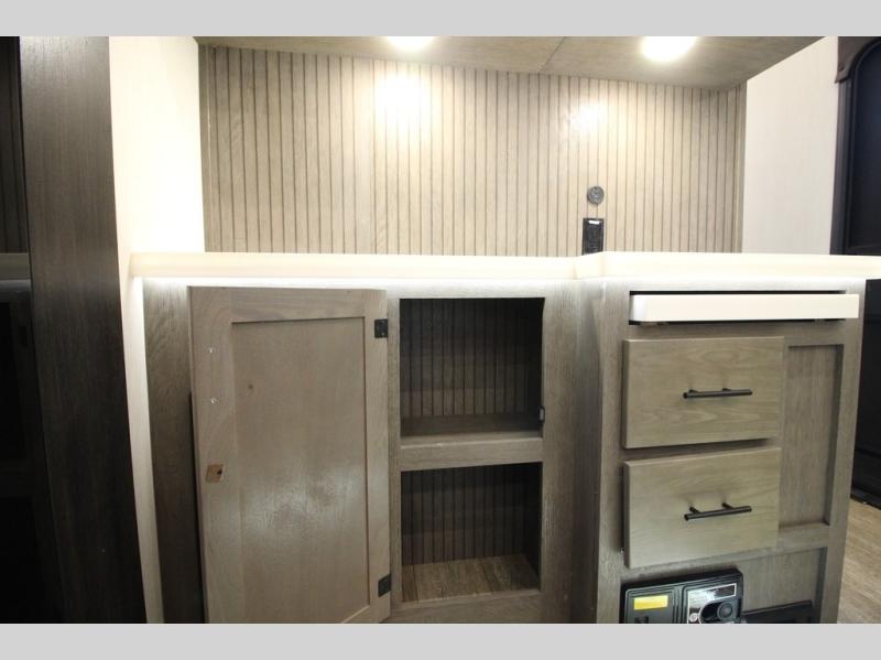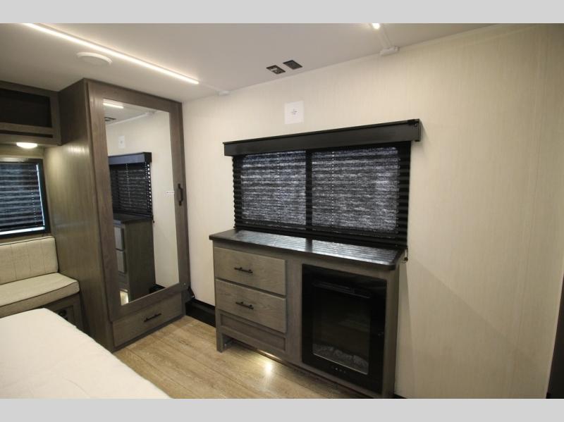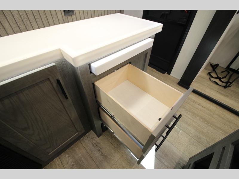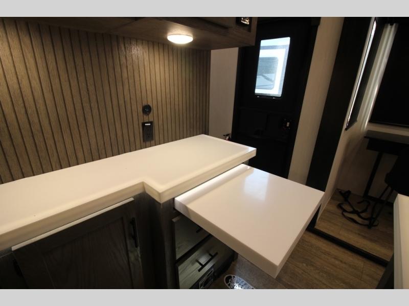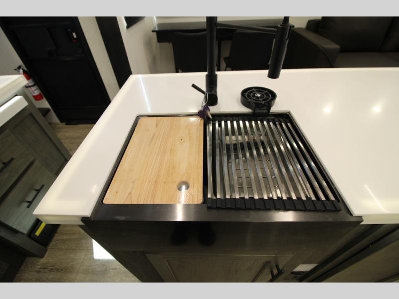 You're going to love camping in this triple slide out fifth wheel that is packed with amenities! The rear deck with a covered patio will provide a place to visit with campground neighbors, and inside, there is an L-shaped tri-fold sofa where guests can sleep. You'll find a king bed slide in the front master bedroom for you, along with a front bench seat, a bedroom fireplace, plus washer and dryer prep if you choose to add these appliances. The kitchen is any chef's dream with its large island with two chairs, pull-out countertop extension, spacious 16 cu. ft. refrigerator, plus a hidden pantry behind the TV for all the dry goods.