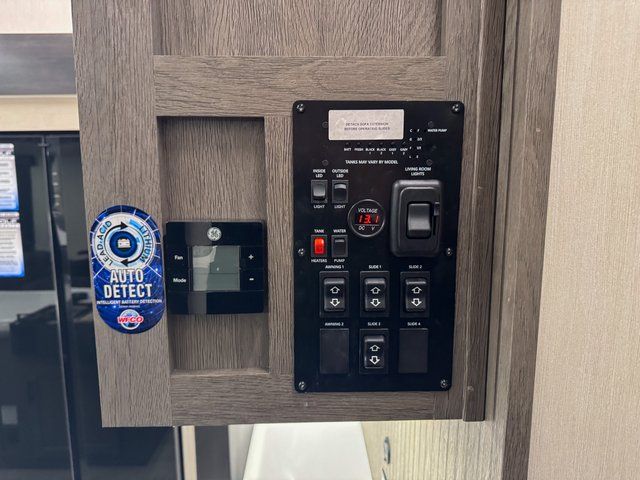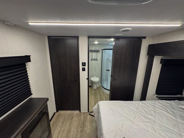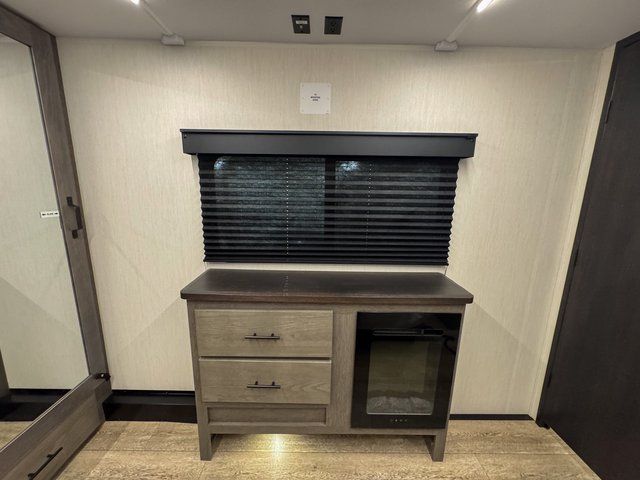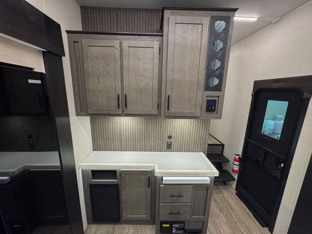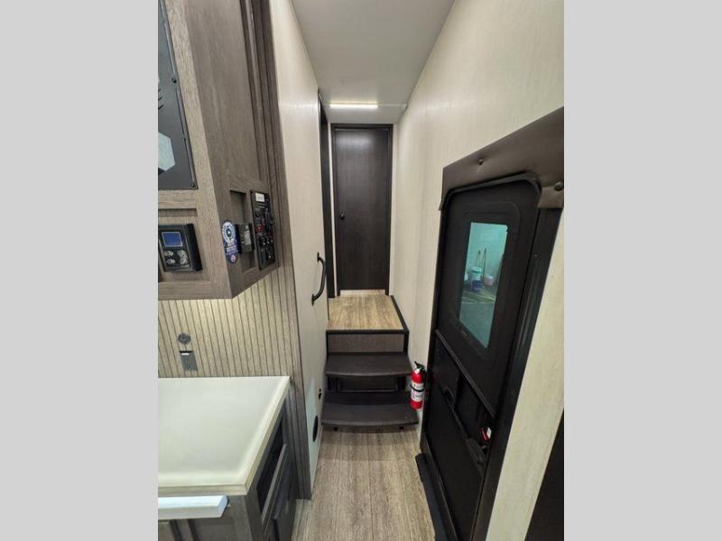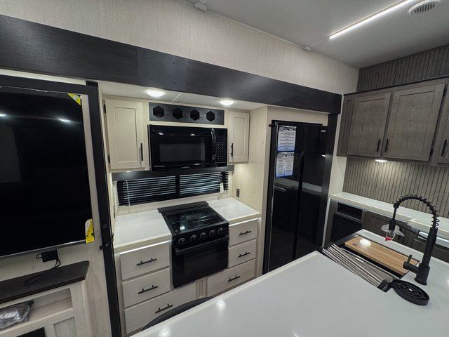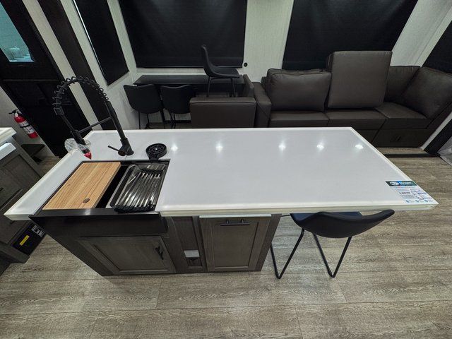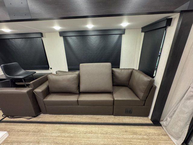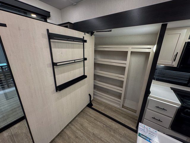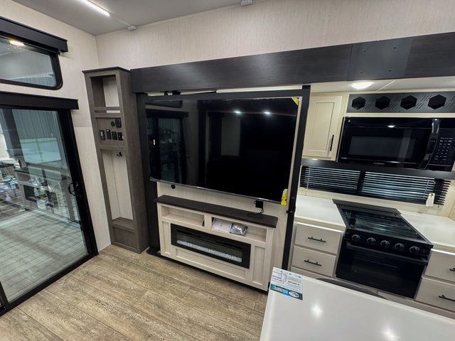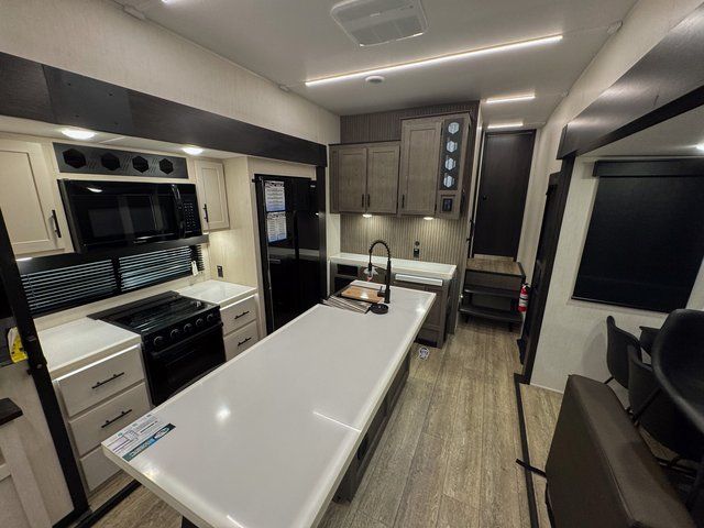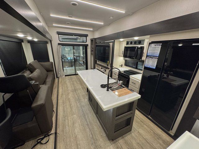 You're going to love camping in this triple slide out fifth wheel that is packed with amenities! The rear deck with a covered patio will provide a place to visit with campground neighbors, and inside, there is an L-shaped tri-fold sofa where guests can sleep. You'll find a king bed slide in the front master bedroom for you, along with a front bench seat, a bedroom fireplace, plus washer and dryer prep if you choose to add these appliances. The kitchen is any chef's dream with its large island with two chairs, pull-out countertop extension, spacious 16 cu. ft. refrigerator, plus a hidden pantry behind the TV for all the dry goods.