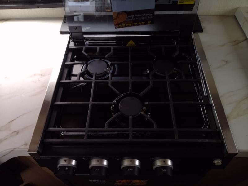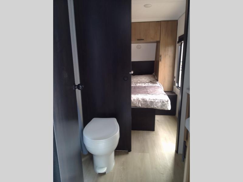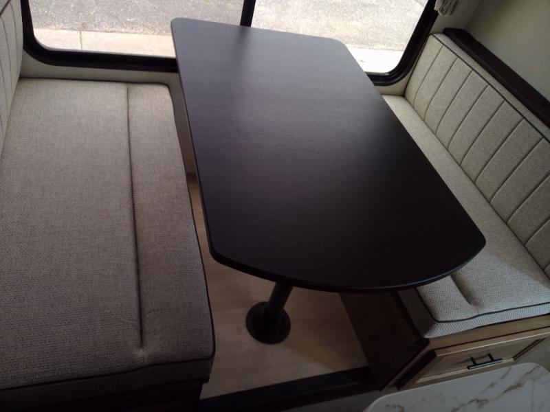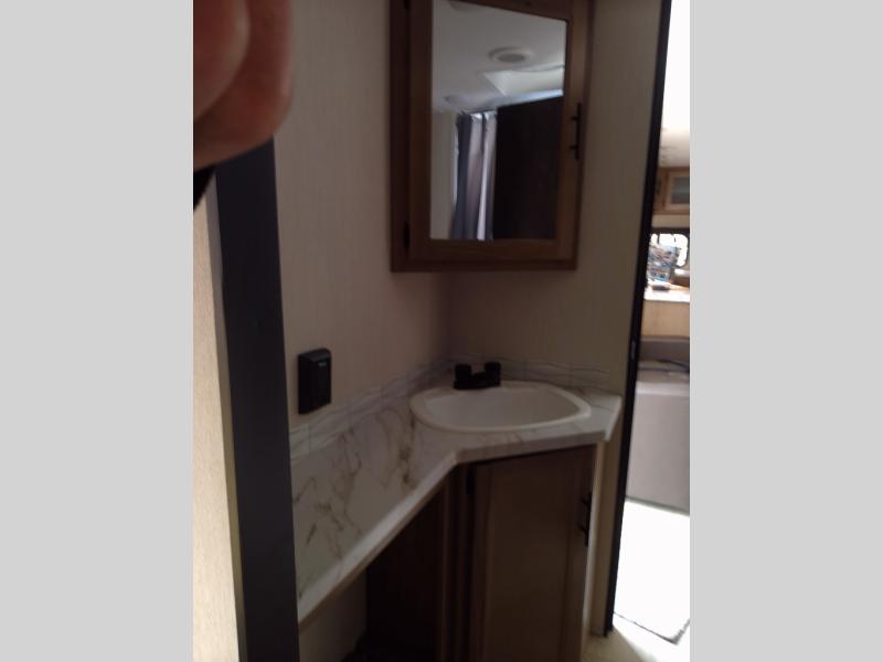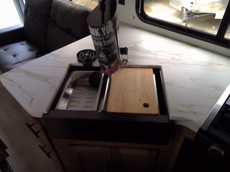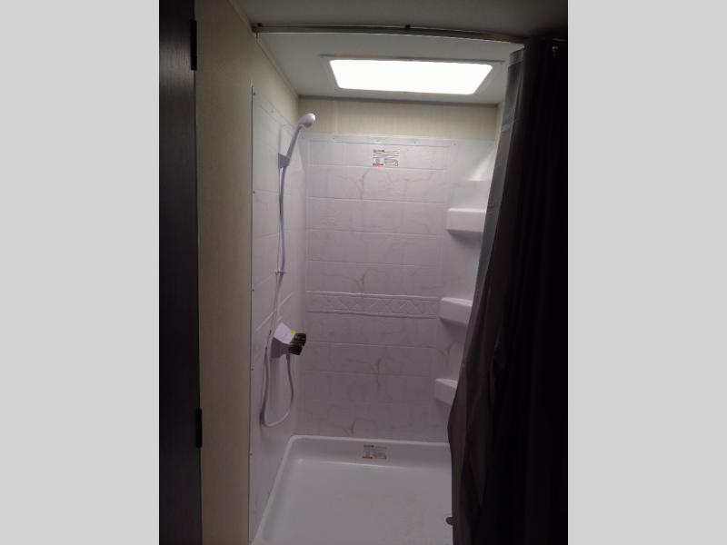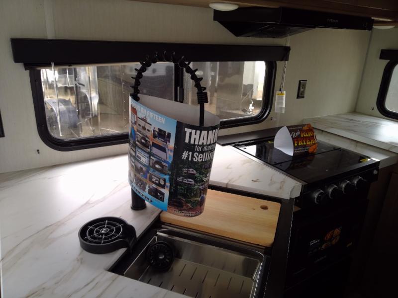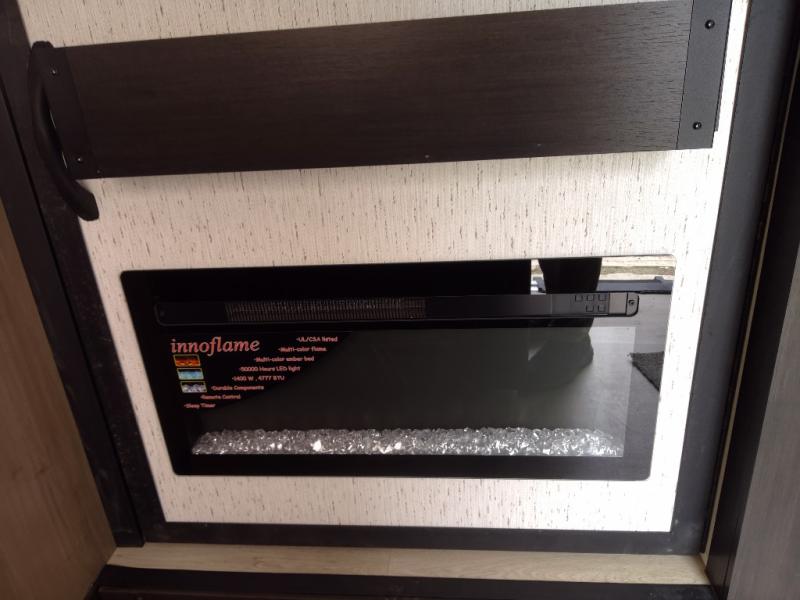 You'll love every minute spent in this single slide out travel trailer, whether you're cooking dinner on the outside kitchen or in the rear kitchen, relaxing on the sofa across from the fireplace, or sleeping on the RV king bed in the front master bedroom! There are hidden shelves behind the fireplace for convenient storage, and the booth dinette within the slide provides a place to dine together. The walk-thru bath is spacious, and includes a tub/shower, toilet, and sink with counter space.