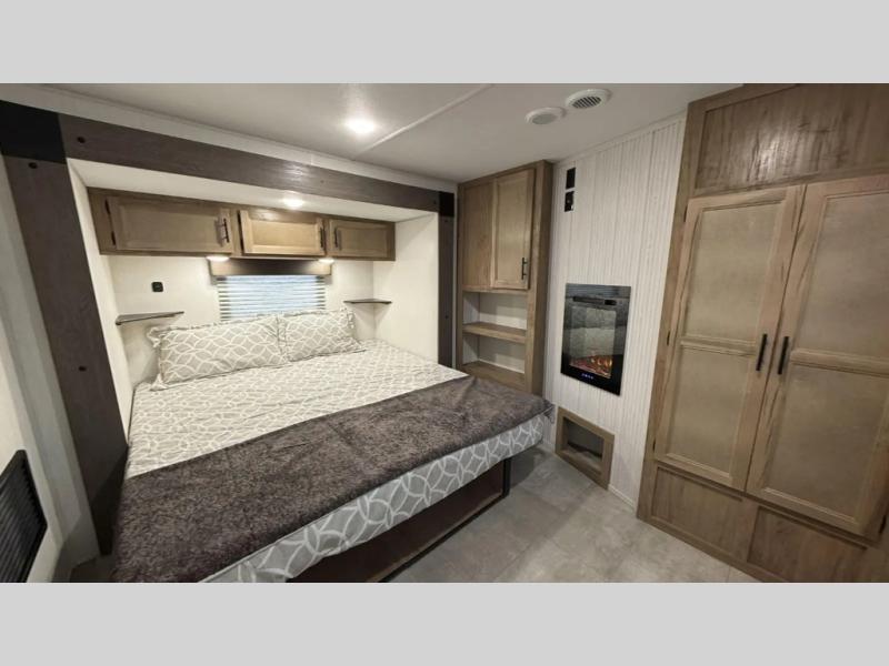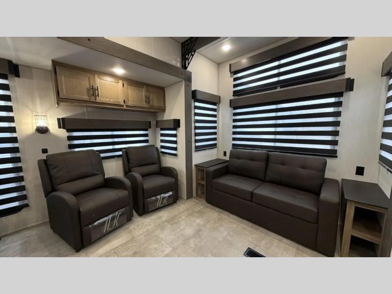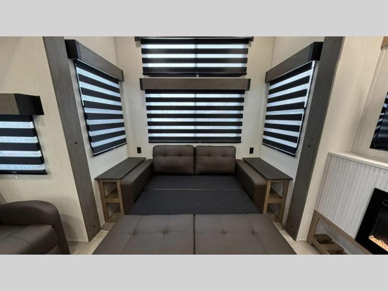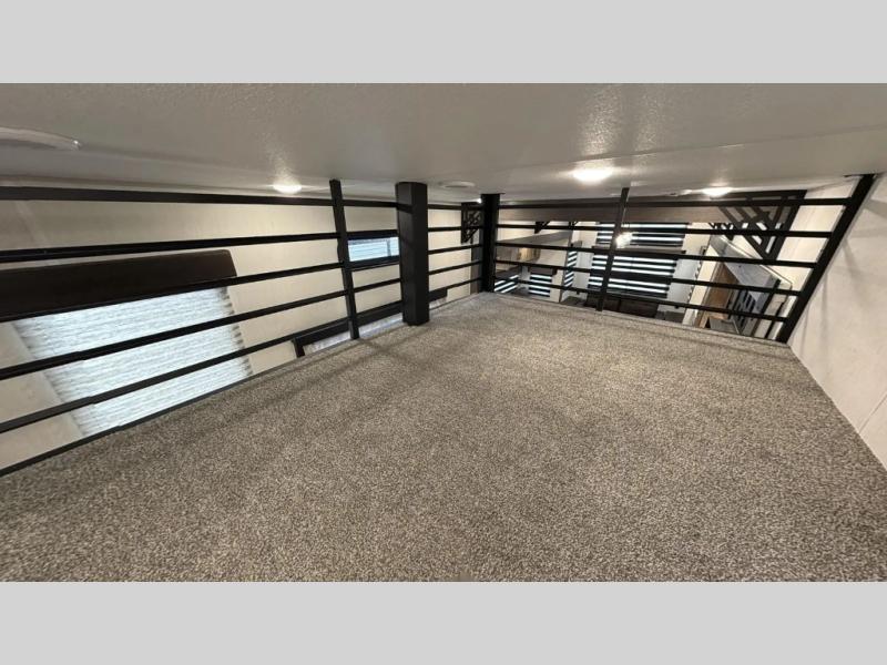 This destination trailer is an excellent and accommodating trailer that will make you feel right at home as soon as you enter through one of the two entry doors. The front private bedroom has a king bed slide and lots of storage with a wardrobe and a linen closet. There is also an entertainment center where you can add your own TV and the bedroom even has a second exterior entry door so that you can come and go as you please. Above the bedroom is where the huge loft is located. When you take the stairs up to the loft, you'll find two 36" x 74" bunk mats, cabinets, and a large open area with a railing. The main living area has a free-standing dinette with chairs, theater seats, and a hide-a-bed sofa, so you will have plenty of seating as you watch the main entertainment center.