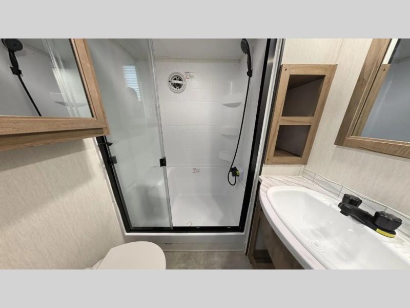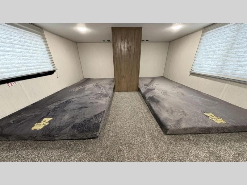 Enjoy comforts of home wherever you decide to roam in a Timberwolf destination trailer by Forest River. The seamless roofing membrane with heat reflectivity and power gear frame technology provide a durable foundation to your RV. You will also appreciate the exclusive solar thermo controlled reflective tinted safety glass windows, tire pressure monitors, and an on-demand tankless water heater to make extended stays easier than ever. Inside, the night shades will provide your crew with privacy, while the LED lights illuminate your space. There are also seamless countertops, along with a premium bedding ensemble and comforter, USB charging stations, a supersized central A/C unit, and many more comforts!