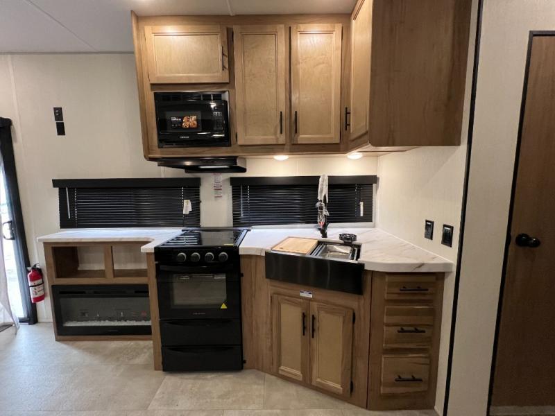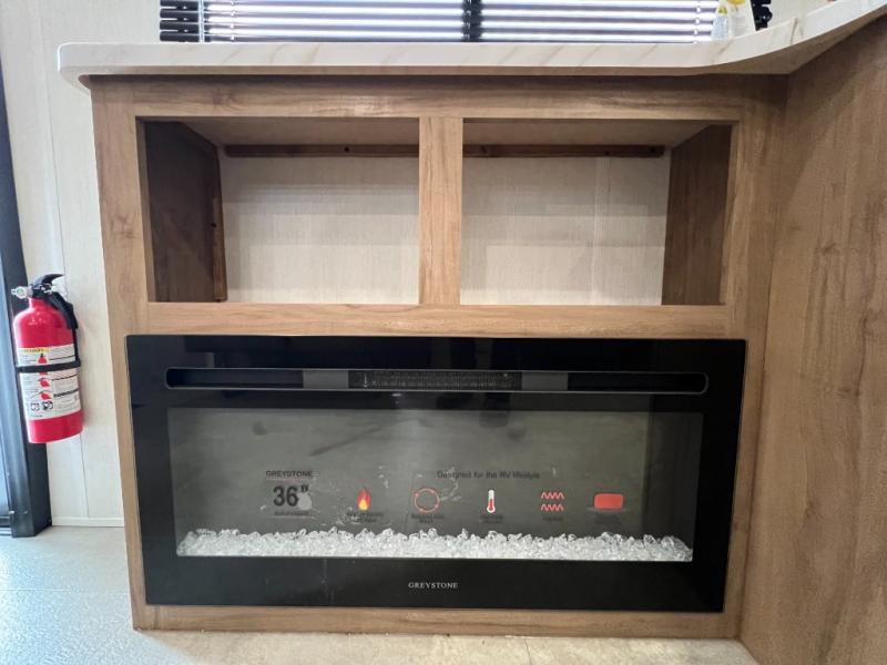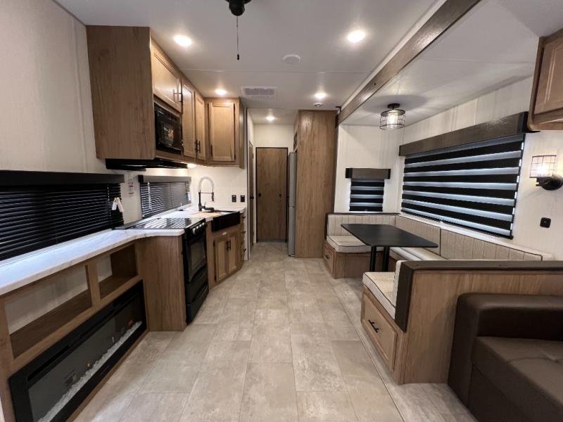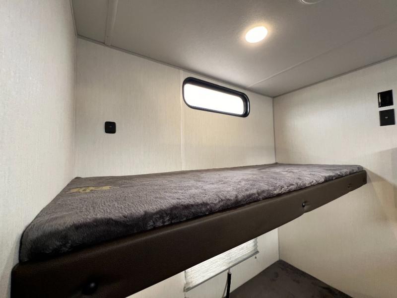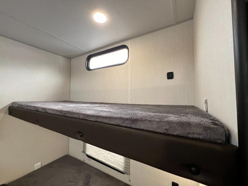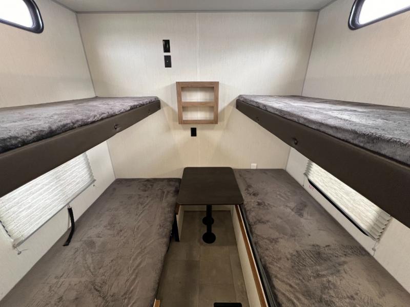 Ten can easily sleep in this destination travel trailer featuring a bunkhouse, large slide in the living area which creates a wide open space for a U-shaped dinette and sofa where you can enjoy the entertainment center with a fireplace. The kitchen is fully equipped with everything needed to create meals and snacks for your whole crew, and the walk-in pantry is great for storing all of your non-perishables. This space also features optional washer/dryer prep. In the very back, the bunkhouse features comfortable sleeping with double bunks on one side and double bunks with a hinged platform along the opposite side that the kids are sure to love. Up front, a side aisle bath featuring a shower with a seat, a vanity with medicine cabinet, and a toilet. You will also love the outside TV mount and 18' power awning space to create a nice size outdoor living area to enjoy on sunny days or pleasant evenings.