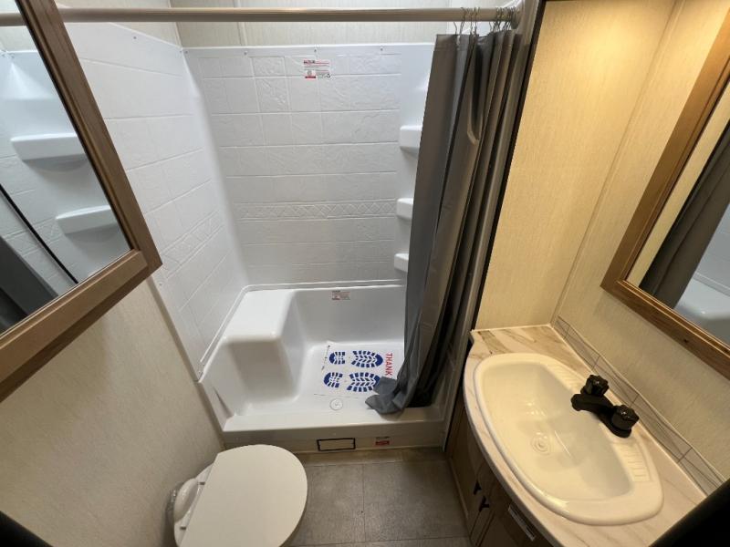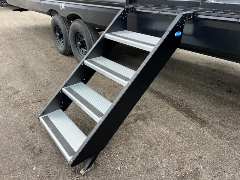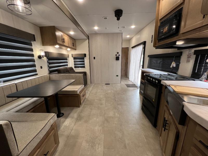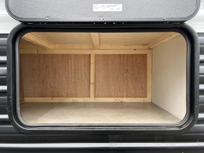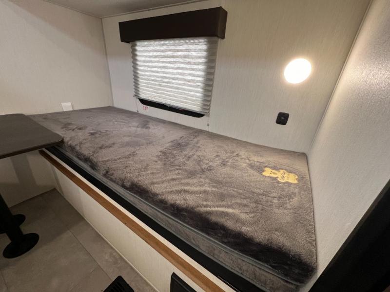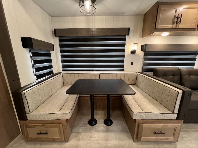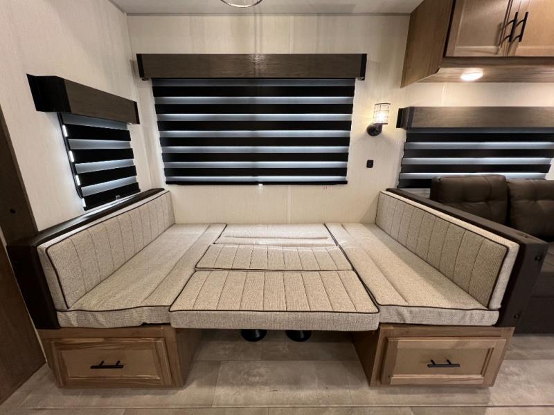Ten can easily sleep in this destination travel trailer featuring a bunkhouse, large slide in the living area which creates a wide open space for a U-shaped dinette and sofa where you can enjoy the entertainment center with a fireplace. The kitchen is fully equipped with everything needed to create meals and snacks for your whole crew, and the walk-in pantry is great for storing all of your non-perishables. This space also features optional washer/dryer prep. In the very back, the bunkhouse features comfortable sleeping with double bunks on one side and double bunks with a hinged platform along the opposite side that the kids are sure to love. Up front, a side aisle bath featuring a shower with a seat, a vanity with medicine cabinet, and a toilet. You will also love the outside TV mount and 18' power awning space to create a nice size outdoor living area to enjoy on sunny days or pleasant evenings.