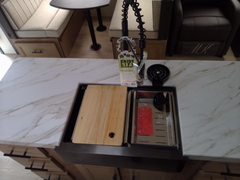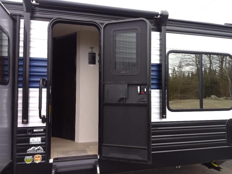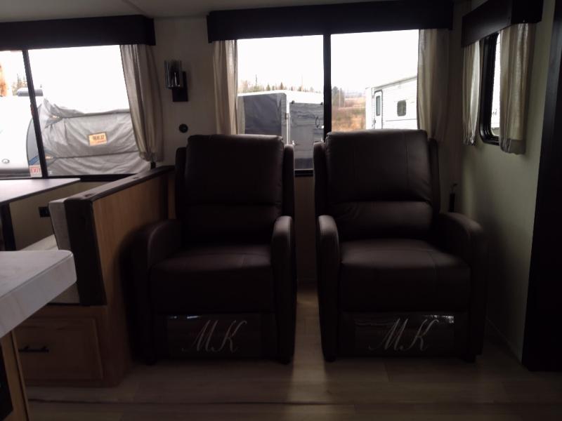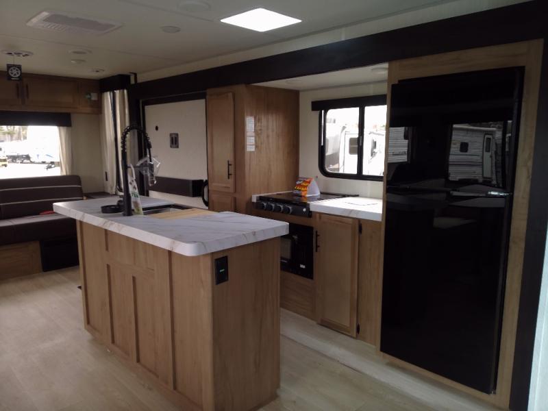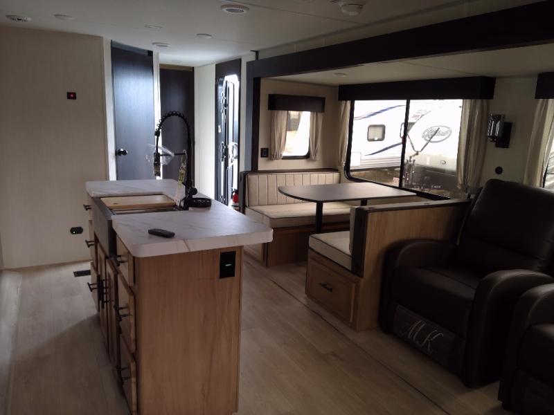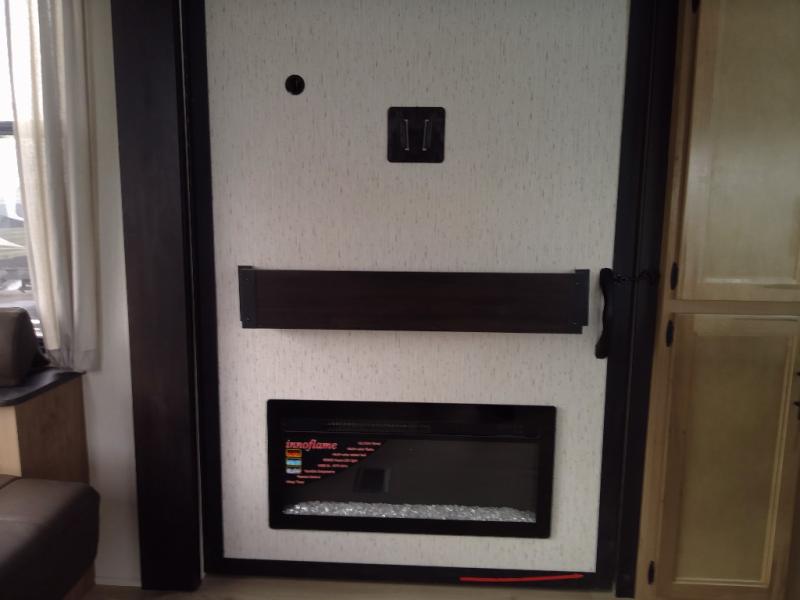 You'll love every minute spent in this double slide out travel trailer. You can relax on the rear sofa or dual lounge chairs, play a game at the booth dinette, and enjoy the glow of the fireplace. The chef of your group will appreciate the kitchen island, air fryer, plus 12V refrigerator and pantry for food storage. A dual entry bath will create a front master bedroom, complete with an RV king bed and dual wardrobes to keep your space tidy.
