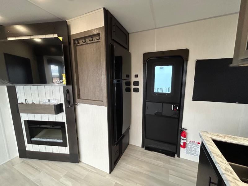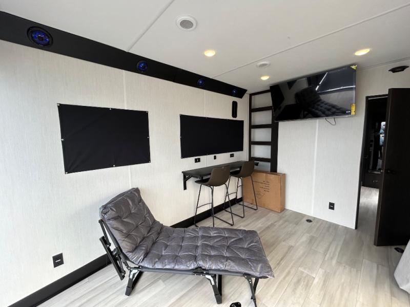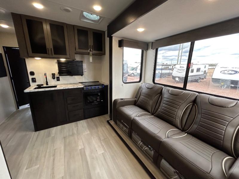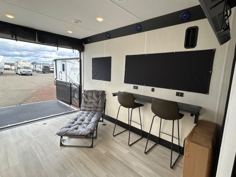 You can't go wrong in this spacious toy hauler with a 12' 6" garage! There is a flip-up counter with stools where you can eat each day, or you can take your plate outdoors to eat under the 21' power awning. The combined kitchen and living area includes a sofa slide out, appliances to make meals each day, and an entertainment center with a fireplace. There is also a pantry and drawers hidden behind the TV for smart storage spaces. The king bed is sure to provide a great night's rest, and there are dual nightstands and dual wardrobes to keep your things tidy.