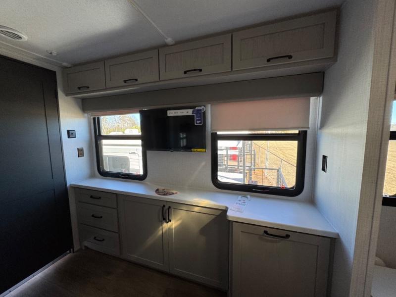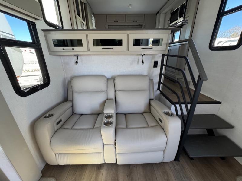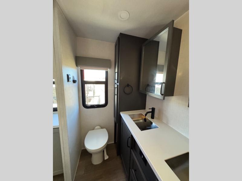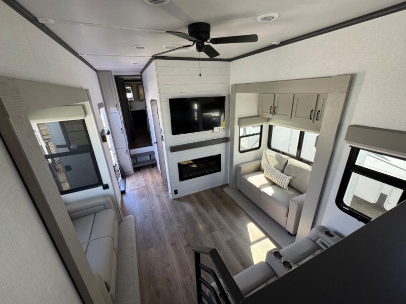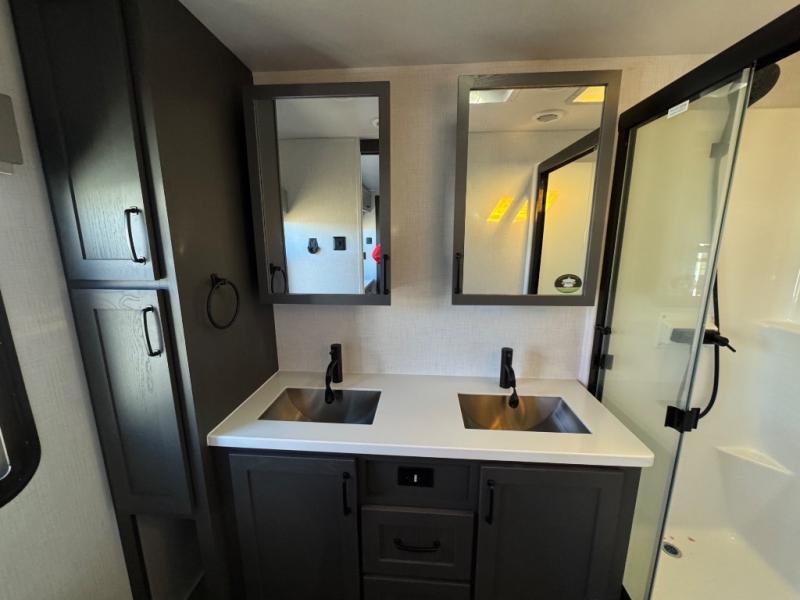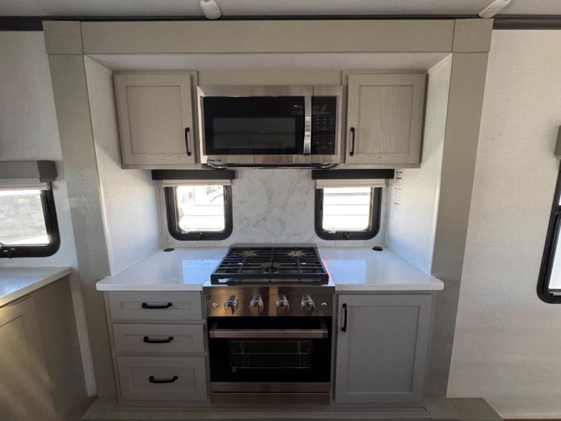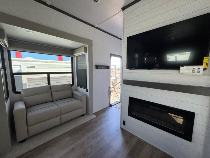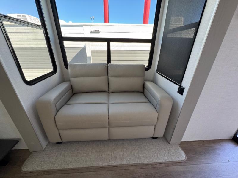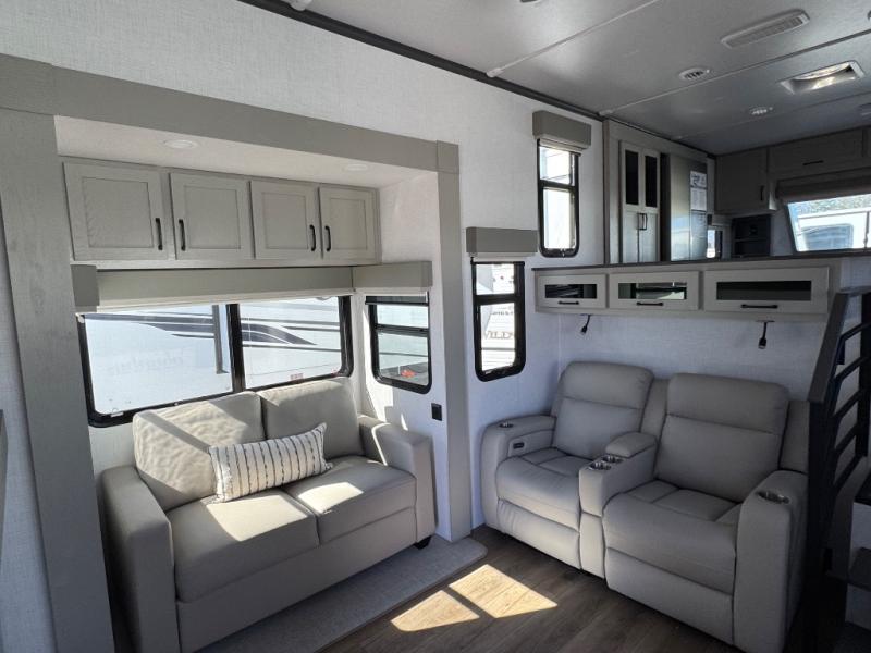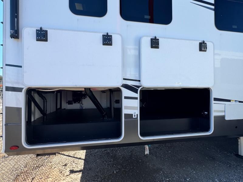 The front kitchen in this fifth wheel is a chef's dream come true while camping! There is generous counter space up front and beside the range, plus a pantry and 12V 18 cu. ft. 3-door refrigerator with ice. There is also a hi-top table with two bar stools that overlooks the living area. Inside the living area there are opposing sofa sleeper slides and power theater seating across from an entertainment center with a 50" Smart TV. A mid-coach half bath is easily accessible, and the full rear bath with dual bath sinks will create a master bedroom you are sure to love. There is a king bed slide out, a wardrobe, hamper, and a TV/storage.