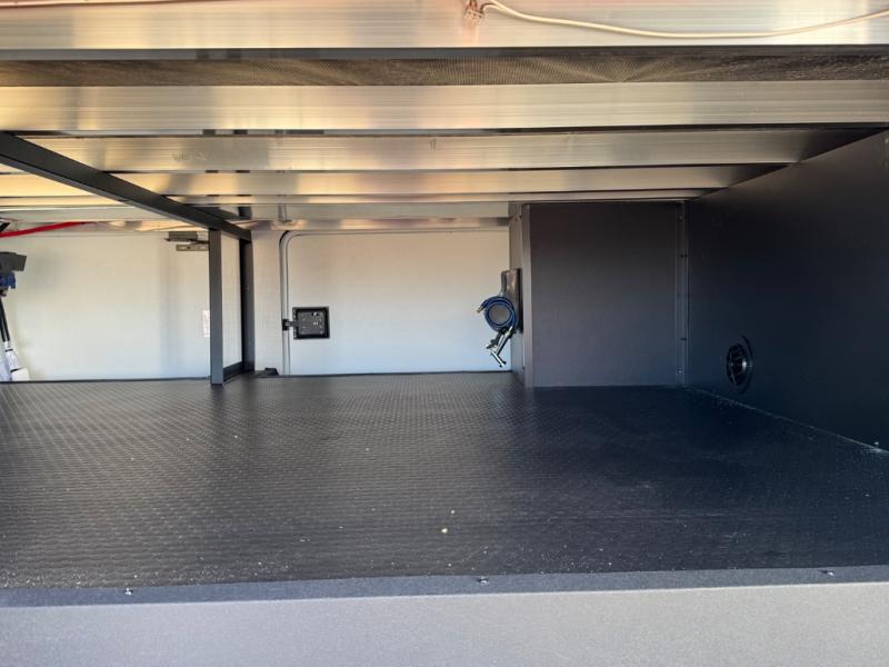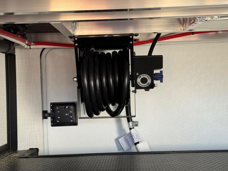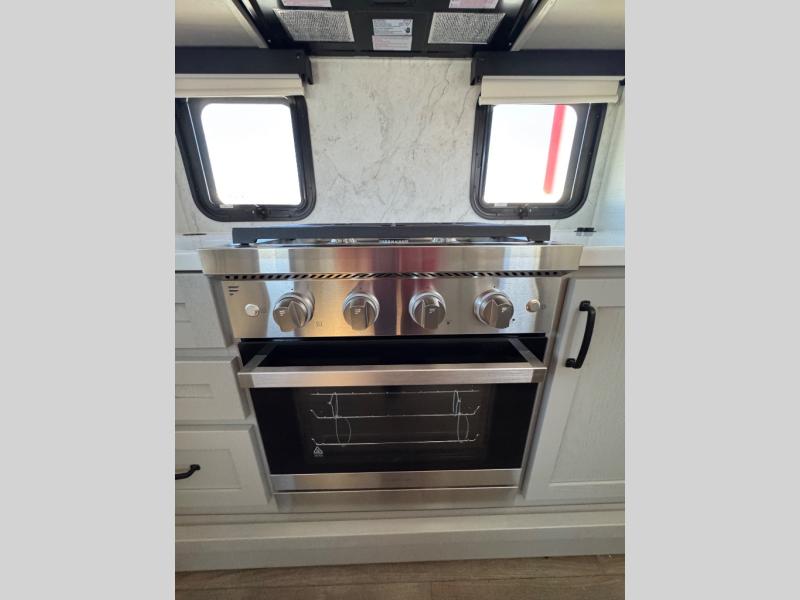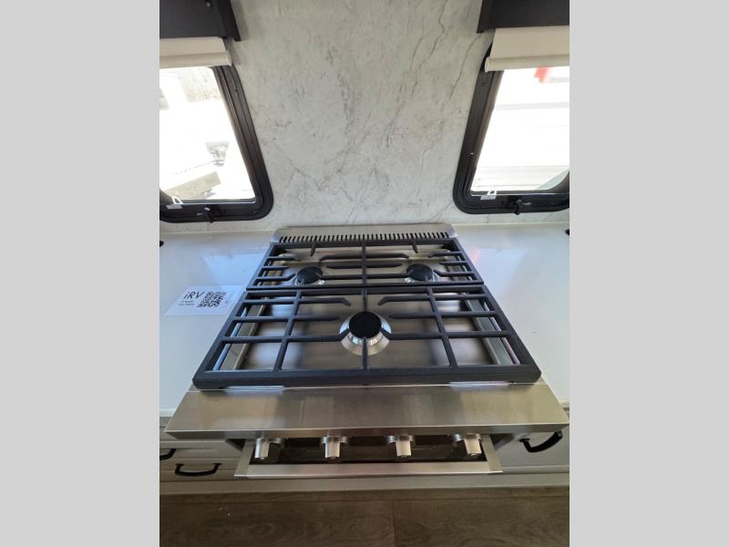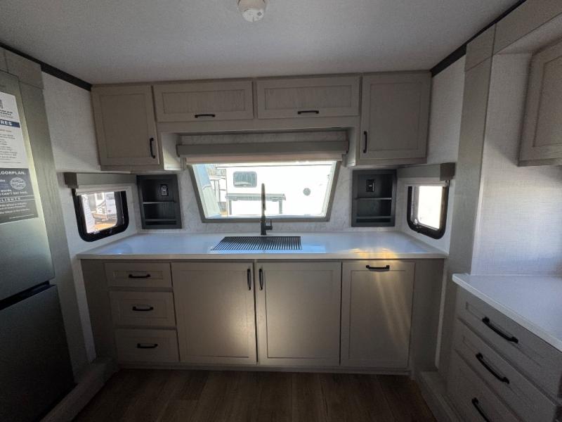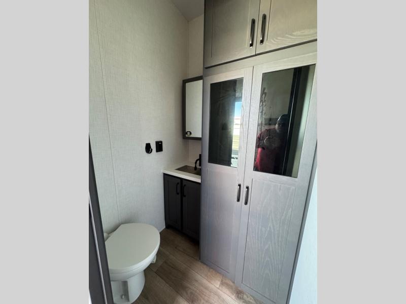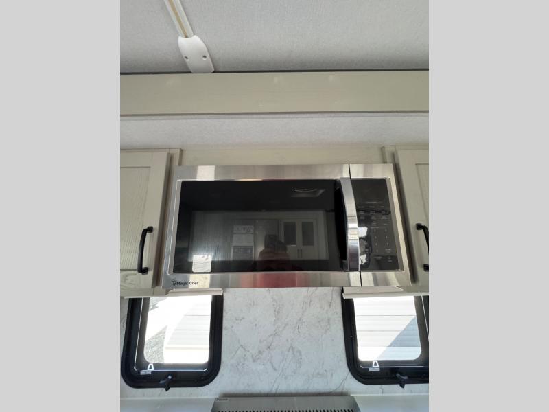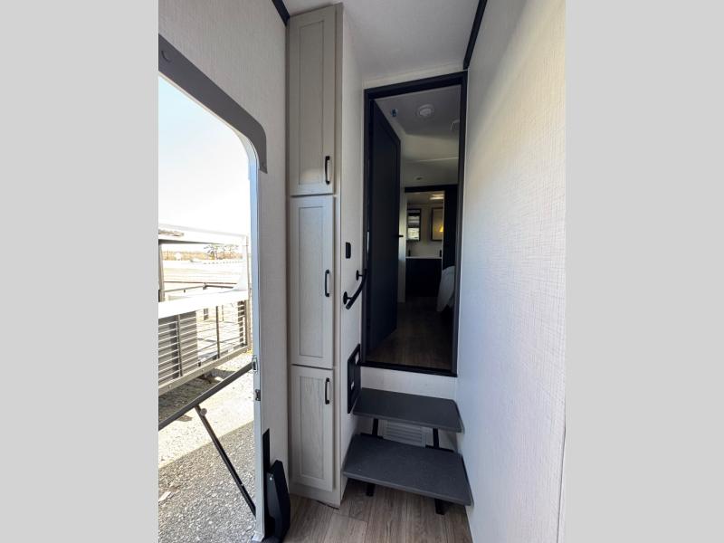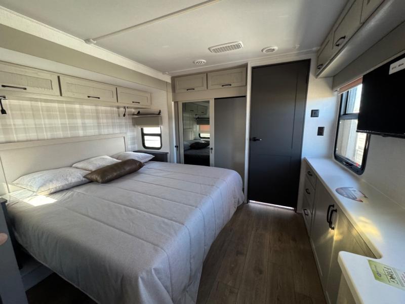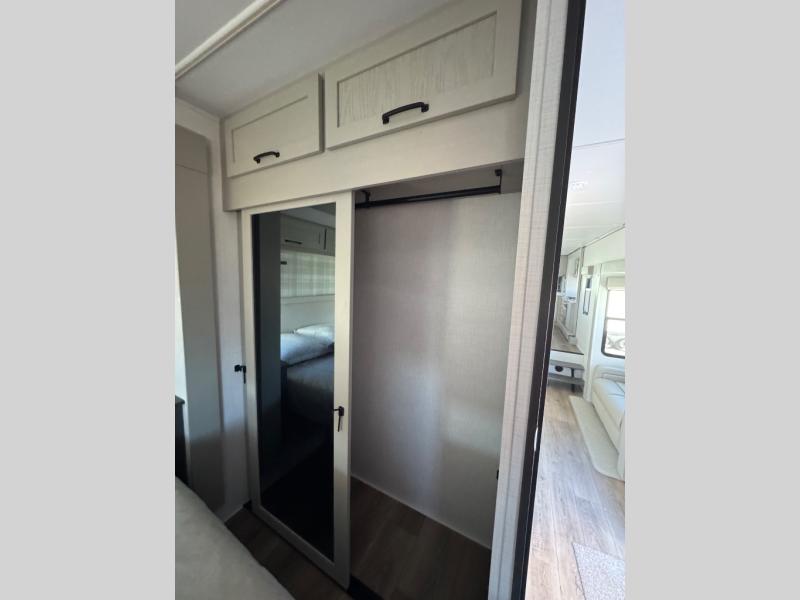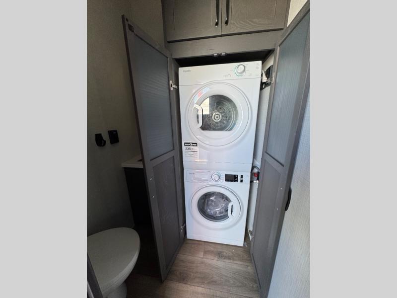 The front kitchen in this fifth wheel is a chef's dream come true while camping! There is generous counter space up front and beside the range, plus a pantry and 12V 18 cu. ft. 3-door refrigerator with ice. There is also a hi-top table with two bar stools that overlooks the living area. Inside the living area there are opposing sofa sleeper slides and power theater seating across from an entertainment center with a 50" Smart TV. A mid-coach half bath is easily accessible, and the full rear bath with dual bath sinks will create a master bedroom you are sure to love. There is a king bed slide out, a wardrobe, hamper, and a TV/storage.