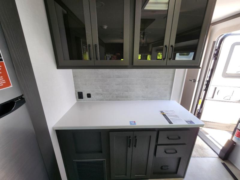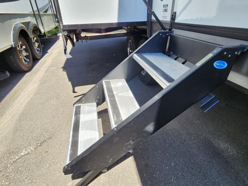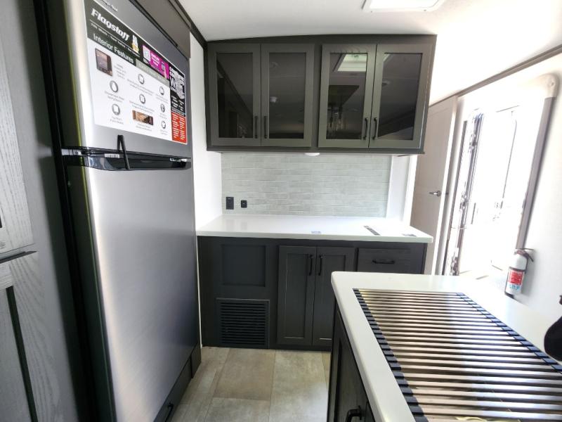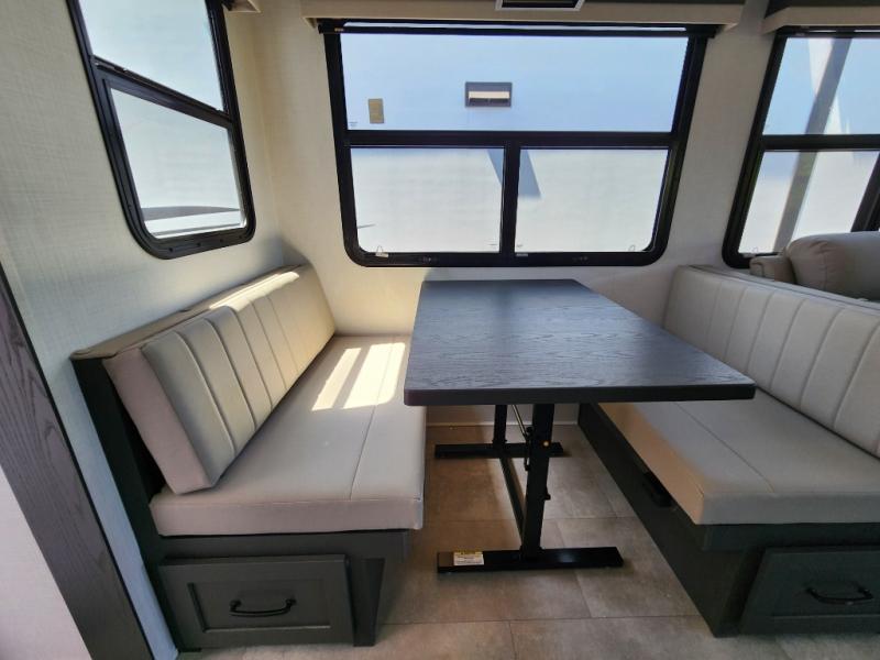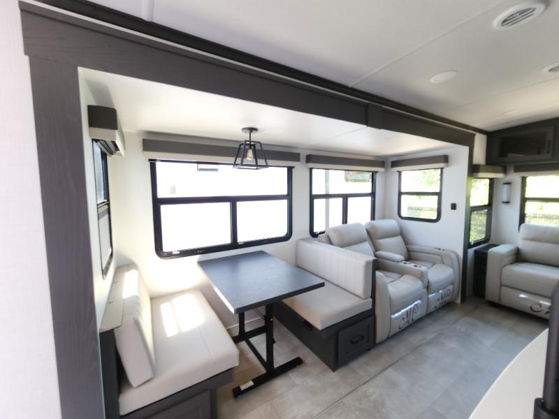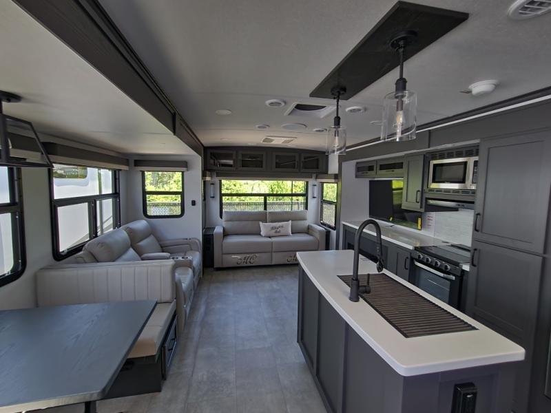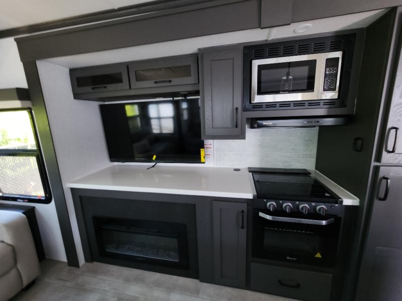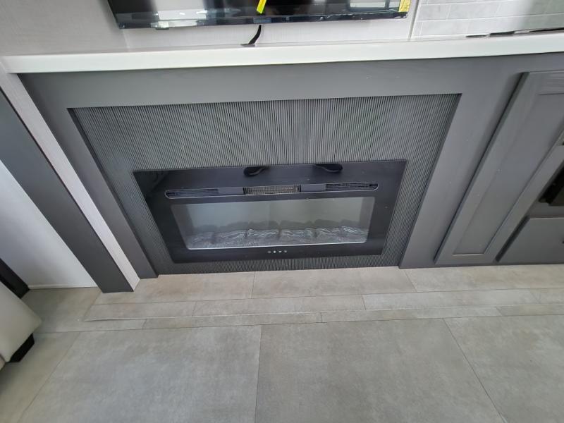 The large windows in the rear and door side slide will bring nature's scenery indoors with this travel trailer! Everyone can relax together in the rear living area featuring a 76" hide-a-bed sofa and 60" theater seating across from the entertainment center with a fireplace. Meal prepping will be even easier with the kitchen island, and the 39" booth dinette is a comfortable place to enjoy your meals. The full bathroom has a shower with a seat and a linen closet to keep your towels close. You will feel well rested each morning after sleeping on the king bed slide in the front private bedroom which also has a wardrobe with washer and dryer prep and an area to add an optional TV!