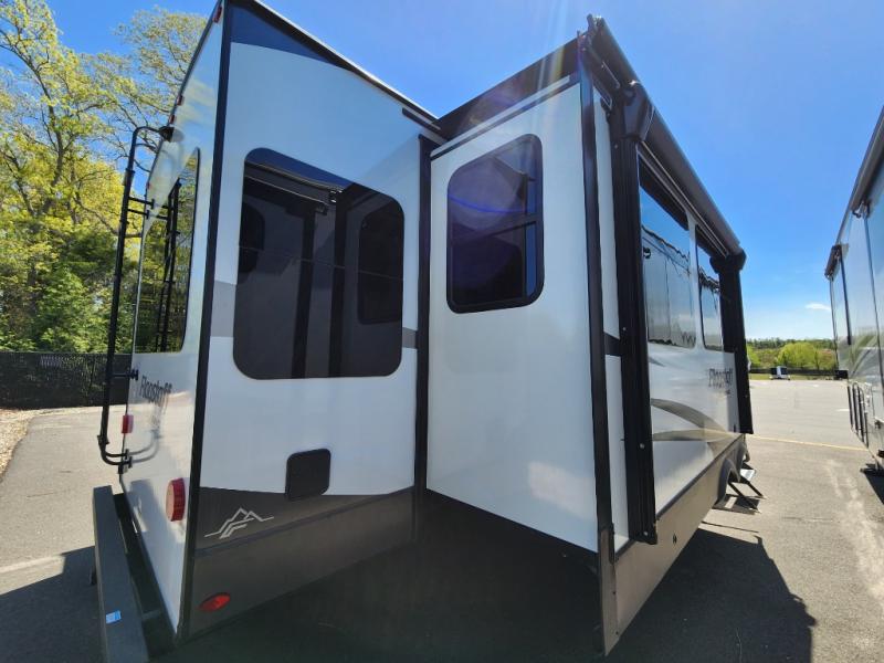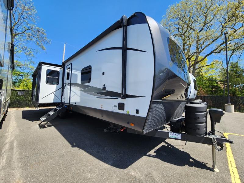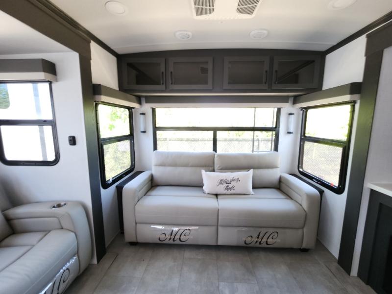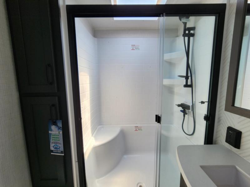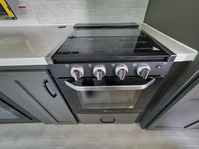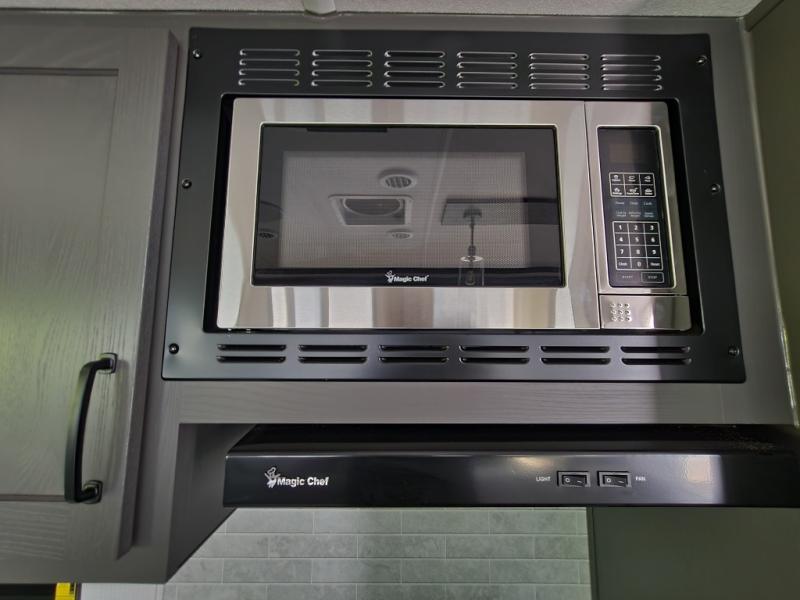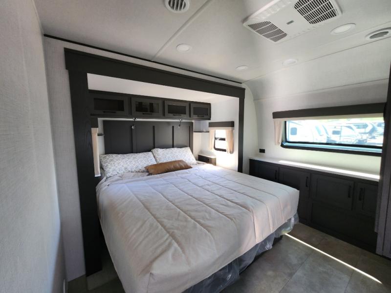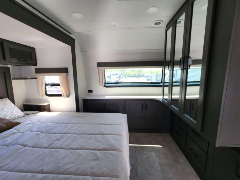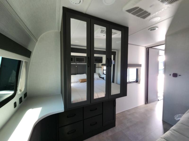 The large windows in the rear and door side slide will bring nature's scenery indoors with this travel trailer! Everyone can relax together in the rear living area featuring a 76" hide-a-bed sofa and 60" theater seating across from the entertainment center with a fireplace. Meal prepping will be even easier with the kitchen island, and the 39" booth dinette is a comfortable place to enjoy your meals. The full bathroom has a shower with a seat and a linen closet to keep your towels close. You will feel well rested each morning after sleeping on the king bed slide in the front private bedroom which also has a wardrobe with washer and dryer prep and an area to add an optional TV!