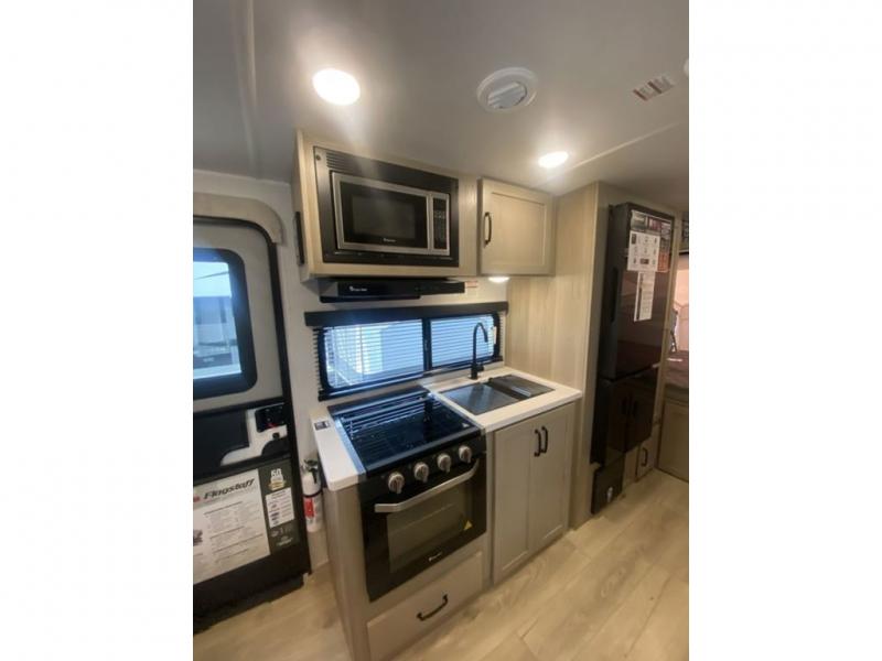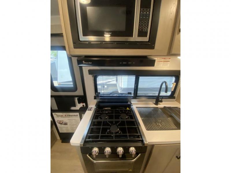 Each Flagstaff Shamrock expandable by Forest River includes an enclosed underbelly, interior and exterior composite sidewall construction, and a vinyl/rubber composite roofing membrane for added durability. The power tongue jack will make hitching up easier than ever, and the torsion axle, Rubber-Ryde suspension and Goodyear Endurance tires will provide smooth towing. You will also appreciate having a 200W roof solar panel with a 1800W inverter, an outside spray port, Keyed-Alike locks, plus many more exterior conveniences. The interior is made to feel more like home with solid wood cabinet doors and drawers, marine grade carpet in the slides, Sedona Wood cabinetry, plus seamless kitchen countertops.