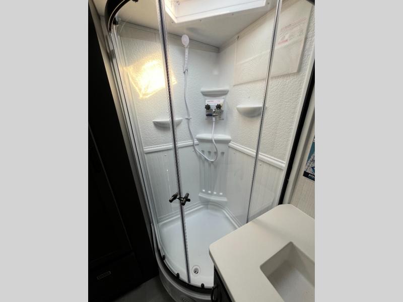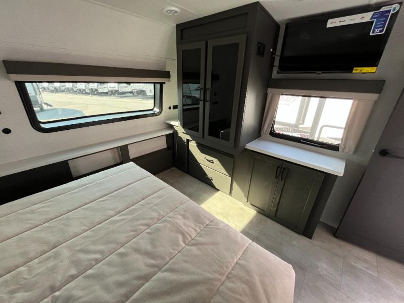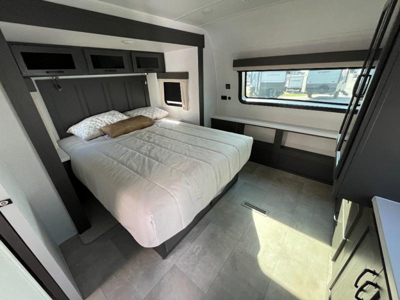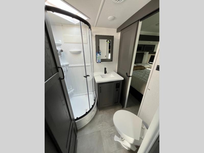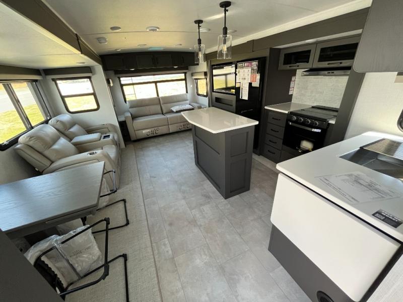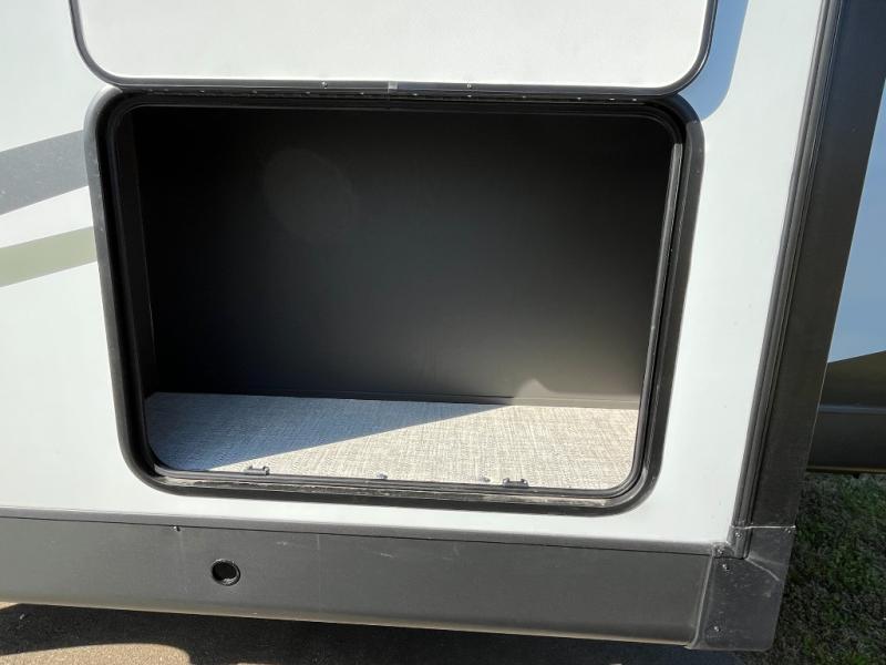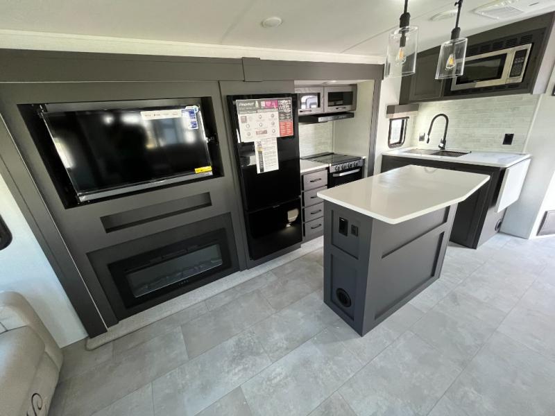 If you enjoy entertaining friends while camping, this trailer offers seating for nine in the combined living and kitchen area on the hide-a-bed sofa, the theater seats and the booth dinette. Everyone can visit, watch the Smart TV and enjoy the fireplace all while the cook is preparing snacks in the kitchen with full amenities. The full bathroom has two entries for convenience, and the front bedroom offers a queen bed slide with a king bed option, plus plenty of storage. And the two 11' awnings offer an outdoor living area after you add your camping chairs.