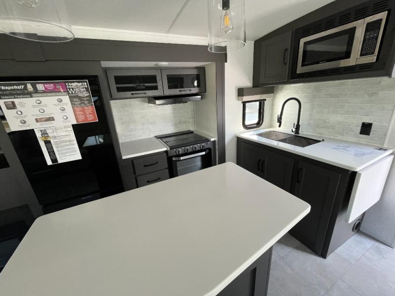 With any Flagstaff Super Lite travel trailer by Forest River the towing features include the TST tire pressure monitor system with a monitor providing safety on the road, Easy Lube axles and Nev-R adjust brakes, a power tongue jack for easy setup, and rear observation camera prep. Each is built with 6 sided aluminum framed side walls, end wall, front, floor and a roof, a plywood tongue and groove subfloor, electronically controlled heated holding tanks and an enclosed underbelly allowing you to travel during any season. The interior includes designer kitchen backsplash, solid surface kitchen countertops, Sedonwood cabinetry, and solid wood cabinet doors and drawers to make you feel right at home.