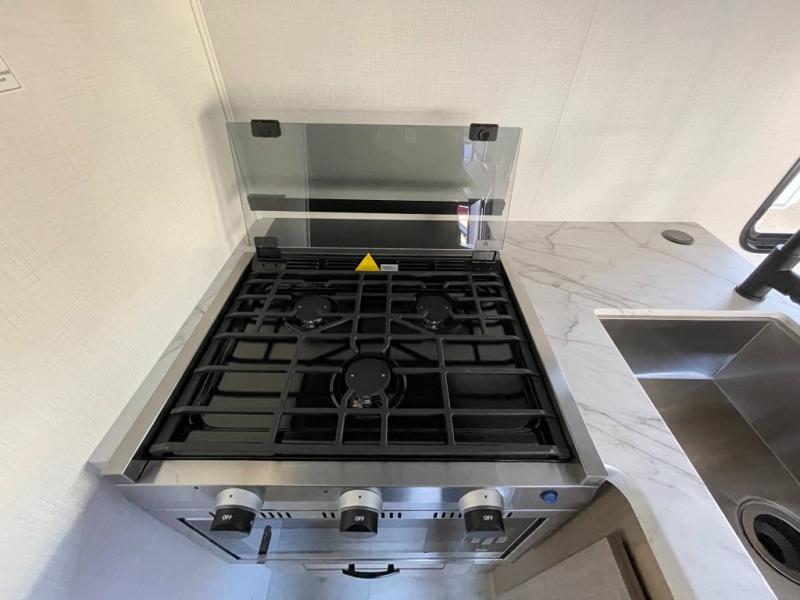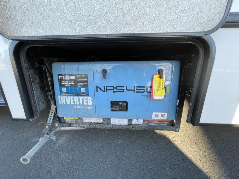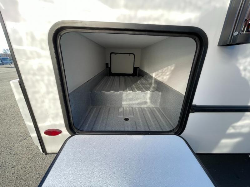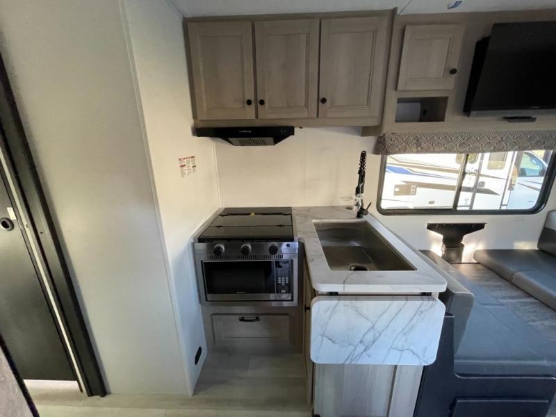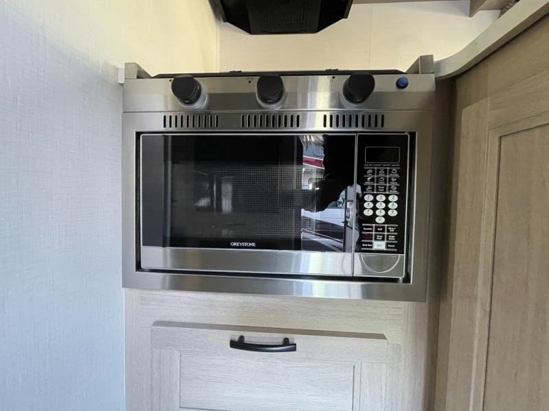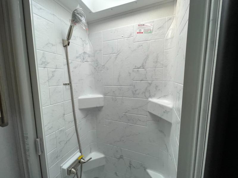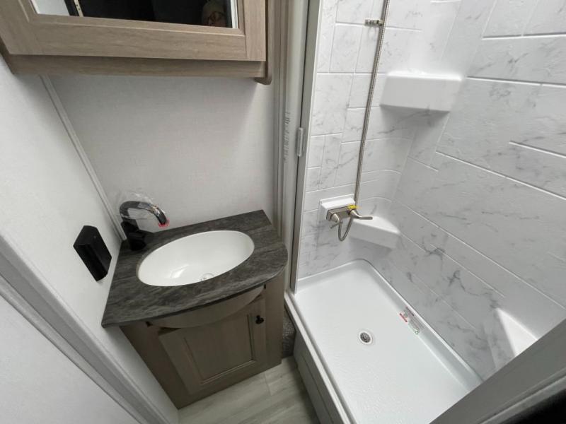 Every trip in this coach will be a trip well spent! You can relax on the sofa across from the 12V TV once you park for the evening, and there is a booth dinette to play a game of cards at. The chef can whip up dinner on the three burner range or in the 1.3 cu. ft. convection microwave, and the 10.7 cu. ft. 12V refrigerator will hold your leftovers perfectly. This model includes a private shower and sink with the private toilet right across the hall so two people can get ready for bed at once, and the rear bedroom will feel just like home with its RV queen bed and dual wardrobes.