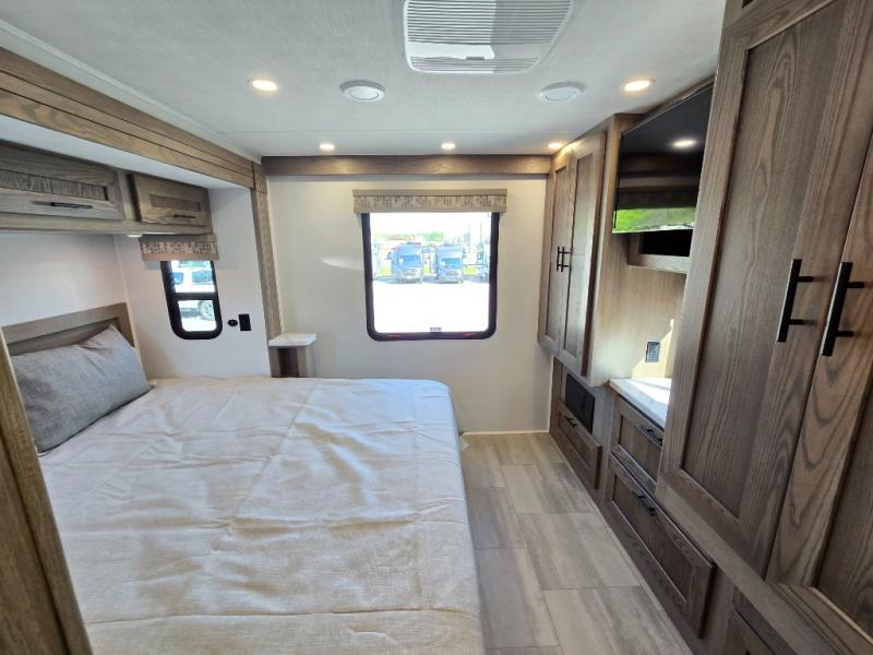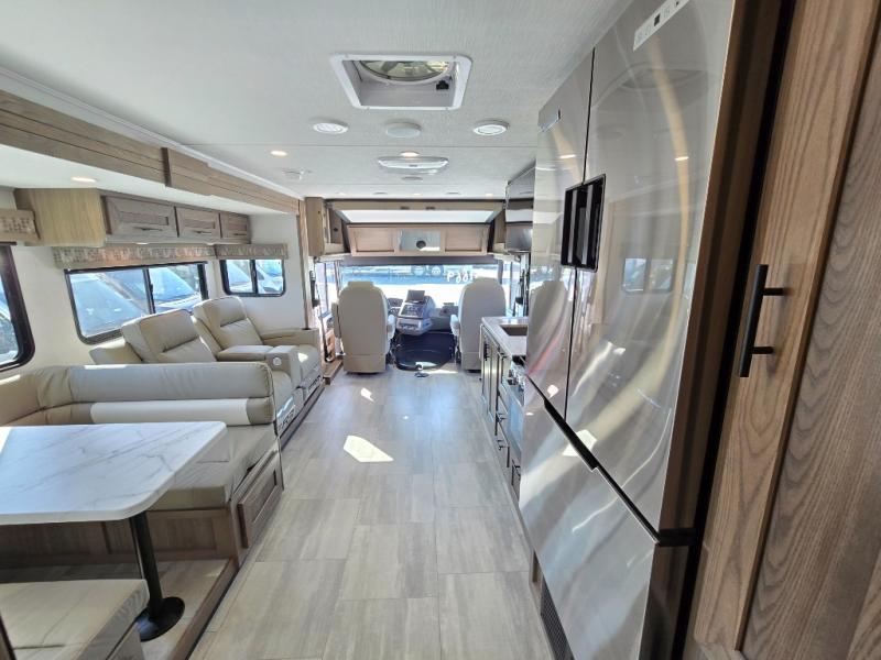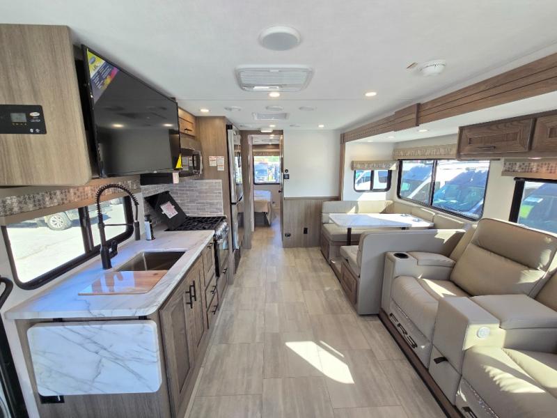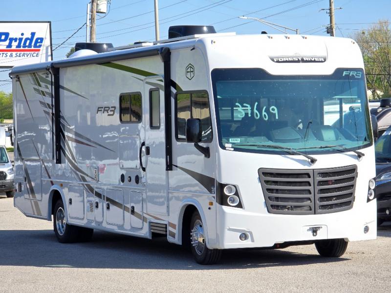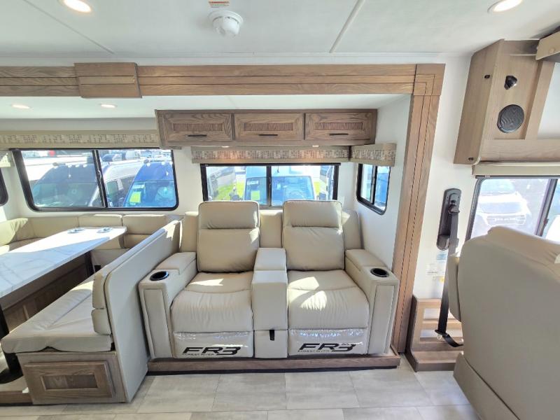 With each FR3 Class A gas motorhome by Forest River, you will find an easy-to-drive coach with a spacious interior allowing you to gather with friends and family with convenience and style found throughout! Each is built with vacuum-bonded construction, a one-piece fiberglass roof with extended rain spouts, a steel firewall and A-pillar extension, Bi-LED headlamps and lower LED fog lights, and grey Rotocast storage boxes with drains. Inside, you will enjoy black hardware, appliances, plumbing fixtures, and a glass shower door frame. You will also find a stainless steel kitchen sink with a bamboo cutting board and roll-up dryer, heavy-duty full-extension ball bearing drawer guides, dual-access dinette storage with doors, and nightstands with charging stations to keep your cellphones ready for whatever is next. Make your selection today!