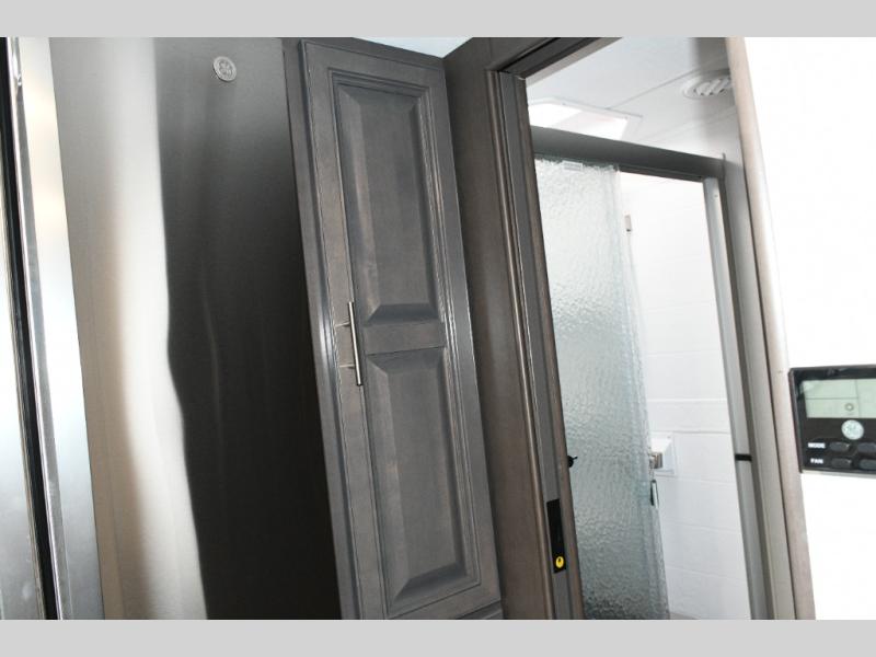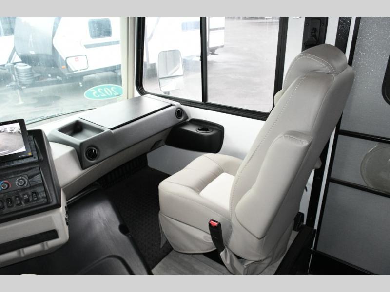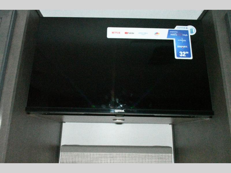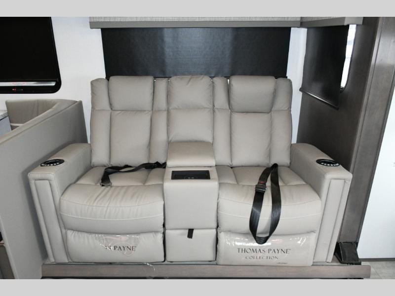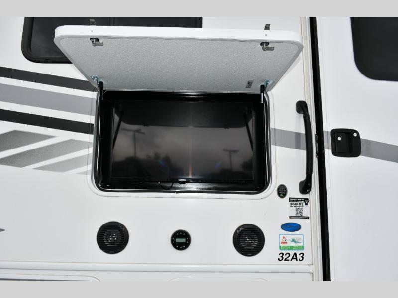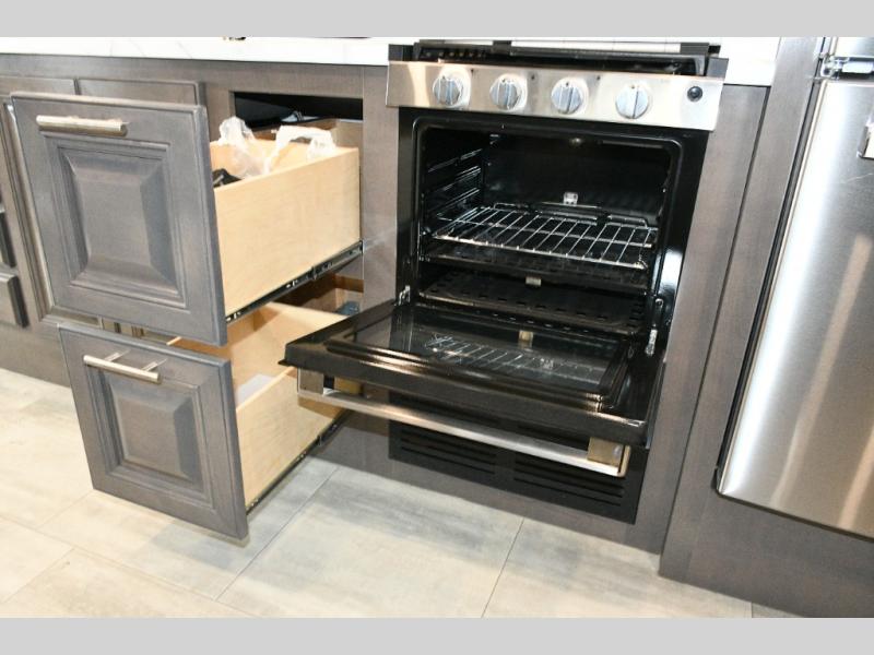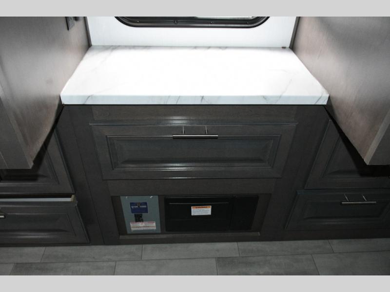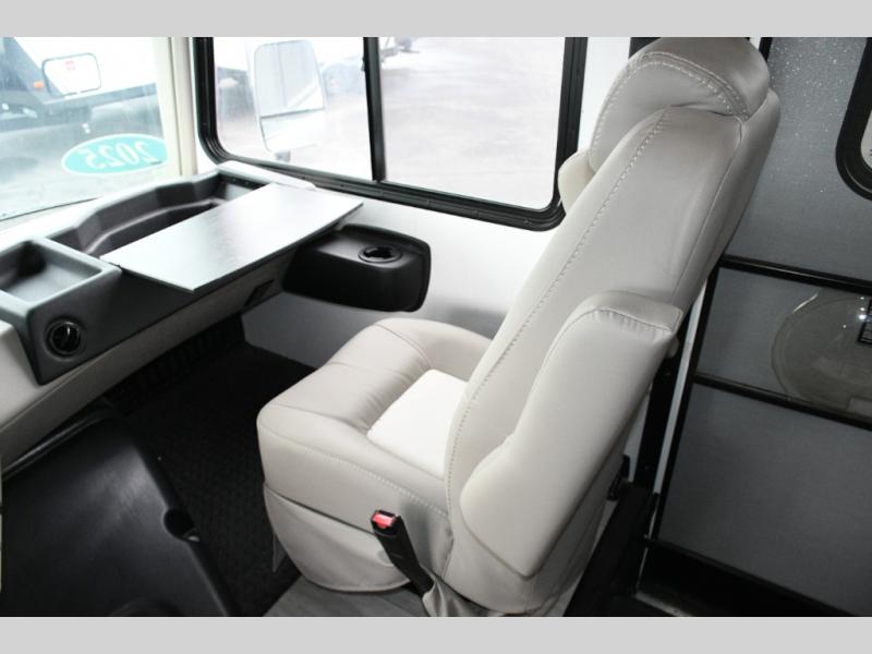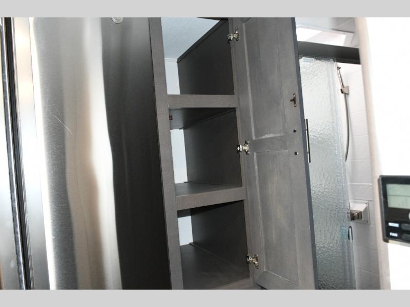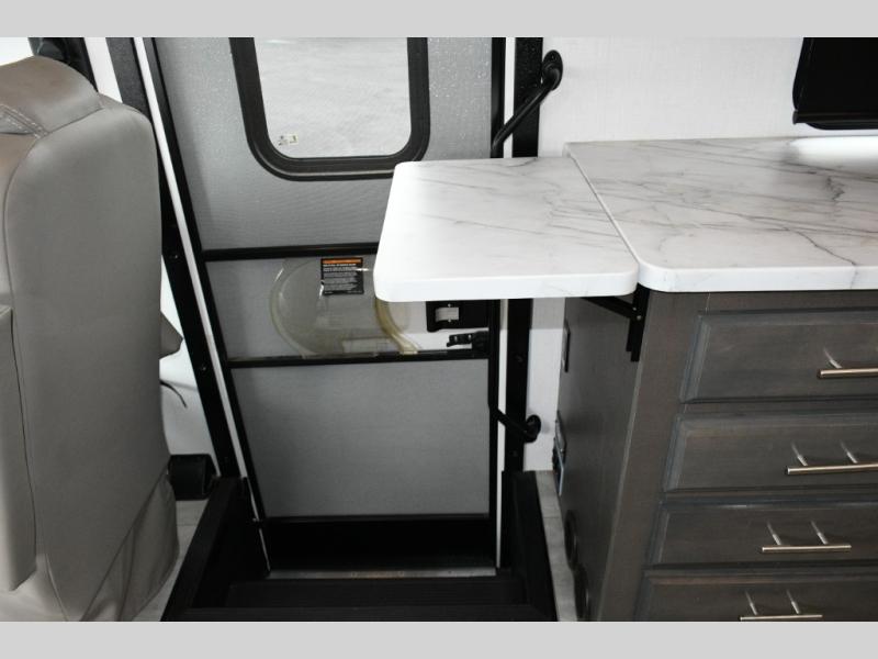 The galley kitchen is equipped for every meal, featuring a three-burner cooktop, large 18 cu. ft. residential refrigerator, microwave, and pantry with shelves. Outside, enjoy entertainment on the exterior system, or take advantage of the solar panel and controller to stay powered while off-grid. The passenger workstation allows you to work or plan your next adventure while on the road.