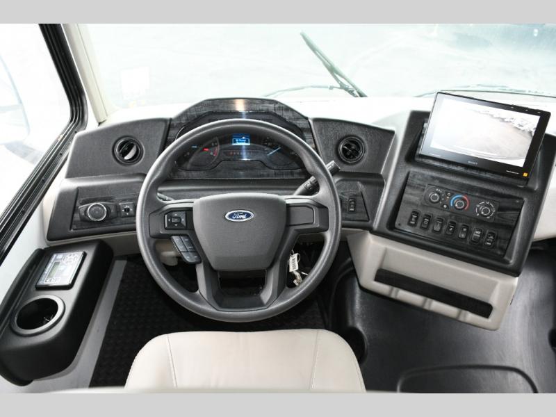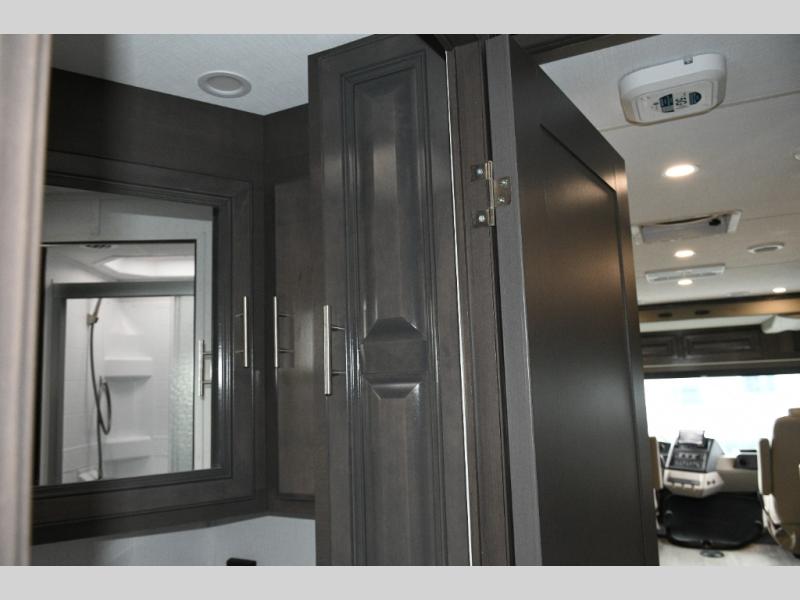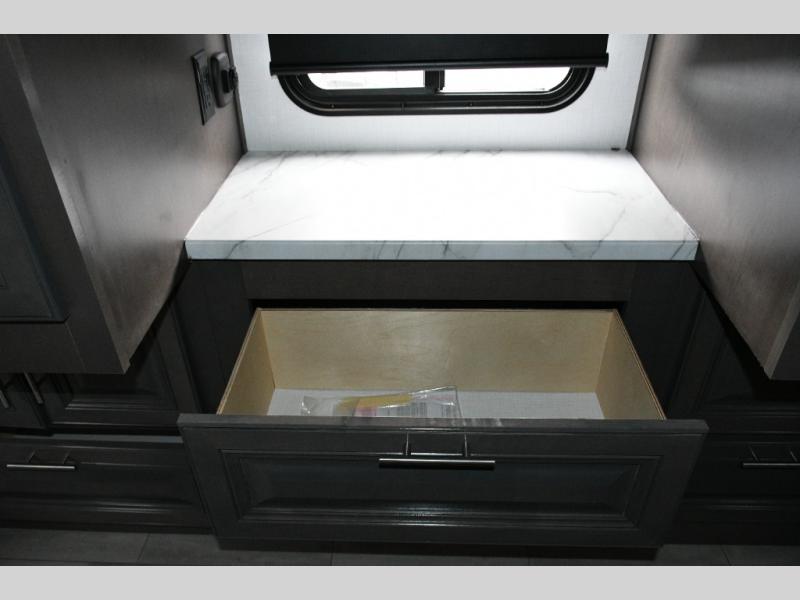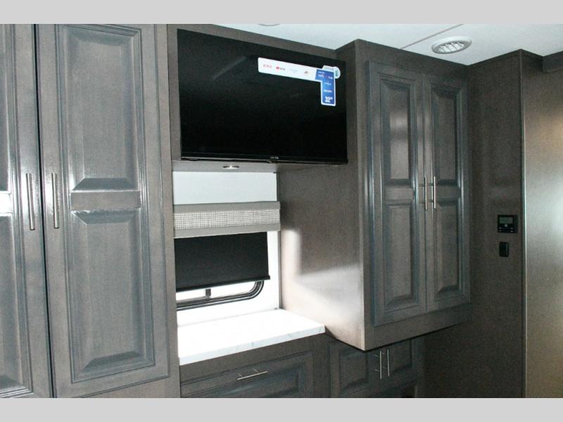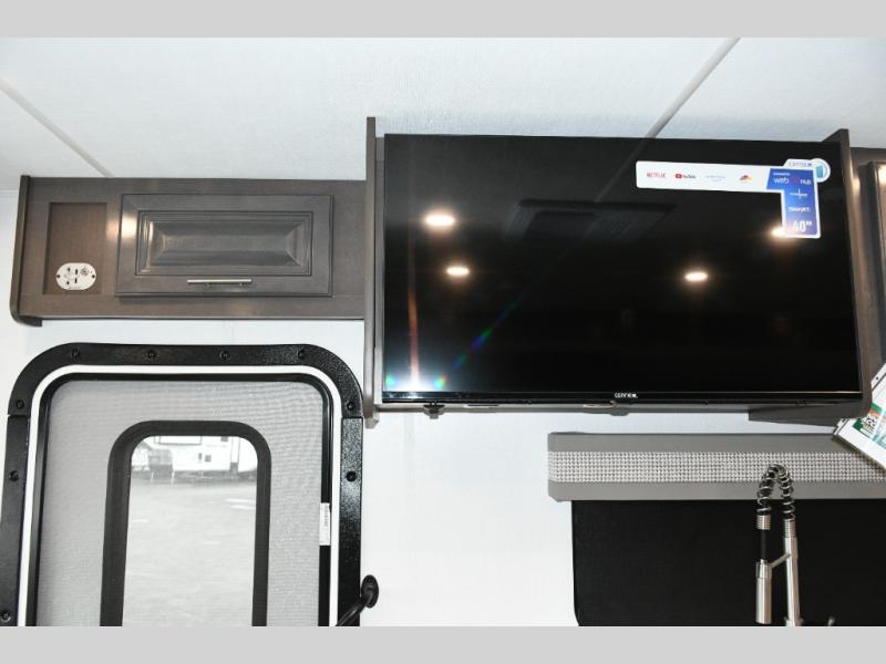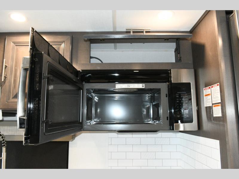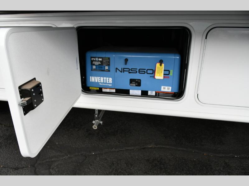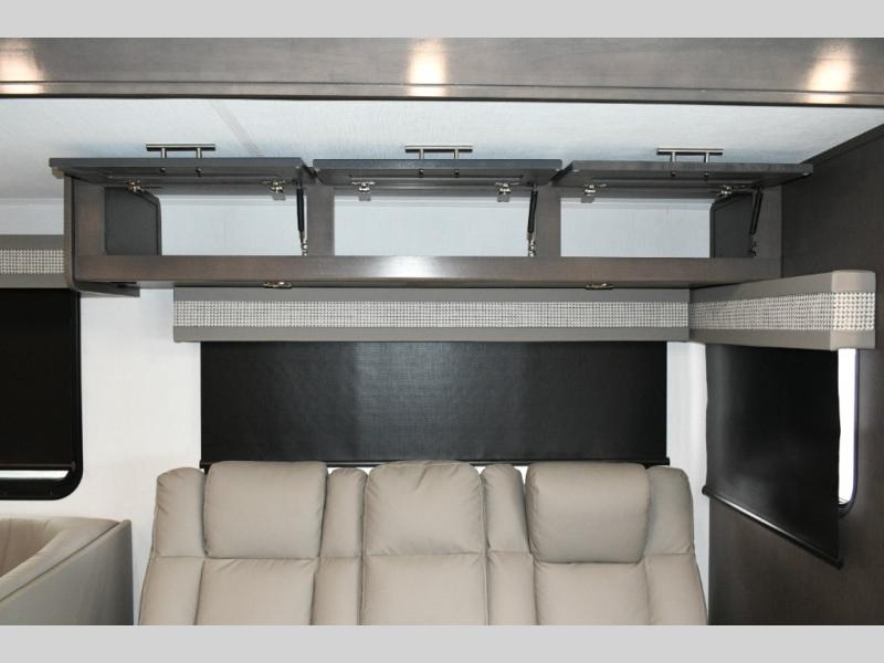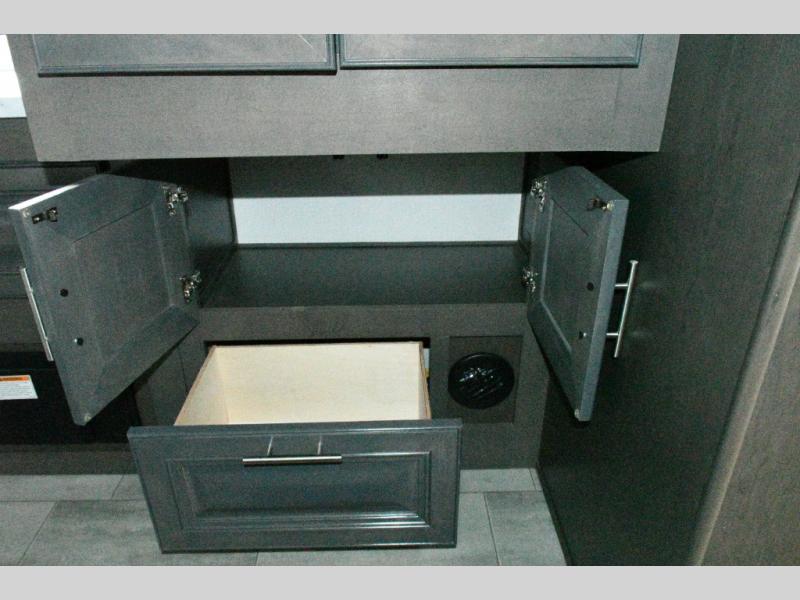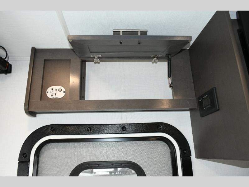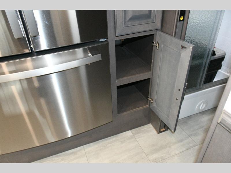 The galley kitchen is equipped for every meal, featuring a three-burner cooktop, large 18 cu. ft. residential refrigerator, microwave, and pantry with shelves. Outside, enjoy entertainment on the exterior system, or take advantage of the solar panel and controller to stay powered while off-grid. The passenger workstation allows you to work or plan your next adventure while on the road.