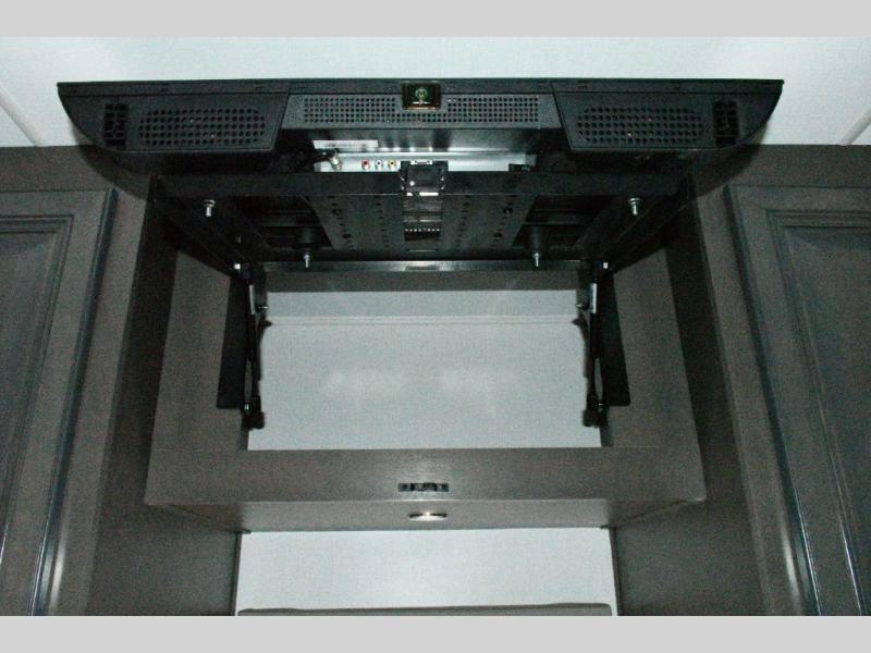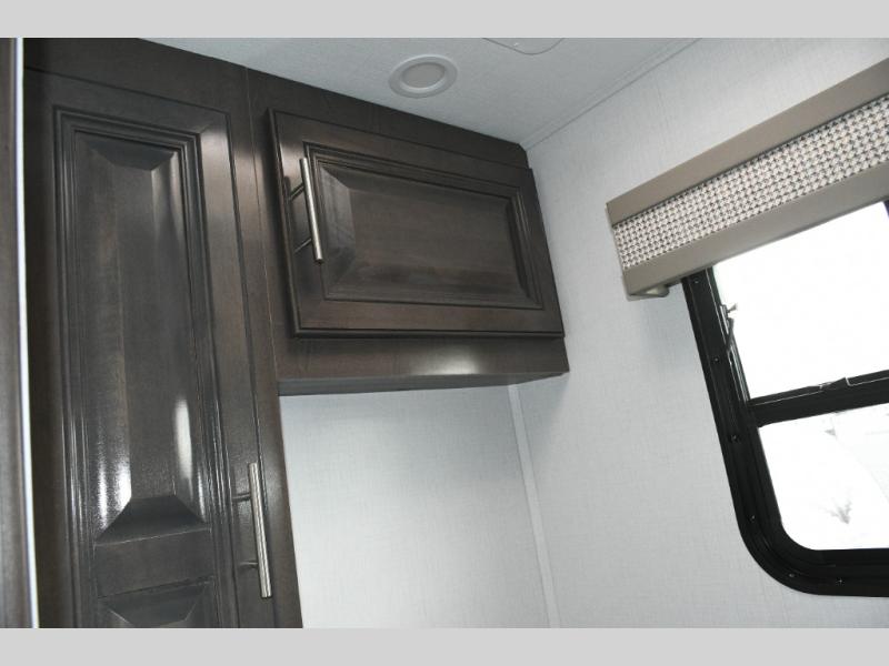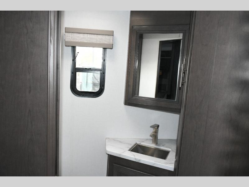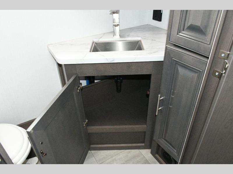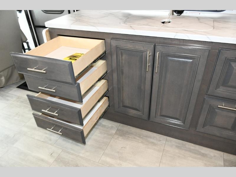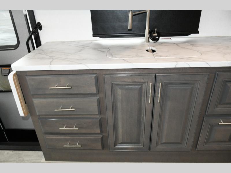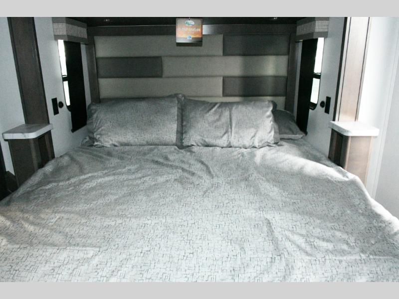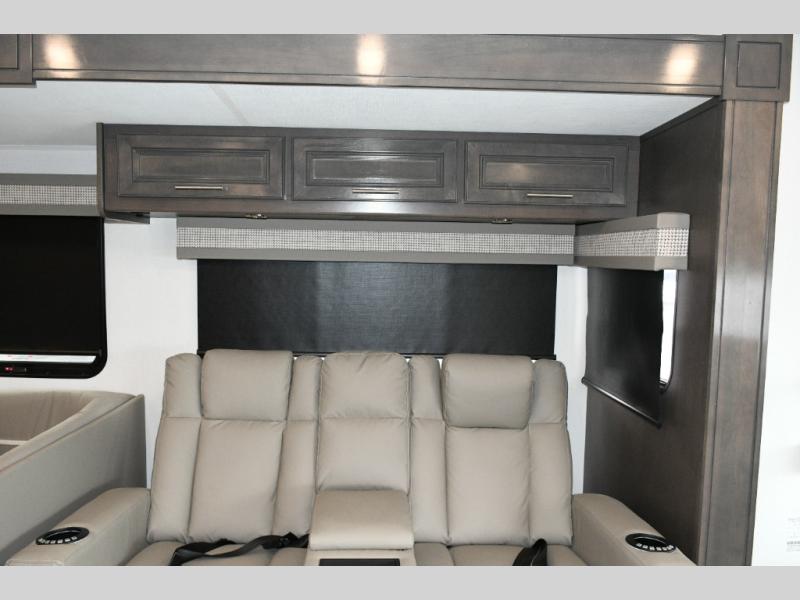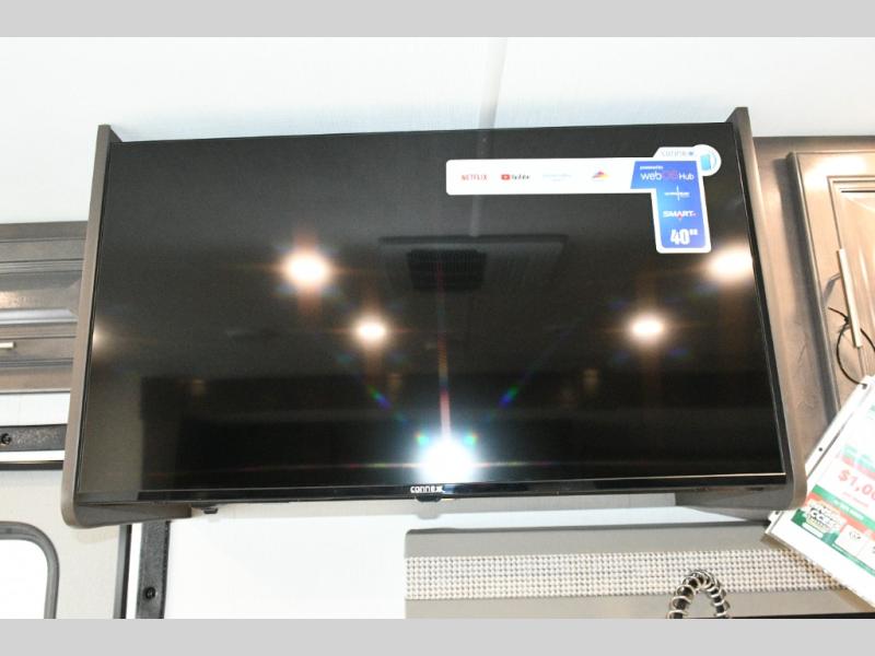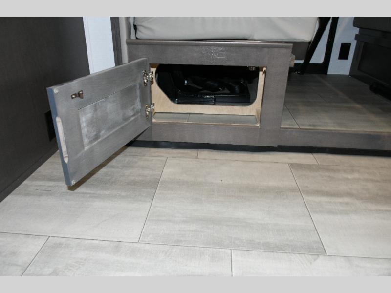 The galley kitchen is equipped for every meal, featuring a three-burner cooktop, large 18 cu. ft. residential refrigerator, microwave, and pantry with shelves. Outside, enjoy entertainment on the exterior system, or take advantage of the solar panel and controller to stay powered while off-grid. The passenger workstation allows you to work or plan your next adventure while on the road.