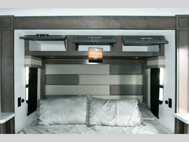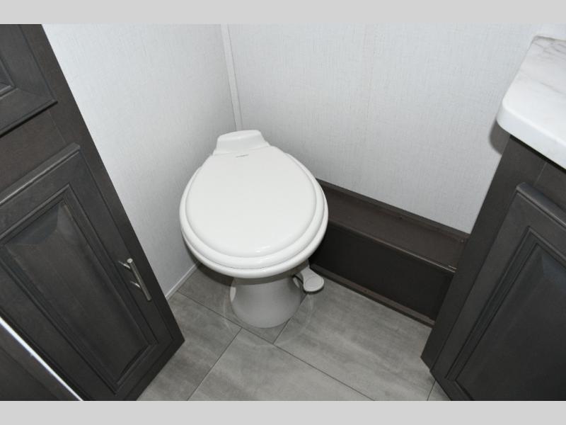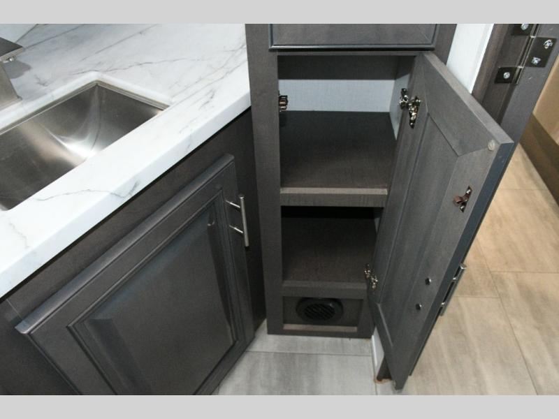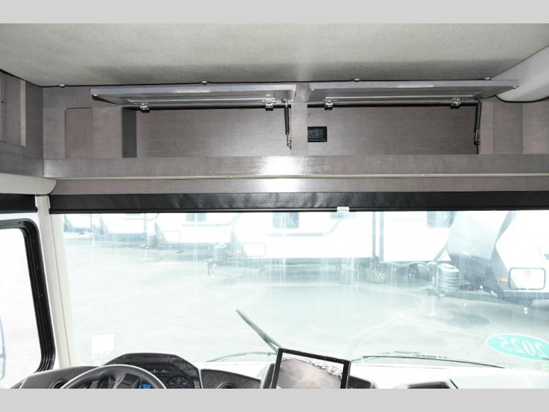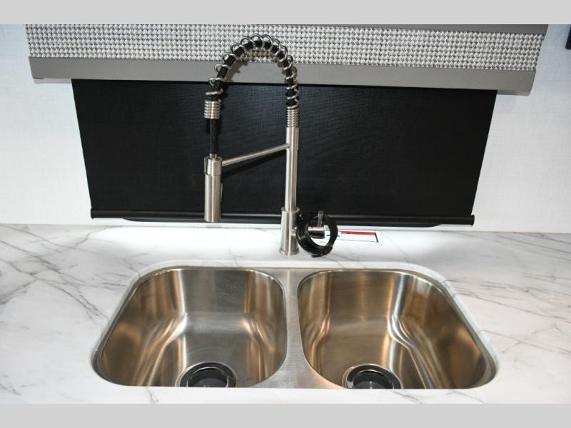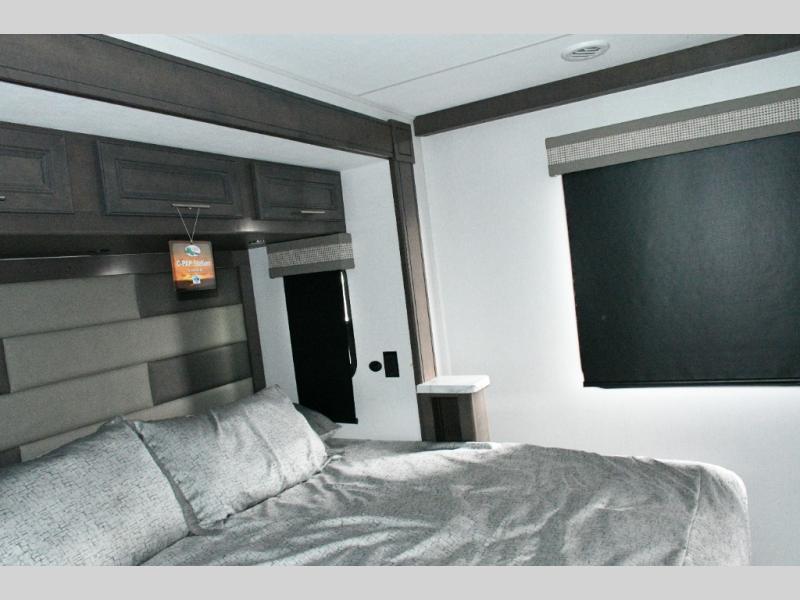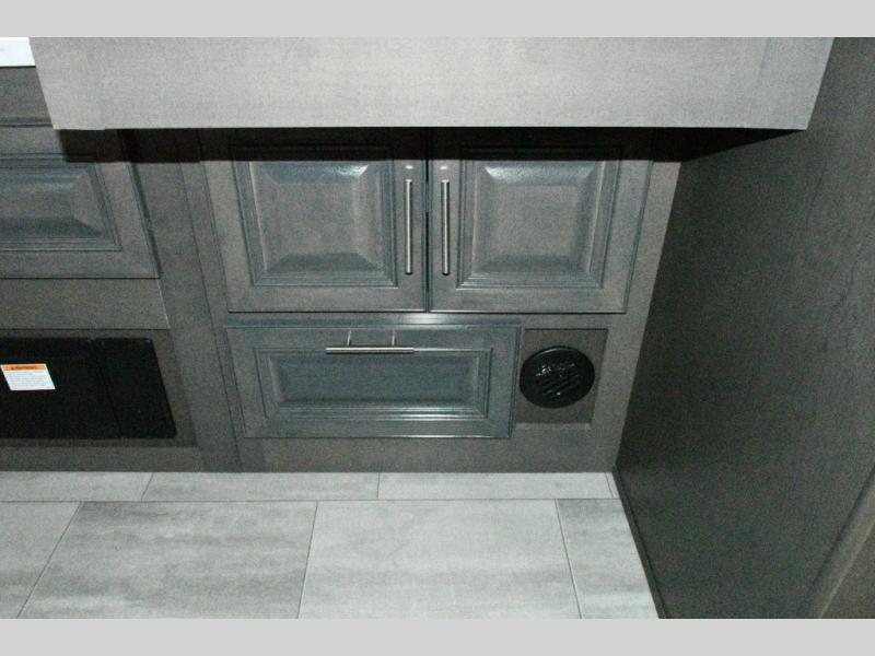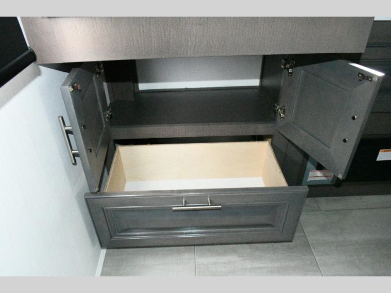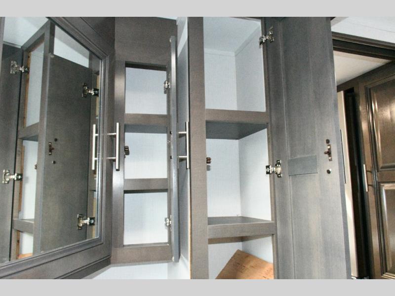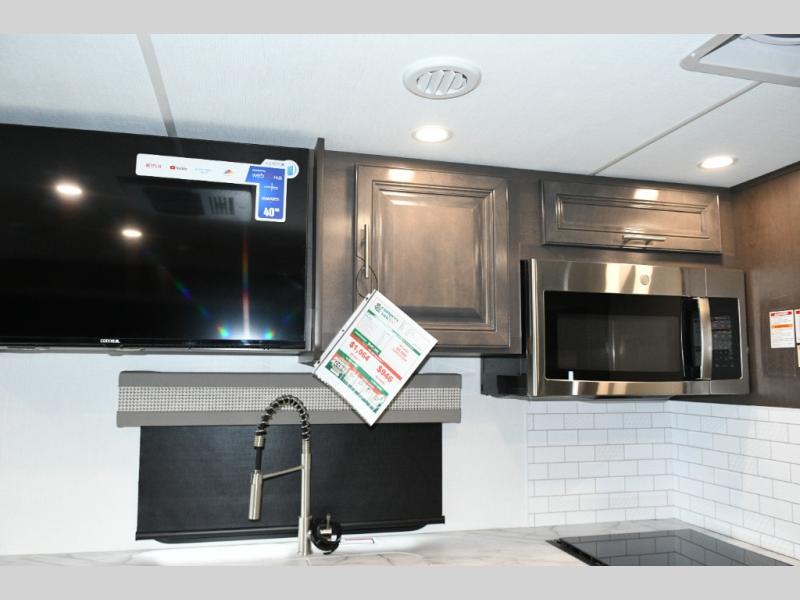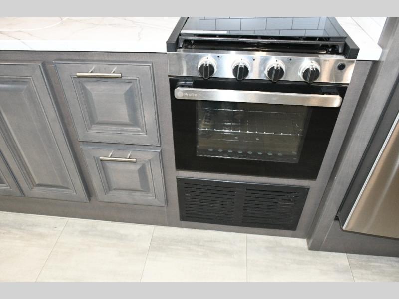 The galley kitchen is equipped for every meal, featuring a three-burner cooktop, large 18 cu. ft. residential refrigerator, microwave, and pantry with shelves. Outside, enjoy entertainment on the exterior system, or take advantage of the solar panel and controller to stay powered while off-grid. The passenger workstation allows you to work or plan your next adventure while on the road.