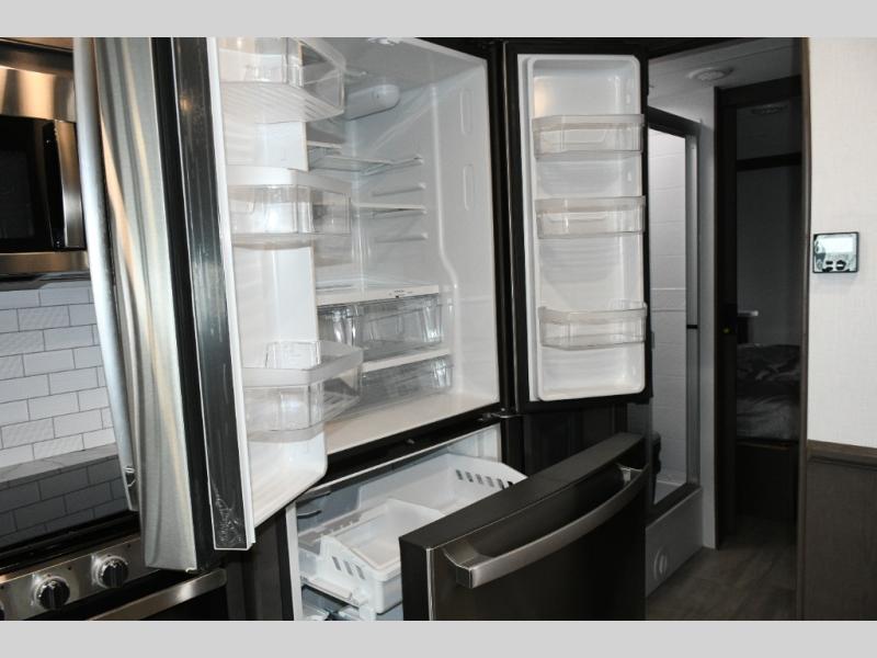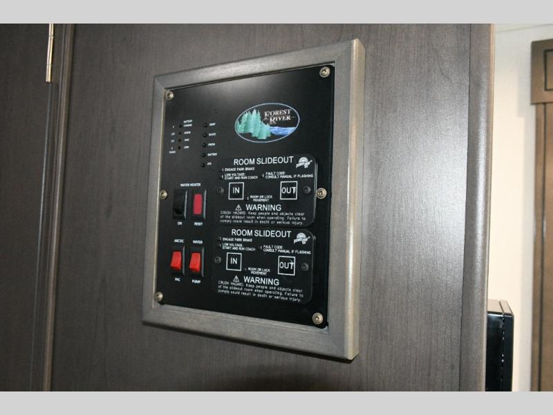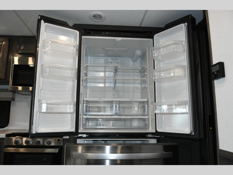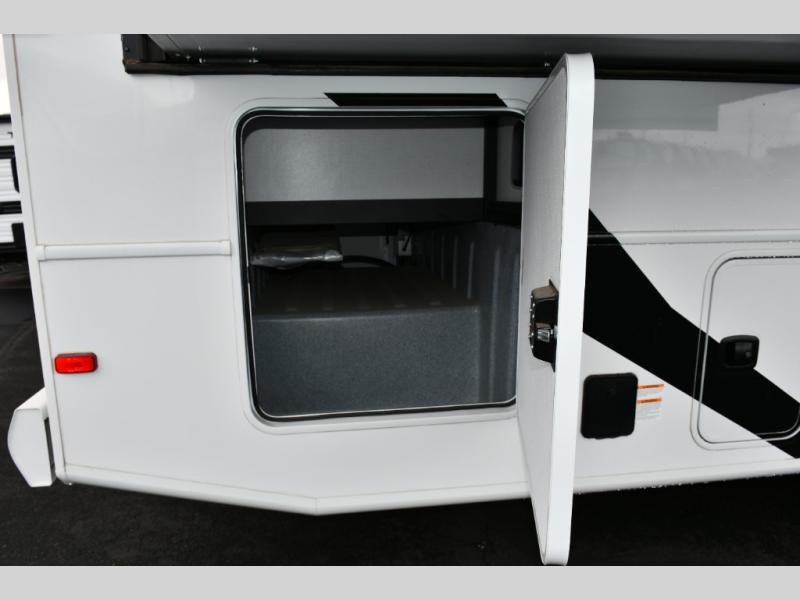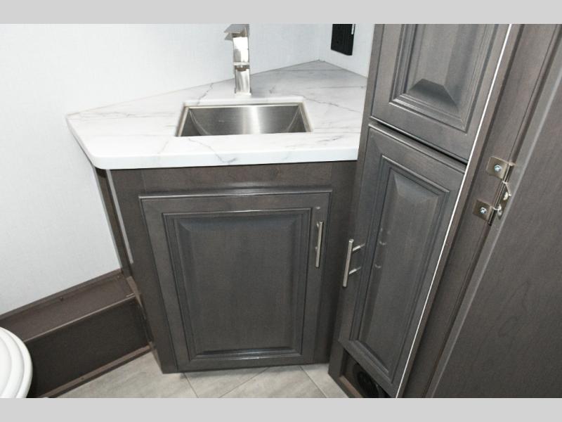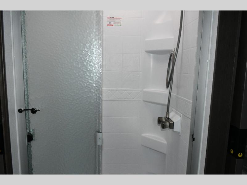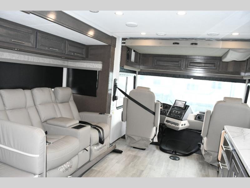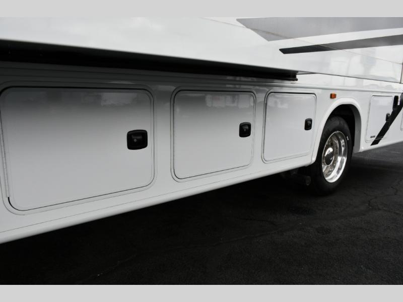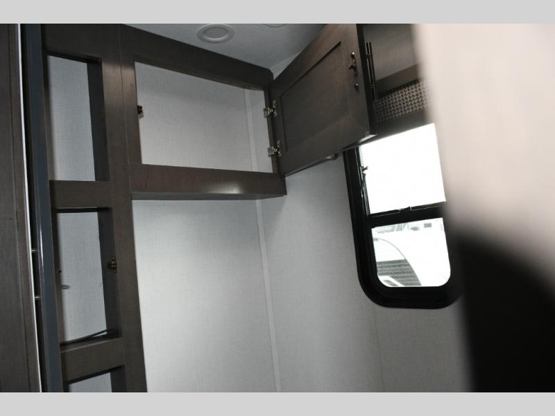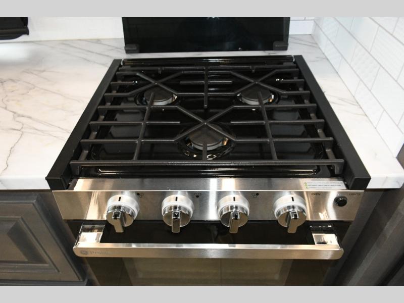 The galley kitchen is equipped for every meal, featuring a three-burner cooktop, large 18 cu. ft. residential refrigerator, microwave, and pantry with shelves. Outside, enjoy entertainment on the exterior system, or take advantage of the solar panel and controller to stay powered while off-grid. The passenger workstation allows you to work or plan your next adventure while on the road.