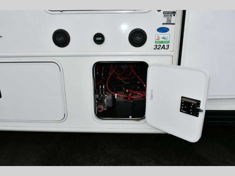Built for durability and road performance, the Georgetown 3 Series features a multi-layer laminated roof with tubular aluminum framing, block foam insulation, and a crowned fiberglass roof. Sidewalls are vacuum-bond laminated with gelcoat fiberglass, tubular aluminum framing, and EGS metal backers to secure cabinetry. The MORryde 1.5 tubular steel chassis and hydraulic 4-point leveling system provide a smooth and level setup wherever you camp. Stay connected with the 360 Plus Winegard WiFi system and enjoy high-quality sound through the Sony 10" entertainment system.