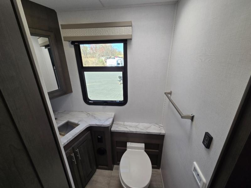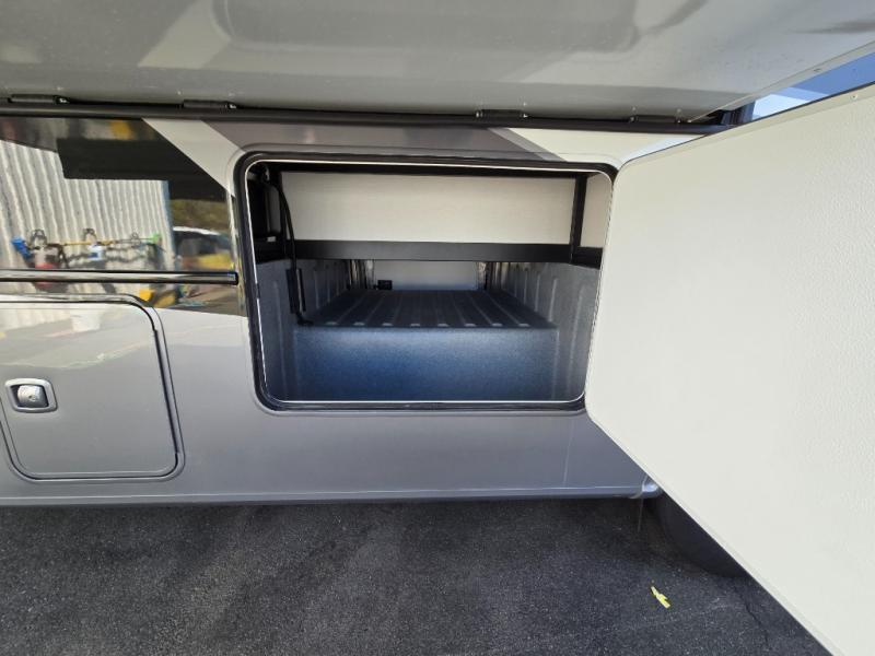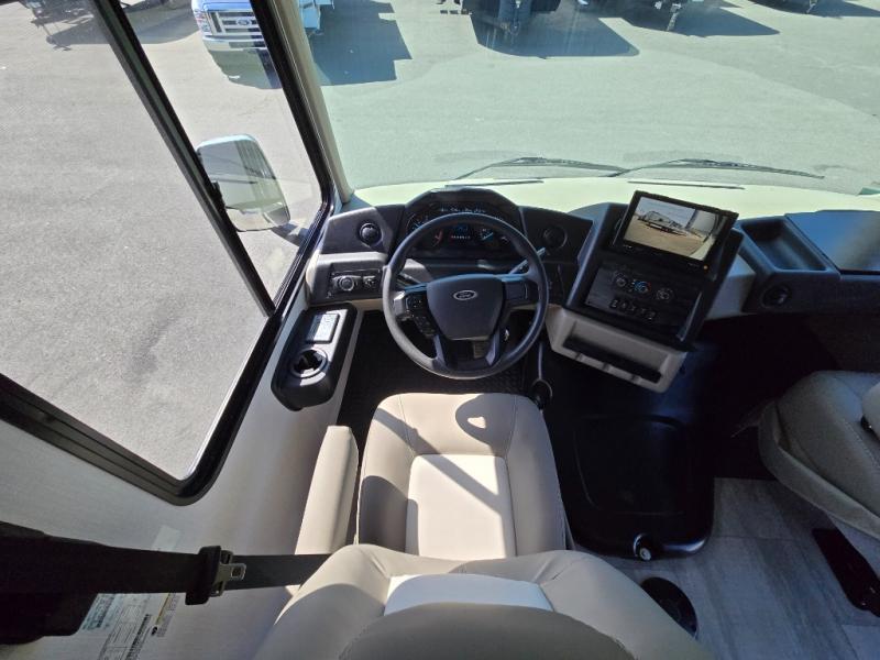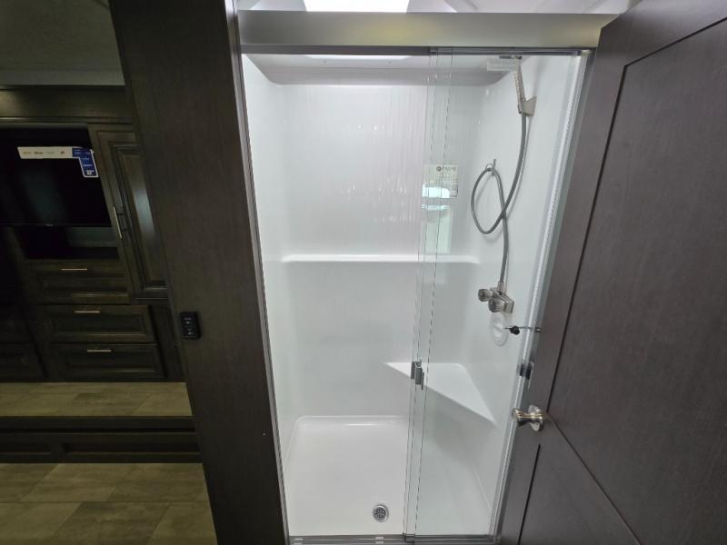 You won't believe all that the rear private bedroom has to offer in this motorhome! It features a 72" x 80" king bed slide with overhead cabinets, a dresser with a 32" TV and overhead cabinets, wardrobes on either side of the dresser, and a desk with wardrobes on either. And one of the wardrobes features an optional stacked washer and dryer for convenience! The split-style bathroom makes it easy for one person to freshen up in the shower with a seat while another uses the private toilet and sink. After a long day of traveling, you can relax on either the Thomas Payne theater seating with heat and massage across from the 5,000 BTU fireplace with a 40" LED TV above it or play a game and eat a meal at the Dream Dinette. There is also a power front overhead bunk for more sleeping space!