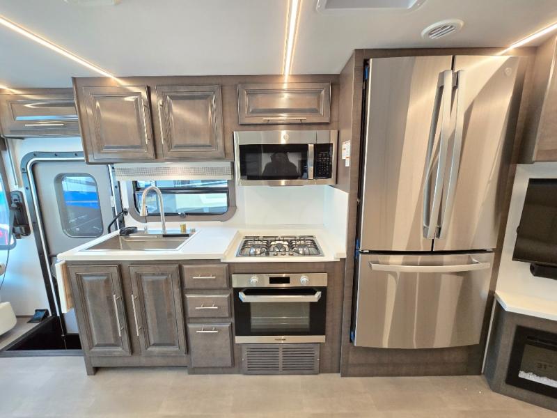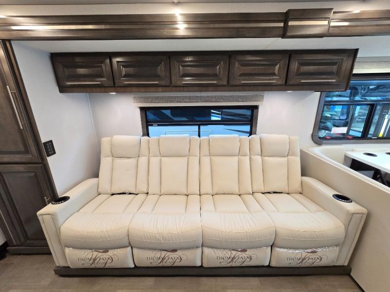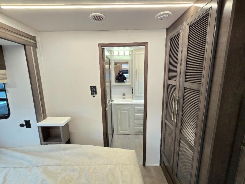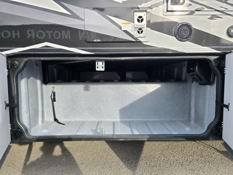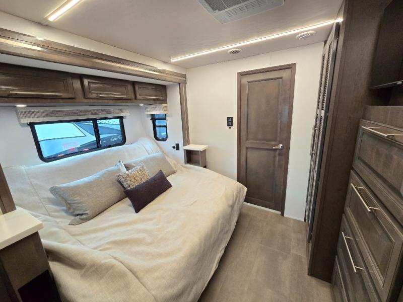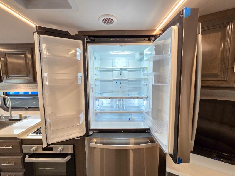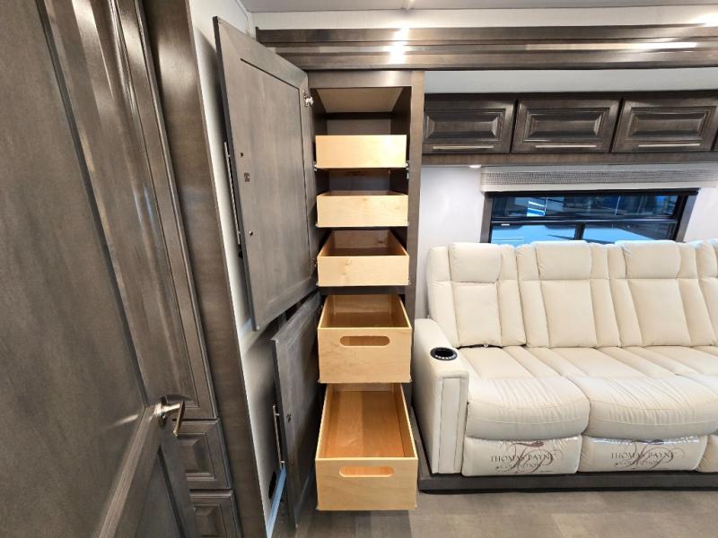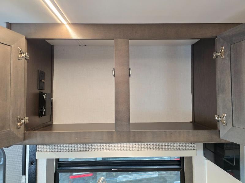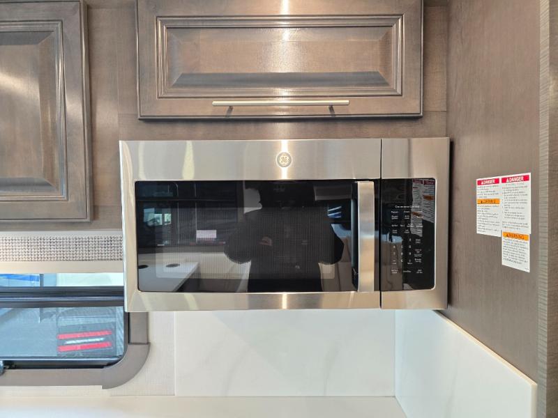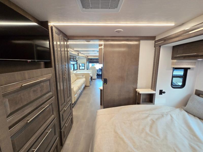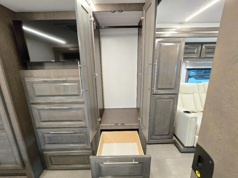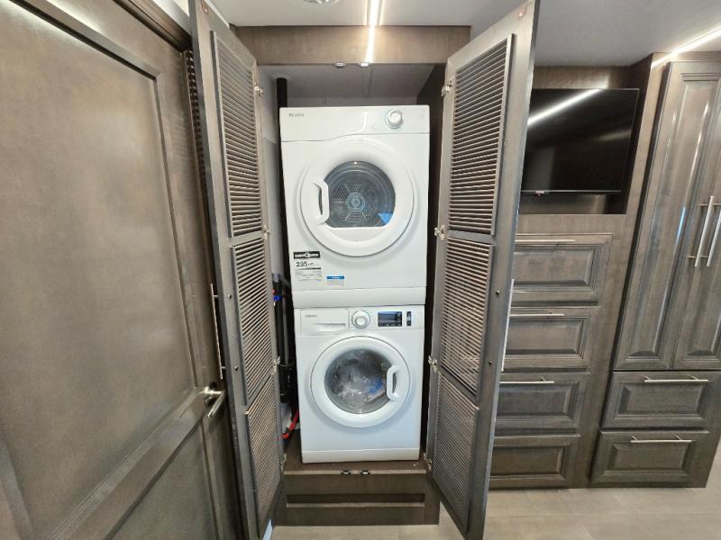 Comfort and convenience is found all throughout this motorhome! Starting with the full rear master bath that has a shower with a seat and a dual sink vanity, plus it leads into the private bedroom. Inside the bedroom is a 72" x 80" Power Tilt king bed slide with overhead cabinets across from a dresser with overhead cabinets and a 32" LED TV, a wardrobe, and another wardrobe that is prepped to add an optional stackable washer and dryer. The half bathroom is conveniently near the fully equipped kitchen so you can get back to creating your best home cooked meals fast. Relax in true comfort each night by either playing games at the booth dinette or on the theater seating that comes with power recline, heat, and massage!