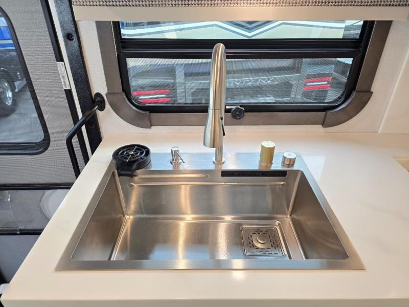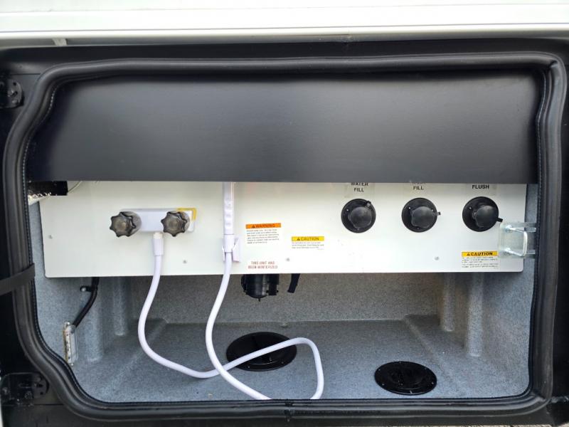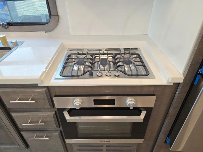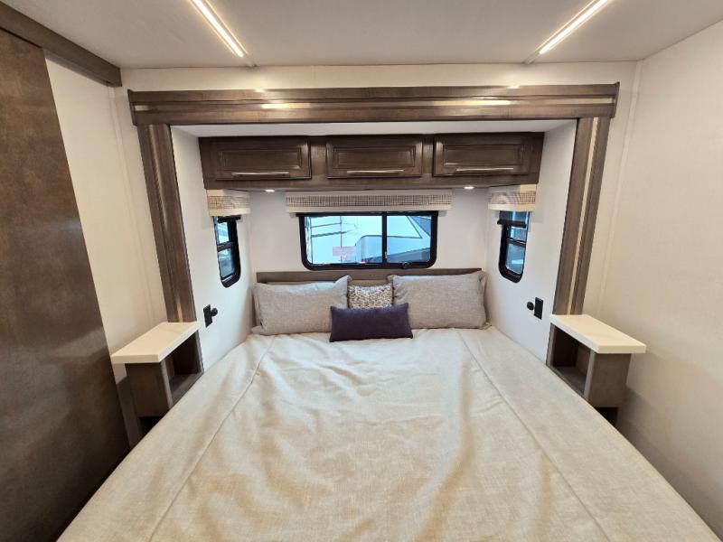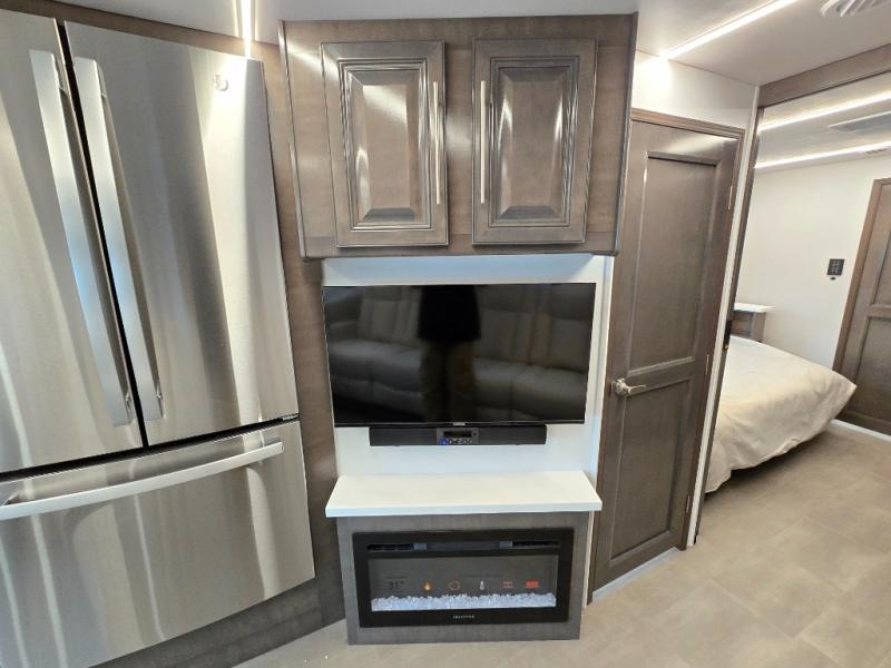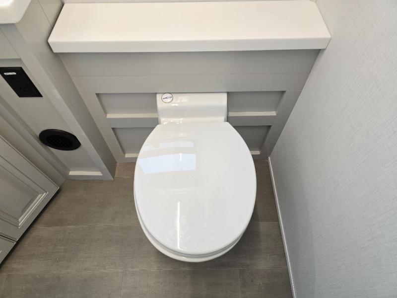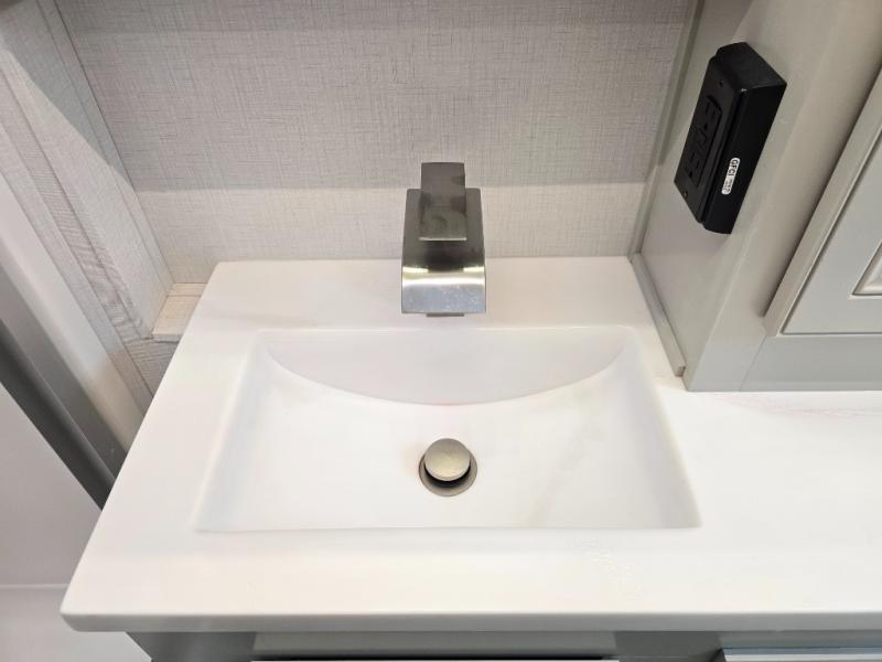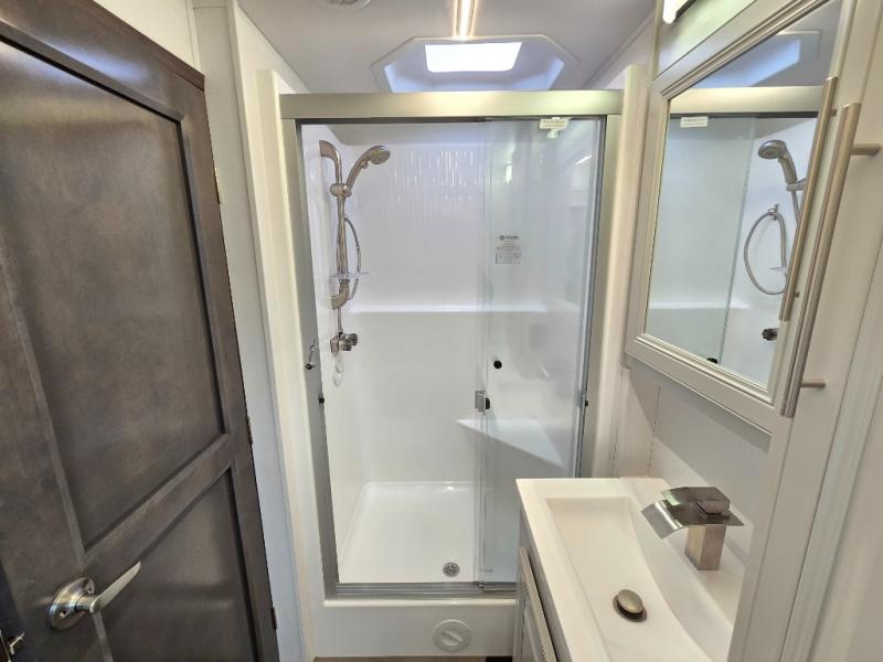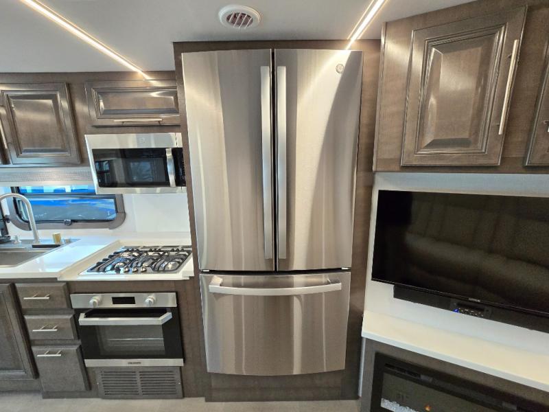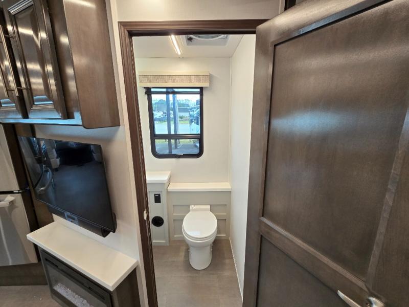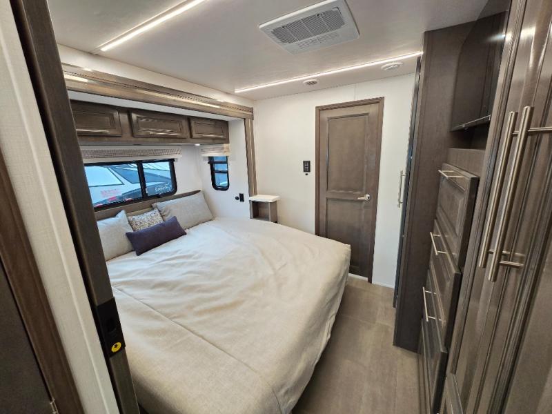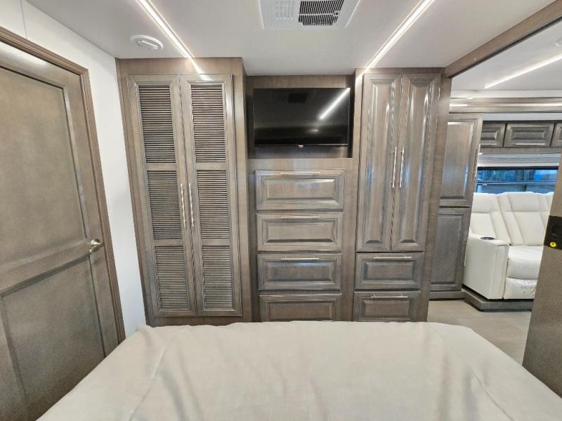 Comfort and convenience is found all throughout this motorhome! Starting with the full rear master bath that has a shower with a seat and a dual sink vanity, plus it leads into the private bedroom. Inside the bedroom is a 72" x 80" Power Tilt king bed slide with overhead cabinets across from a dresser with overhead cabinets and a 32" LED TV, a wardrobe, and another wardrobe that is prepped to add an optional stackable washer and dryer. The half bathroom is conveniently near the fully equipped kitchen so you can get back to creating your best home cooked meals fast. Relax in true comfort each night by either playing games at the booth dinette or on the theater seating that comes with power recline, heat, and massage!