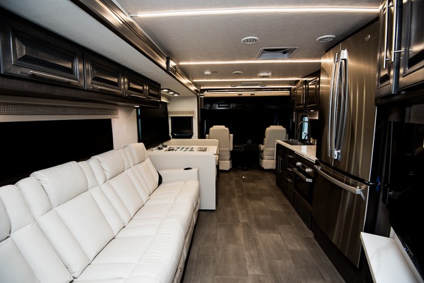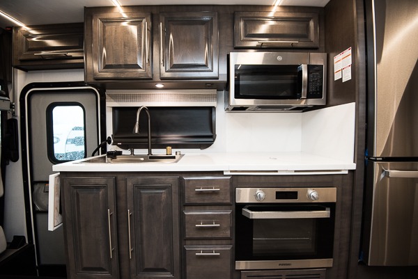 Comfort and convenience is found all throughout this motorhome! Starting with the full rear master bath that has a shower with a seat and a dual sink vanity, plus it leads into the private bedroom. Inside the bedroom is a 72" x 80" Power Tilt king bed slide with overhead cabinets across from a dresser with overhead cabinets and a 32" LED TV, a wardrobe, and another wardrobe that is prepped to add an optional stackable washer and dryer. The half bathroom is conveniently near the fully equipped kitchen so you can get back to creating your best home cooked meals fast. Relax in true comfort each night by either playing games at the booth dinette or on the theater seating that comes with power recline, heat, and massage!