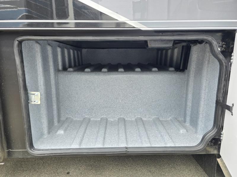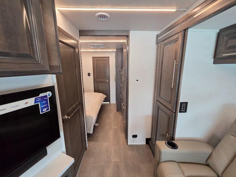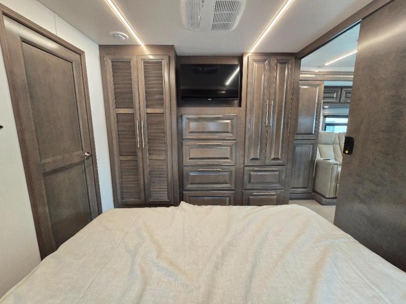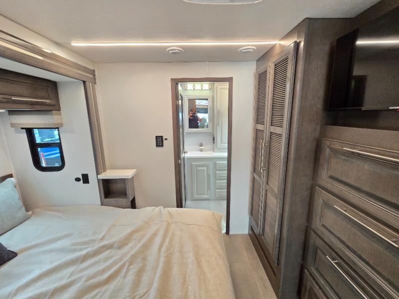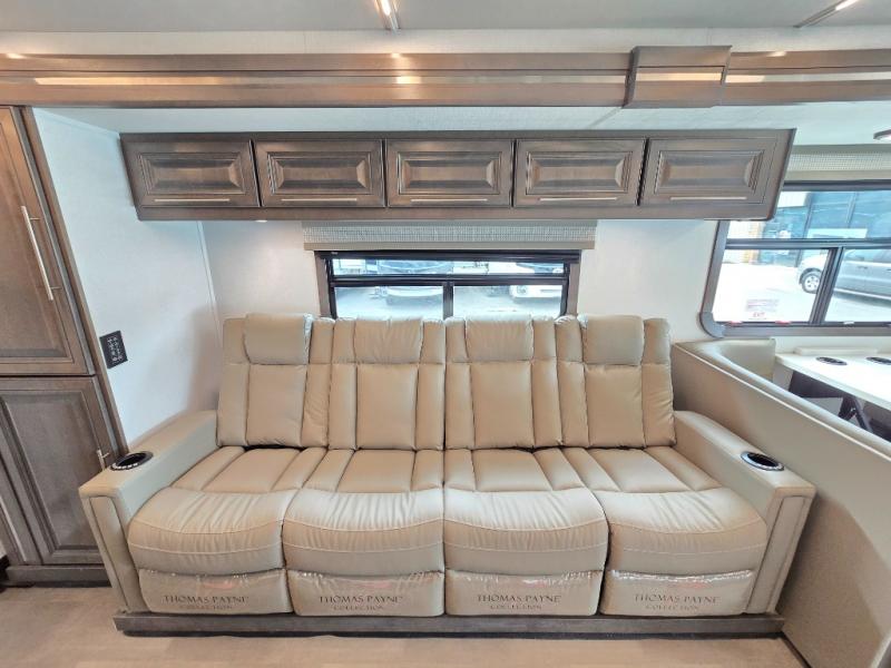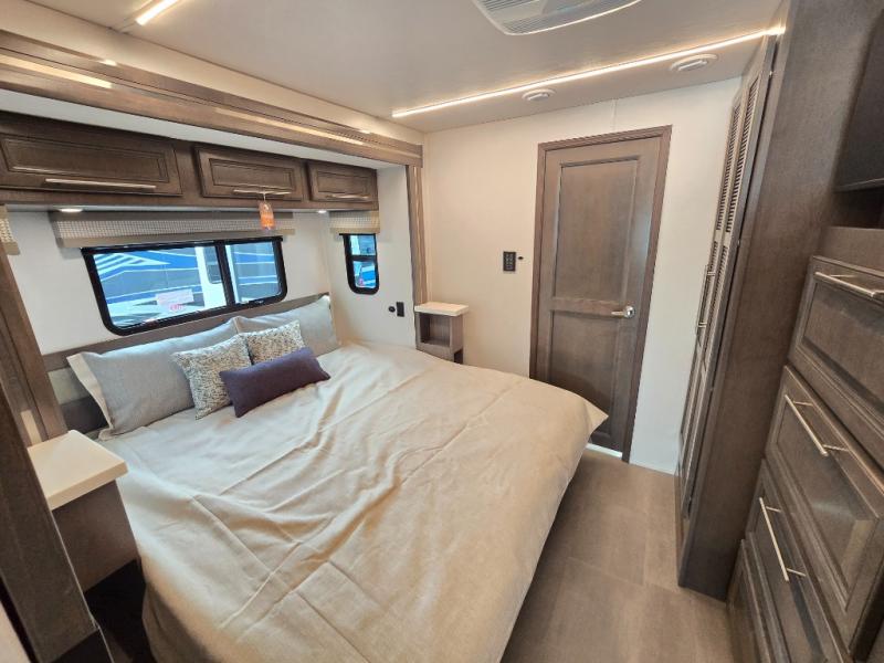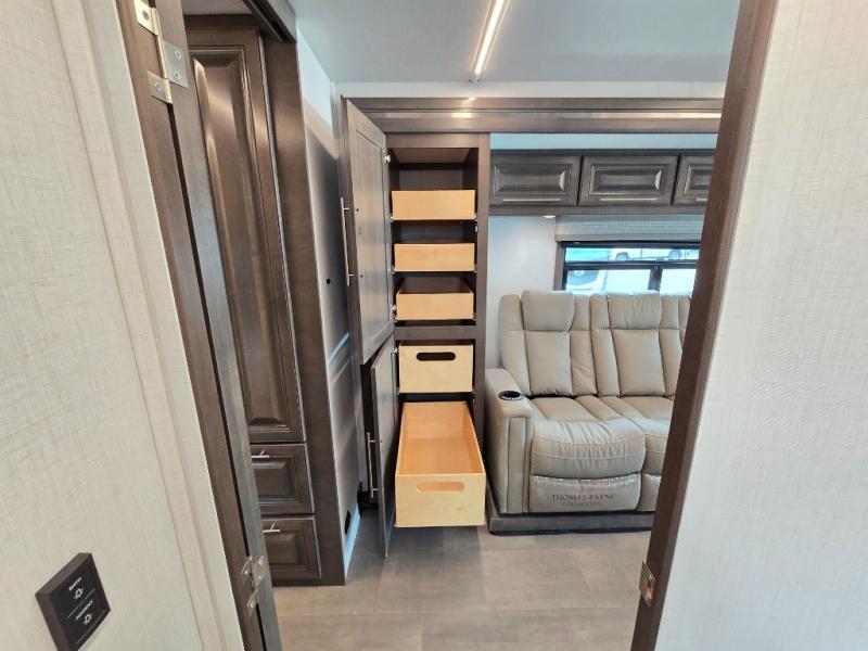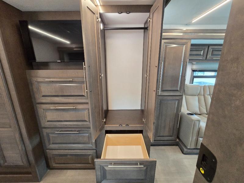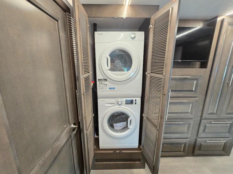 Comfort and convenience is found all throughout this motorhome! Starting with the full rear master bath that has a shower with a seat and a dual sink vanity, plus it leads into the private bedroom. Inside the bedroom is a 72" x 80" Power Tilt king bed slide with overhead cabinets across from a dresser with overhead cabinets and a 32" LED TV, a wardrobe, and another wardrobe that is prepped to add an optional stackable washer and dryer. The half bathroom is conveniently near the fully equipped kitchen so you can get back to creating your best home cooked meals fast. Relax in true comfort each night by either playing games at the booth dinette or on the theater seating that comes with power recline, heat, and massage!