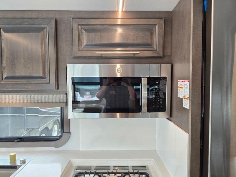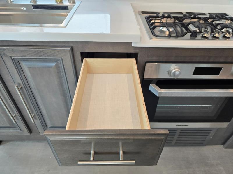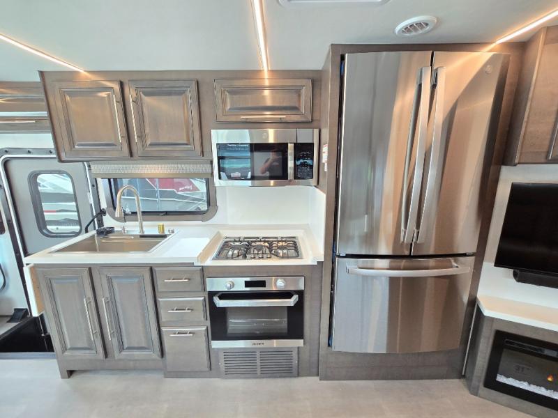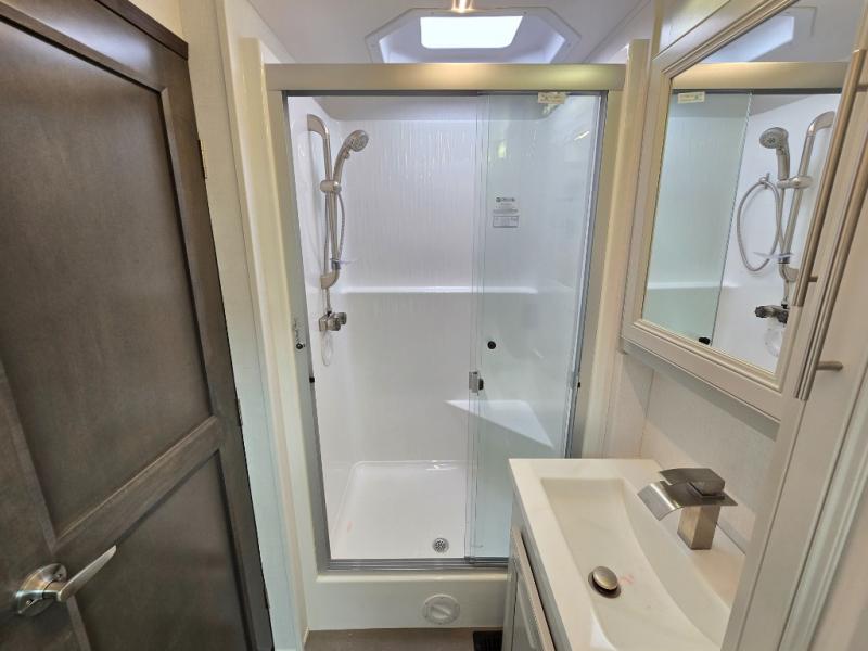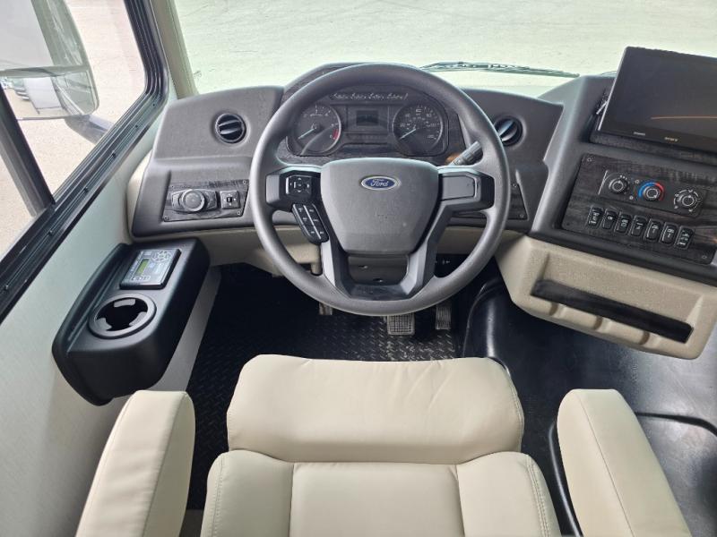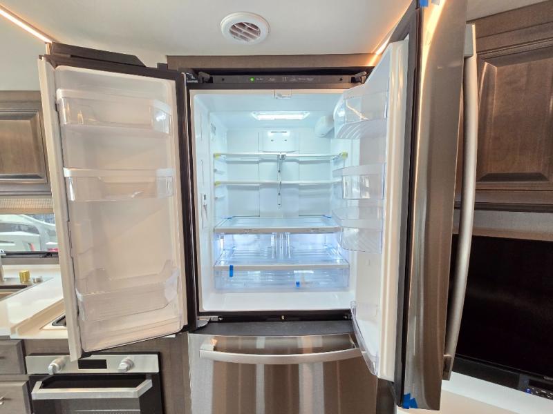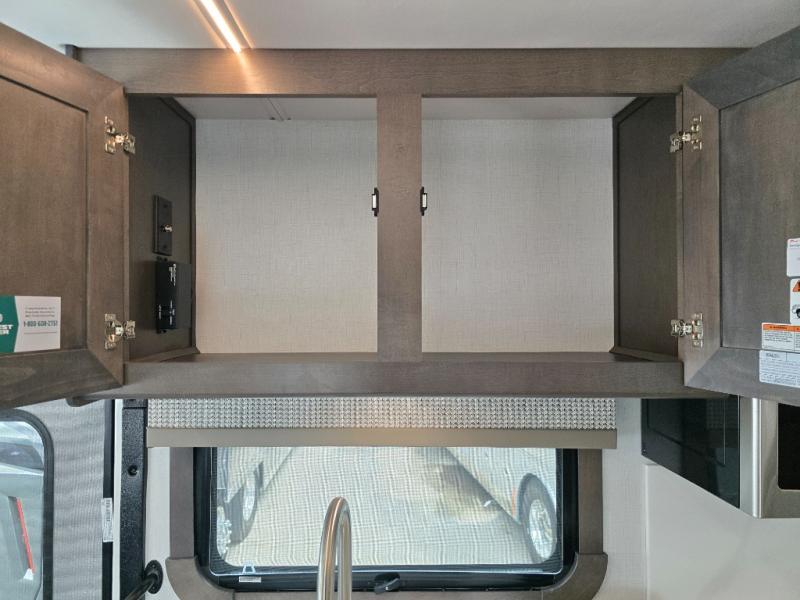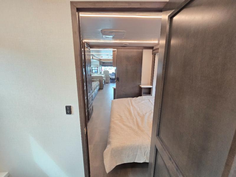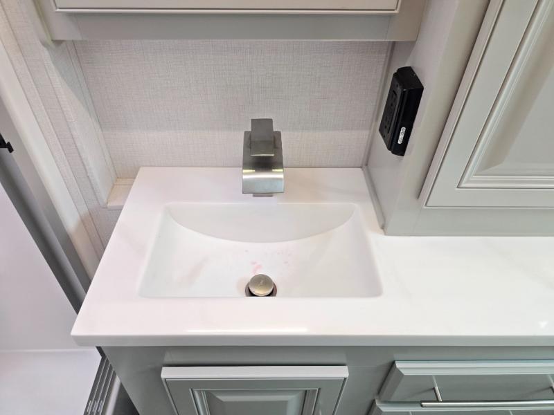 Comfort and convenience is found all throughout this motorhome! Starting with the full rear master bath that has a shower with a seat and a dual sink vanity, plus it leads into the private bedroom. Inside the bedroom is a 72" x 80" Power Tilt king bed slide with overhead cabinets across from a dresser with overhead cabinets and a 32" LED TV, a wardrobe, and another wardrobe that is prepped to add an optional stackable washer and dryer. The half bathroom is conveniently near the fully equipped kitchen so you can get back to creating your best home cooked meals fast. Relax in true comfort each night by either playing games at the booth dinette or on the theater seating that comes with power recline, heat, and massage!