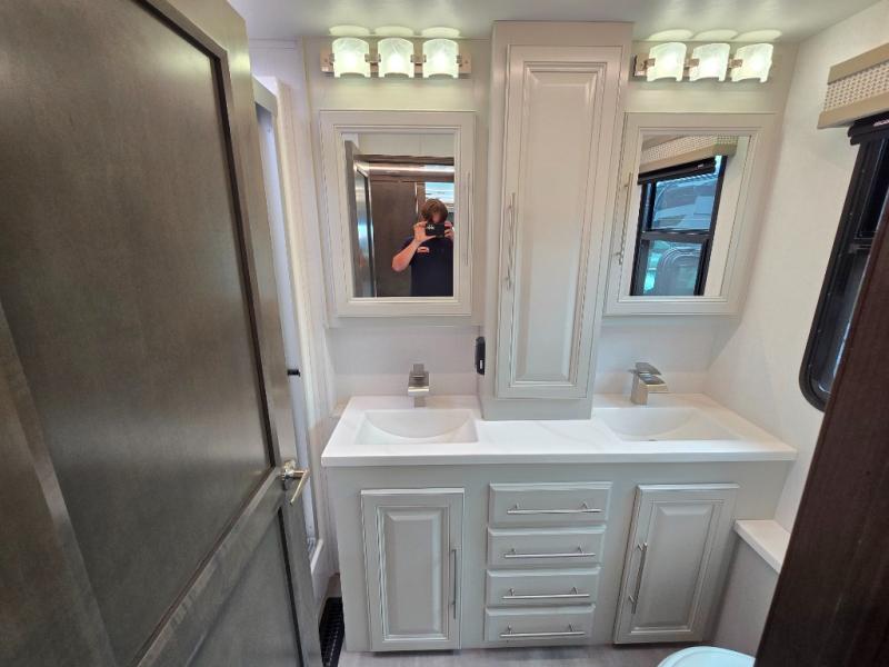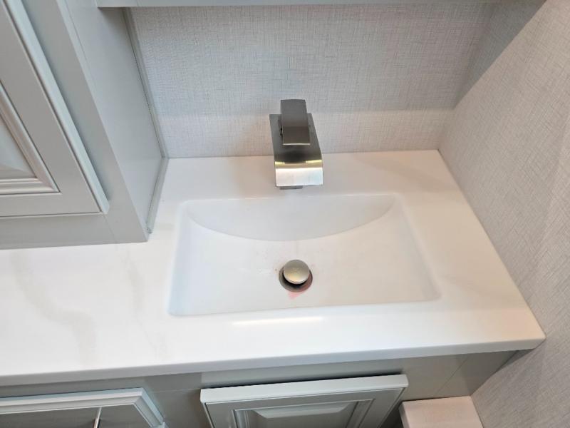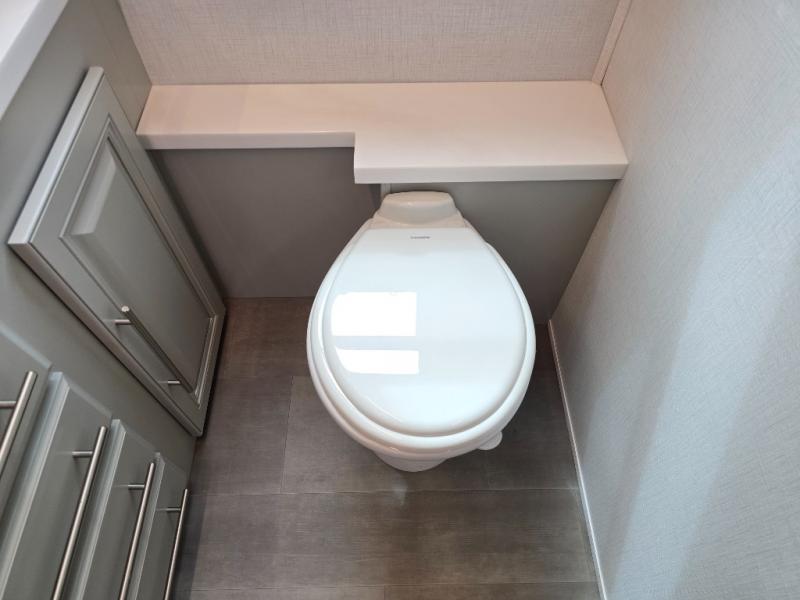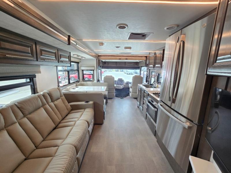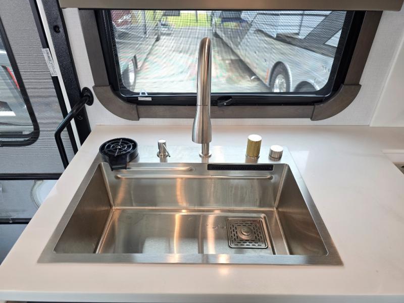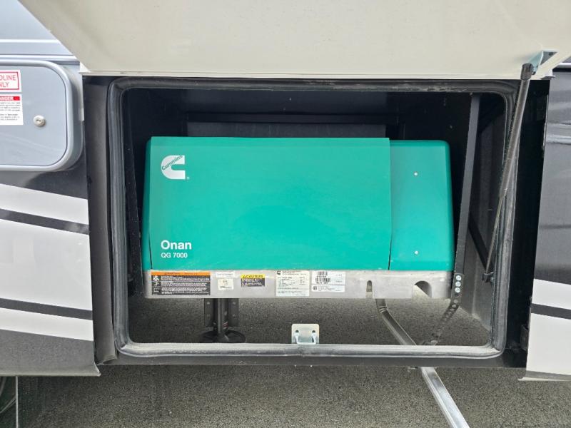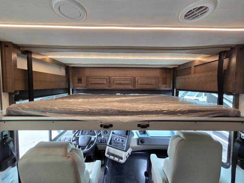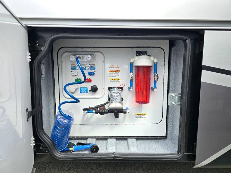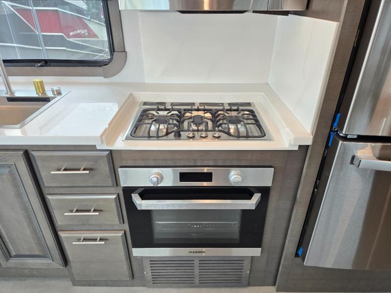 Comfort and convenience is found all throughout this motorhome! Starting with the full rear master bath that has a shower with a seat and a dual sink vanity, plus it leads into the private bedroom. Inside the bedroom is a 72" x 80" Power Tilt king bed slide with overhead cabinets across from a dresser with overhead cabinets and a 32" LED TV, a wardrobe, and another wardrobe that is prepped to add an optional stackable washer and dryer. The half bathroom is conveniently near the fully equipped kitchen so you can get back to creating your best home cooked meals fast. Relax in true comfort each night by either playing games at the booth dinette or on the theater seating that comes with power recline, heat, and massage!