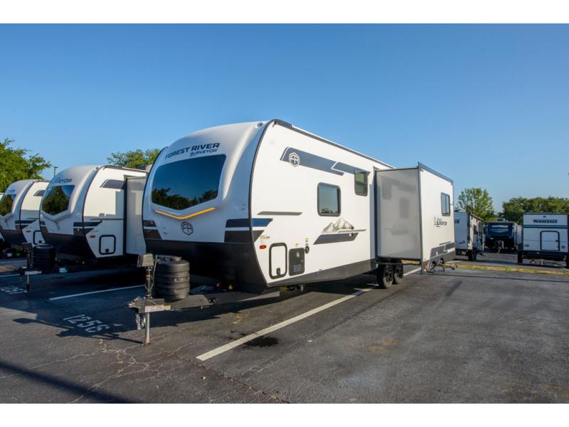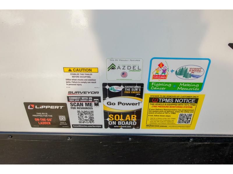 With any Grand Surveyor travel trailer by Forest River you will enjoy turn-key ready-to-go features and quality construction! Each model includes Azdel composite walls and a gel coated fiberglass front cap with an automotive style tinted windshield for a sleek look. There are friction hinge black glass entry door(s), an adjustable platform step with a night light, plus Goodyear tires and a power tongue jack for easy towing. The interior will have you feeling right at home with roller shades, residential faucets, sinks, and bathroom vanity, plus Surf(x) seamless countertops throughout. You can also plan for adventure with a 2" rear accessory and exterior spray port, and there are slam latch exterior baggage doors throughout to keep all your gear secure. Other stand-out features include a central vacuum system, a 200 watt solar panel with a 30 amp controller, a tankless water heater, carpet-free interiors, and the list goes on!